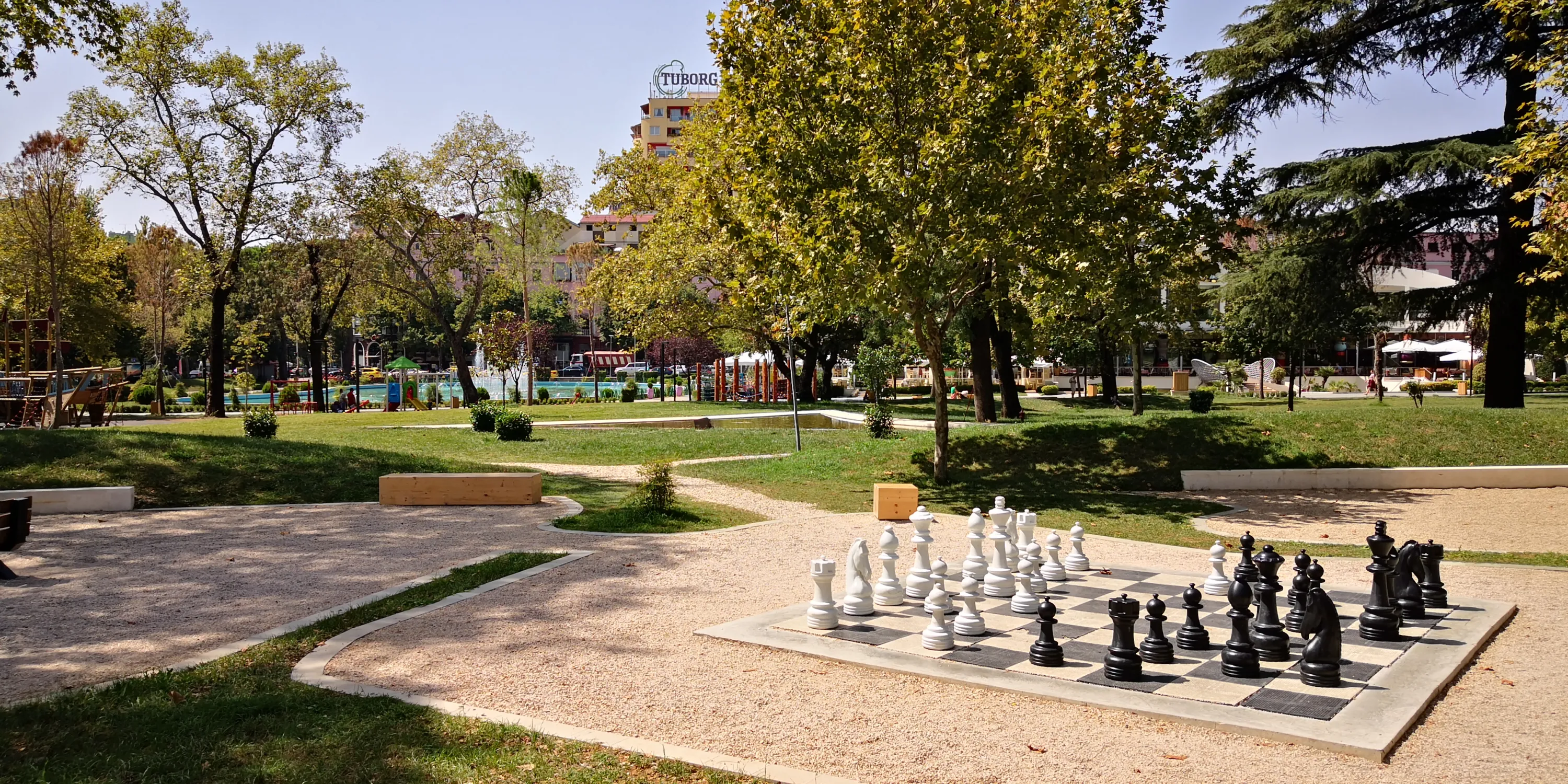 Пройдемо трохи вперед і побачимо невеликий парк з фонтаном та величезними шахами: