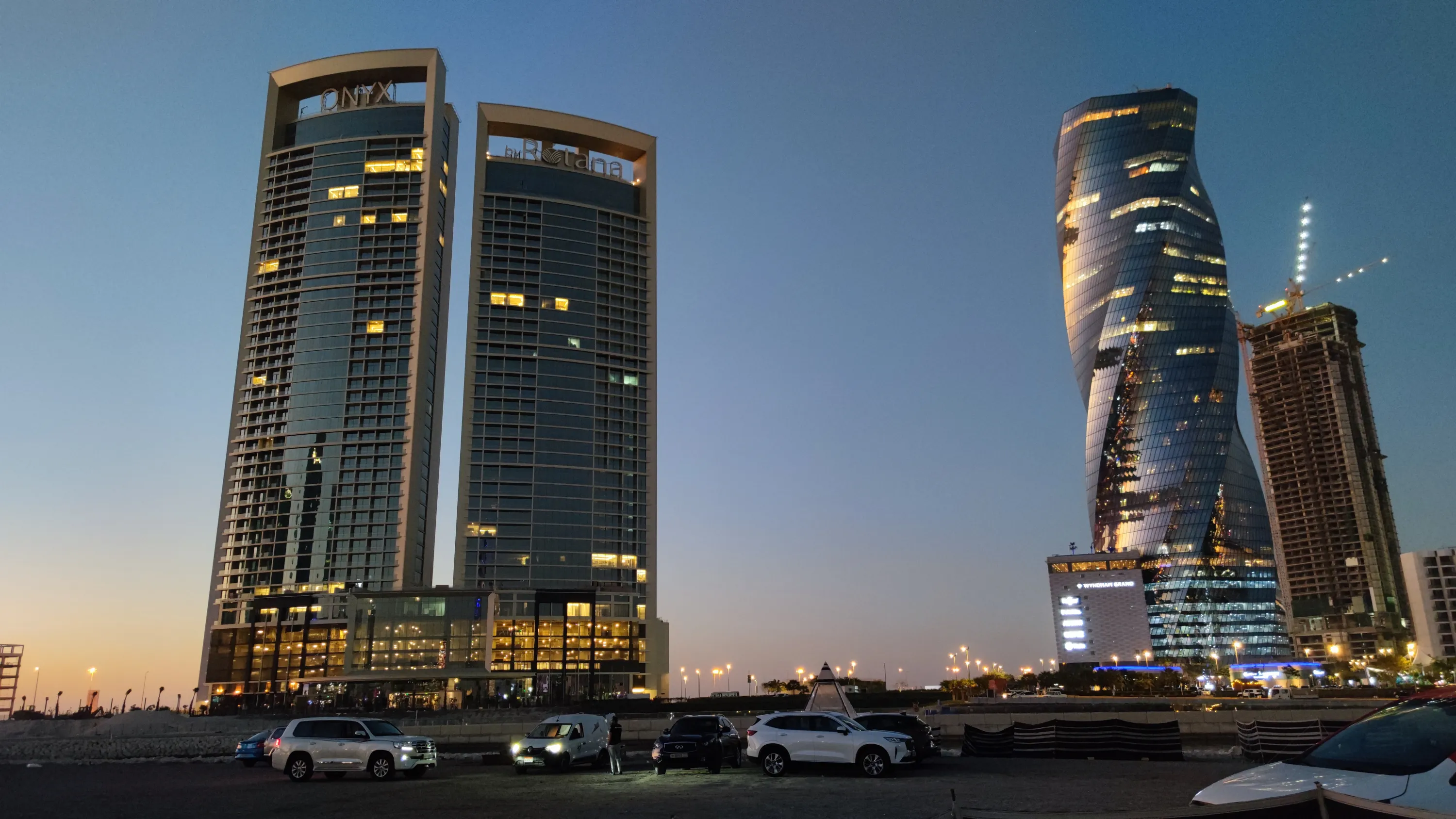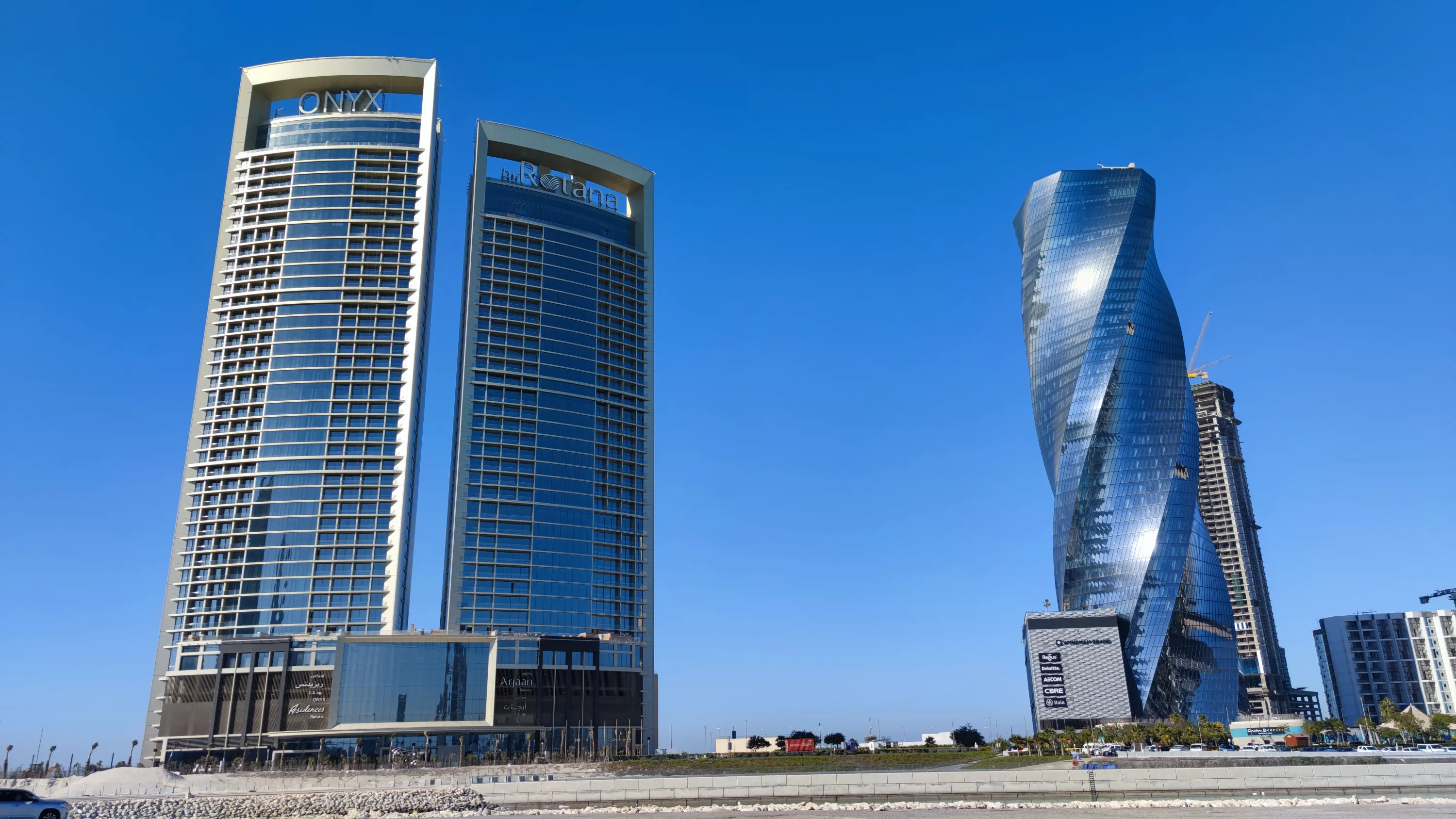На одному з островів (тому, що зліва), знаходиться готель Onyx, що належить саудівській мережі готелів Rotana, та “закручений” хмарочос United Tower: