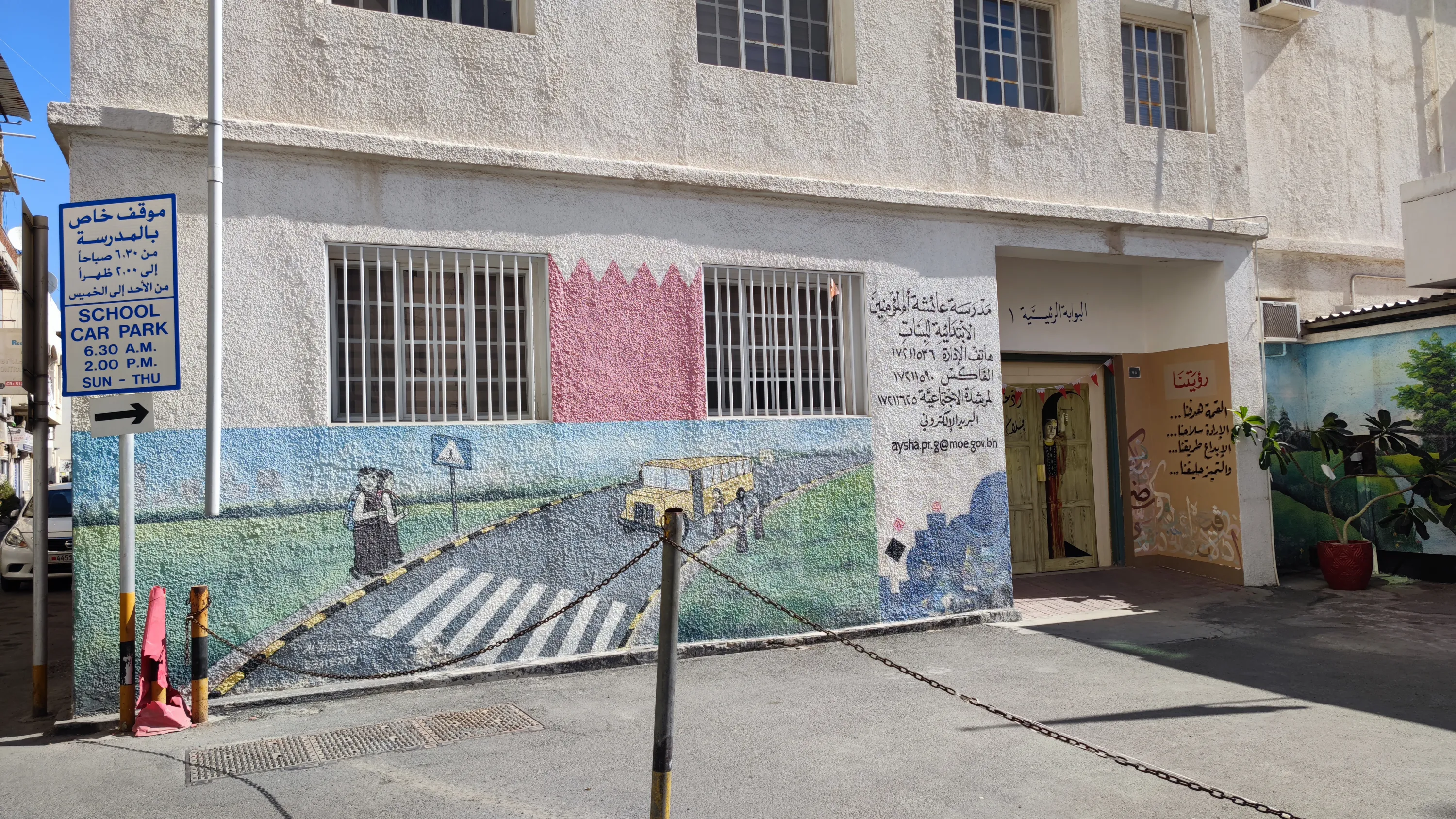 Мурал на фасаді жіночої школи. Так, не дивлячись на відносну прогресивність Бахрейну, тут хлопці та дівчата досі навчаються окремо в школах. Але у вищих навчальних закладах такої сегрегації вже немає: