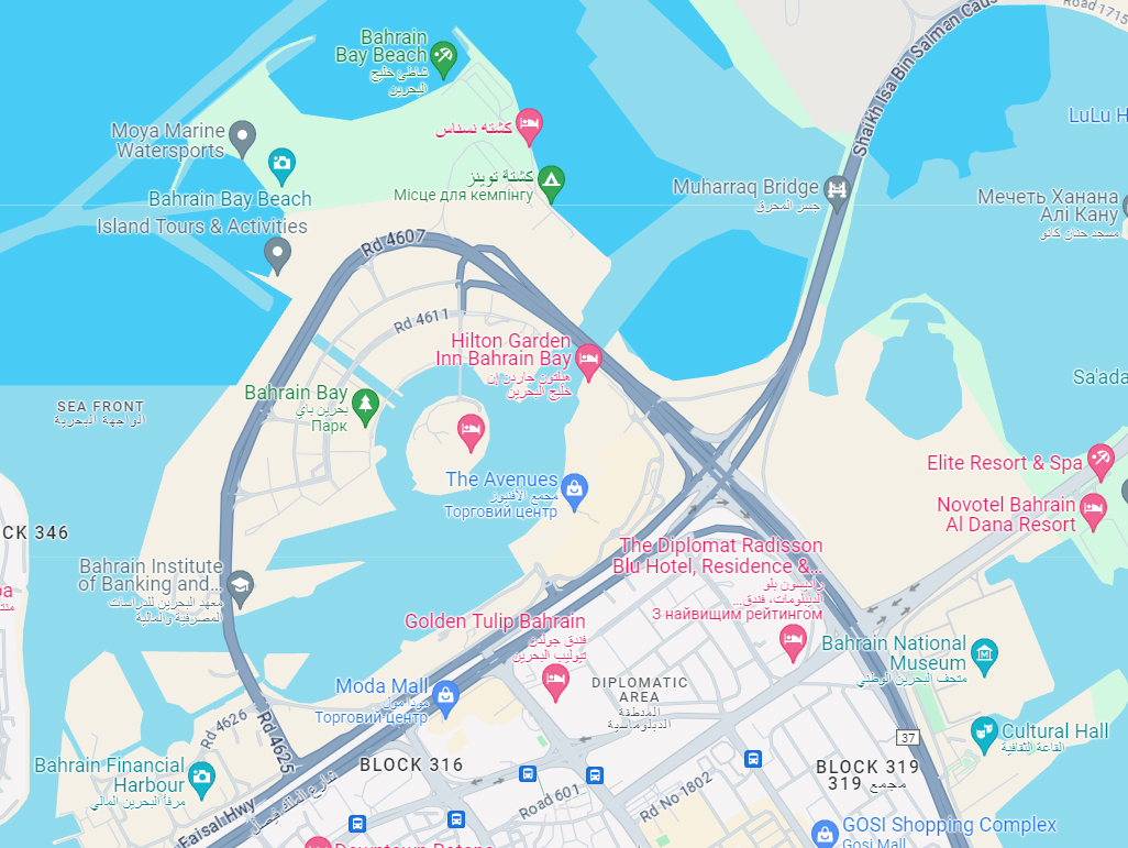 Неподалік звідти знаходиться комплекс Bahrain Bay — житловий, комерційний та рекреаційний район, розташований на трьох штучних островах: