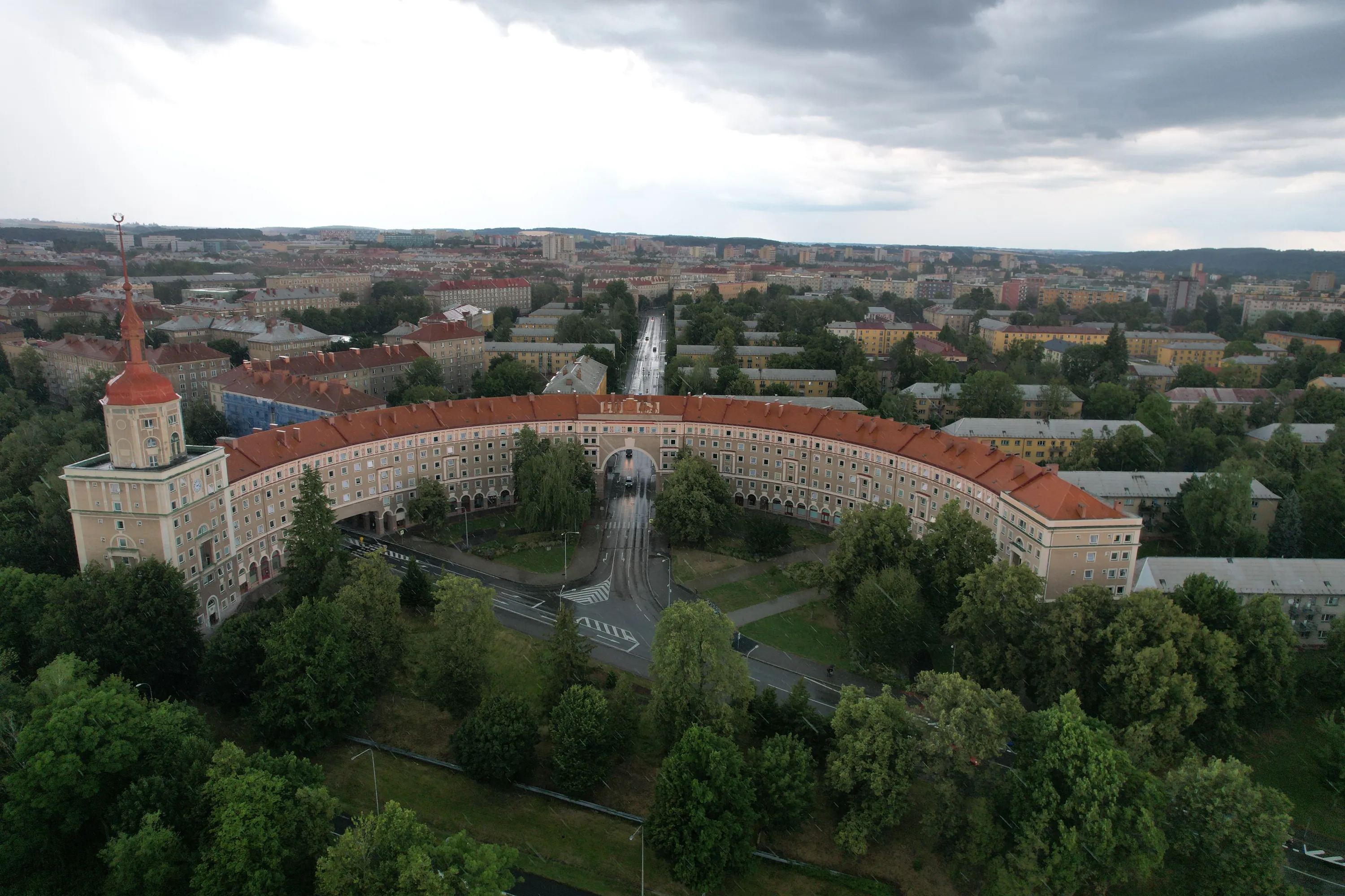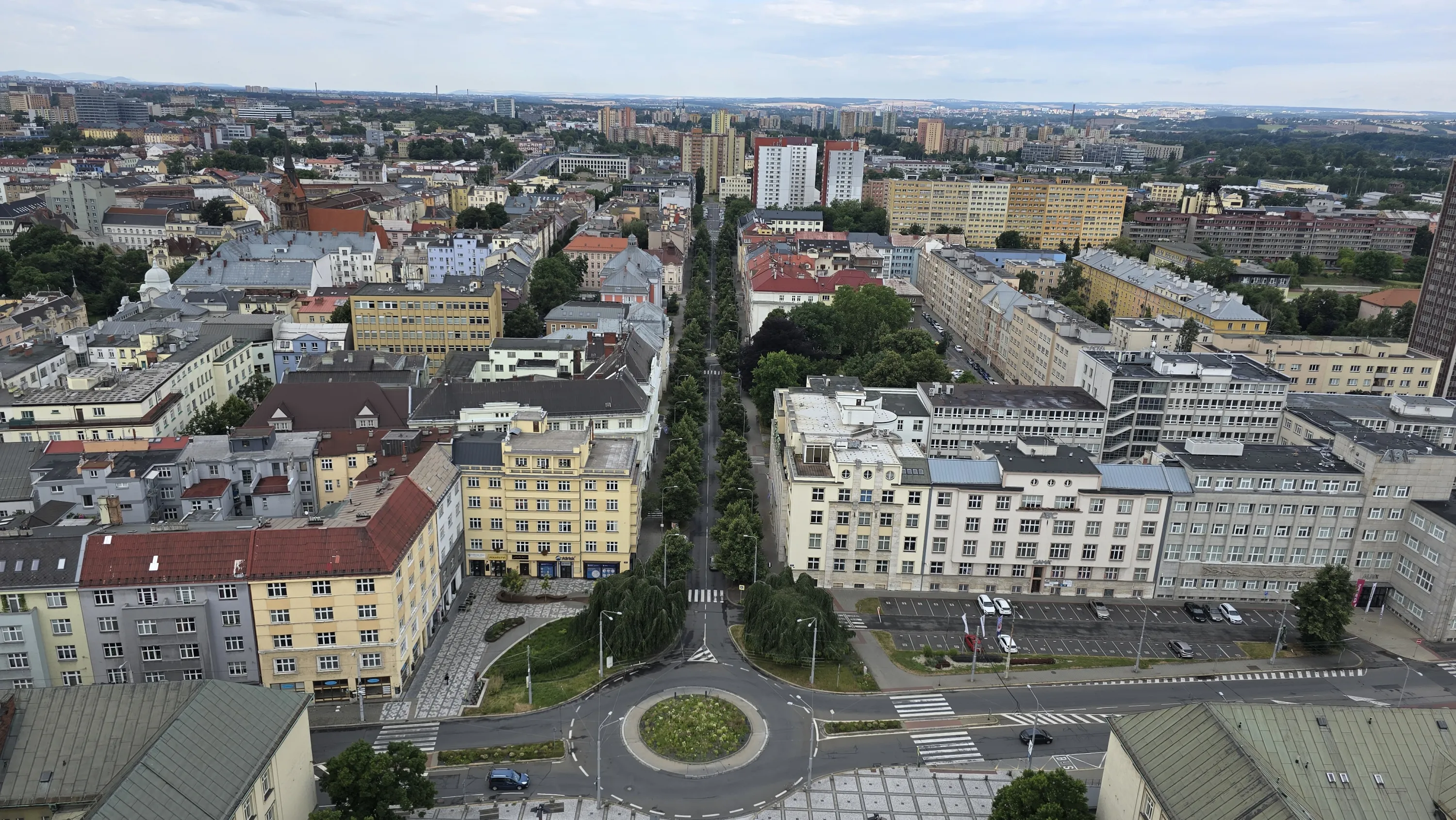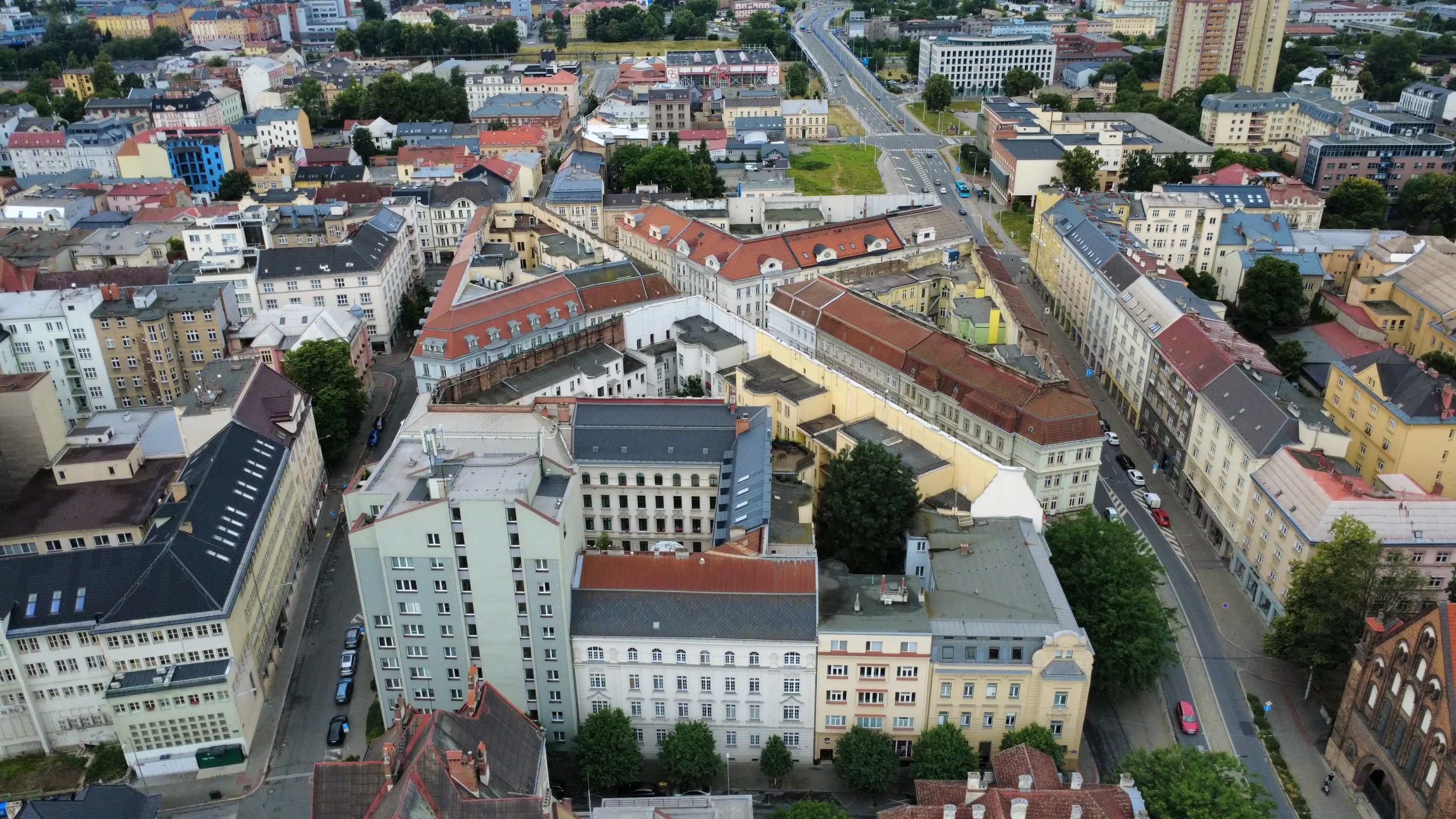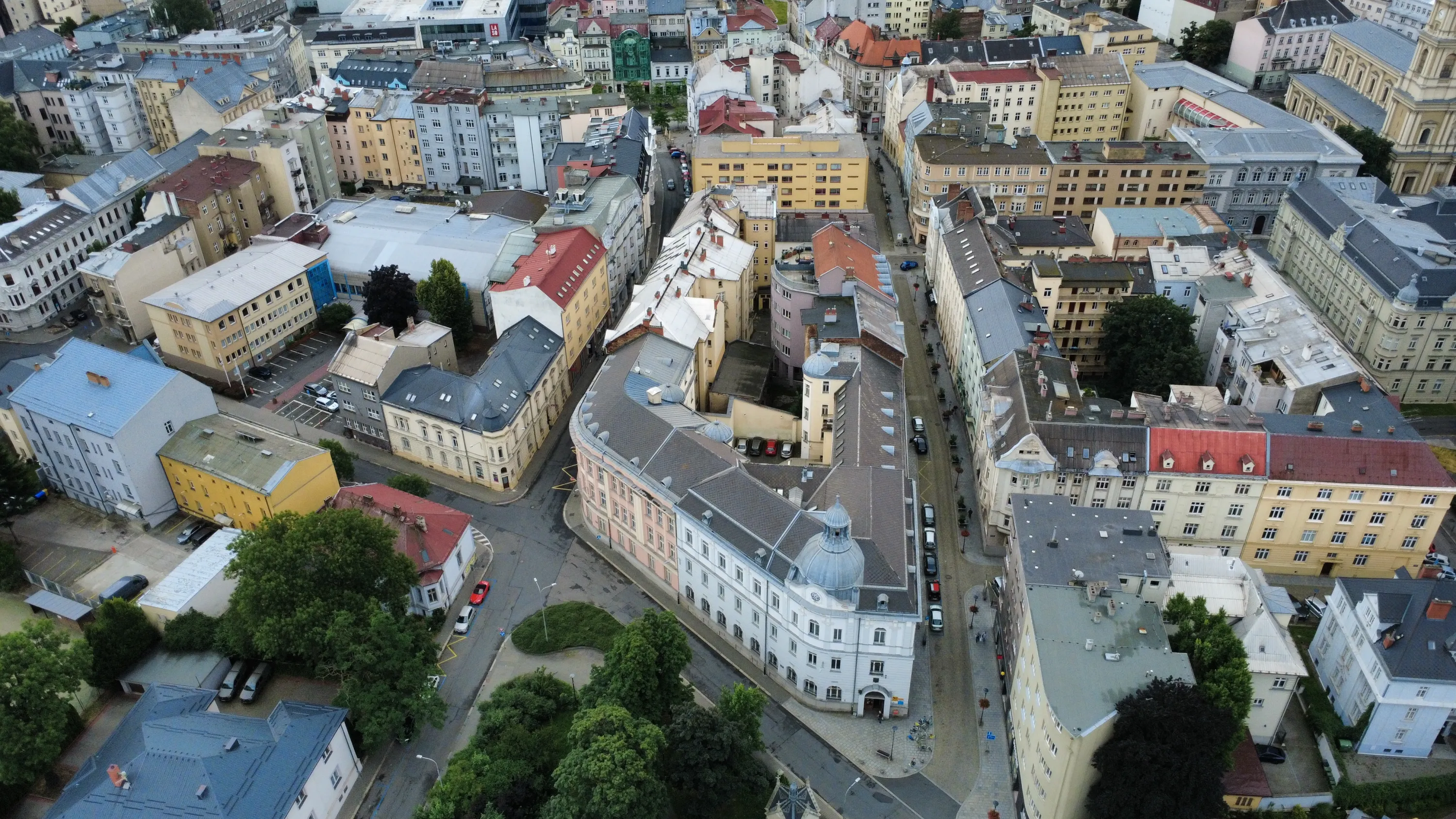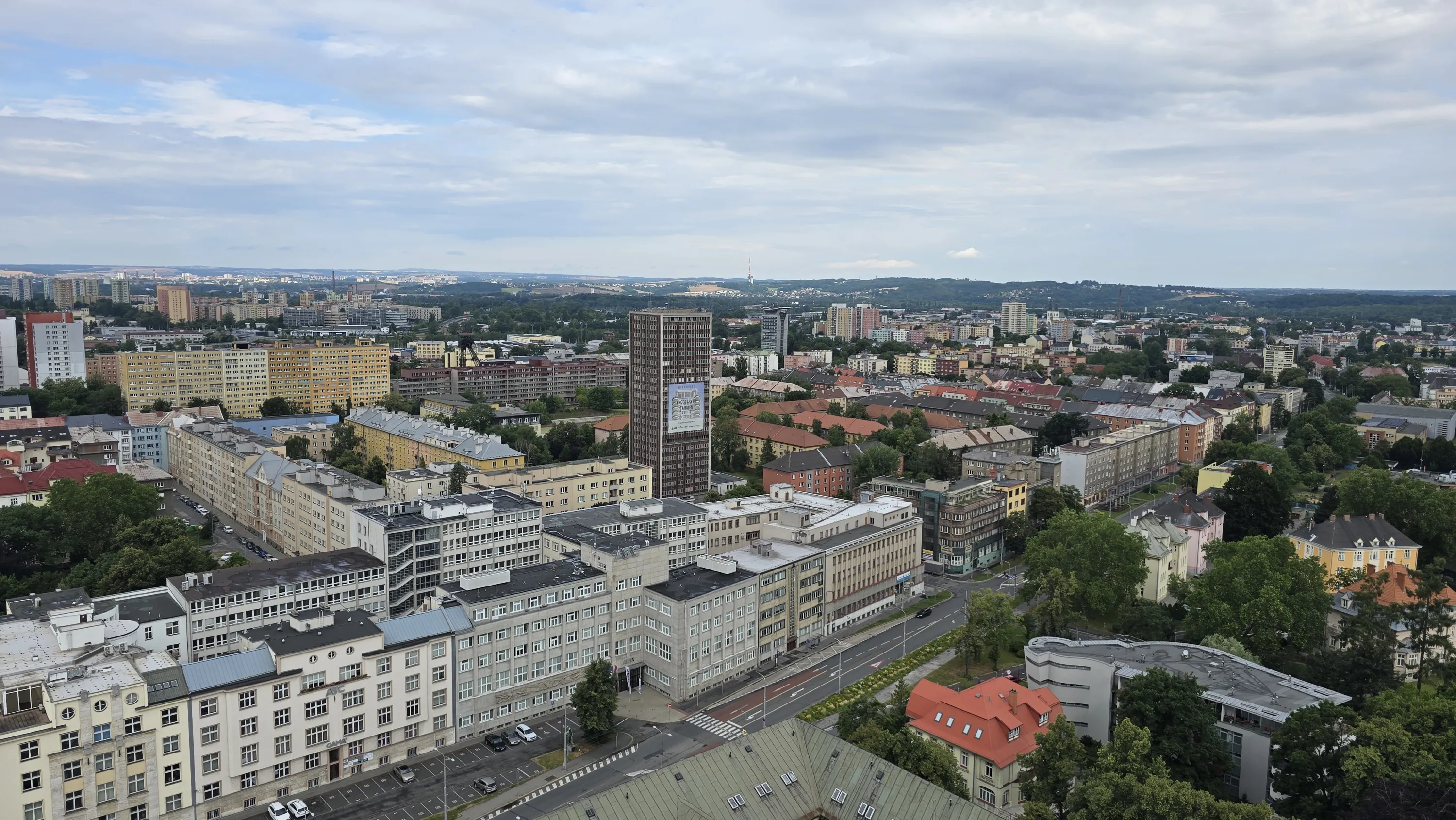 Цей район є цікавим з точки зору аерофотографування. Я хотів його пофотографувати з висоти, але тут у мене сталося непоправне — запустивши дрон з відносно безпечної точки, я хотів його вирівняти, щоб він був більш-менш по центру, але набрав недостатньо висоти і випадково влетів у дерево, де він заплутався у гілках на висоті 10 метрів. Запустити його звідти я не можу, бо пропелери заблоковані. Там ще й таке дерево, що на нього не вилізеш. Намагався збити його звідти камінням та палками, але він так заплутався, що це взагалі не варіант. Приблизно в цей момент починалася злива і вітер посилювався, я думав, може його вітром знесе, але і це не допомогло. Врешті решт я змирився з тим, що я його… ну, ви зрозуміли із заголовка. Добре, що після фотографування центральної частини Острави я завантажив фото з дрона на телефон і у мене хоча б це збереглося.