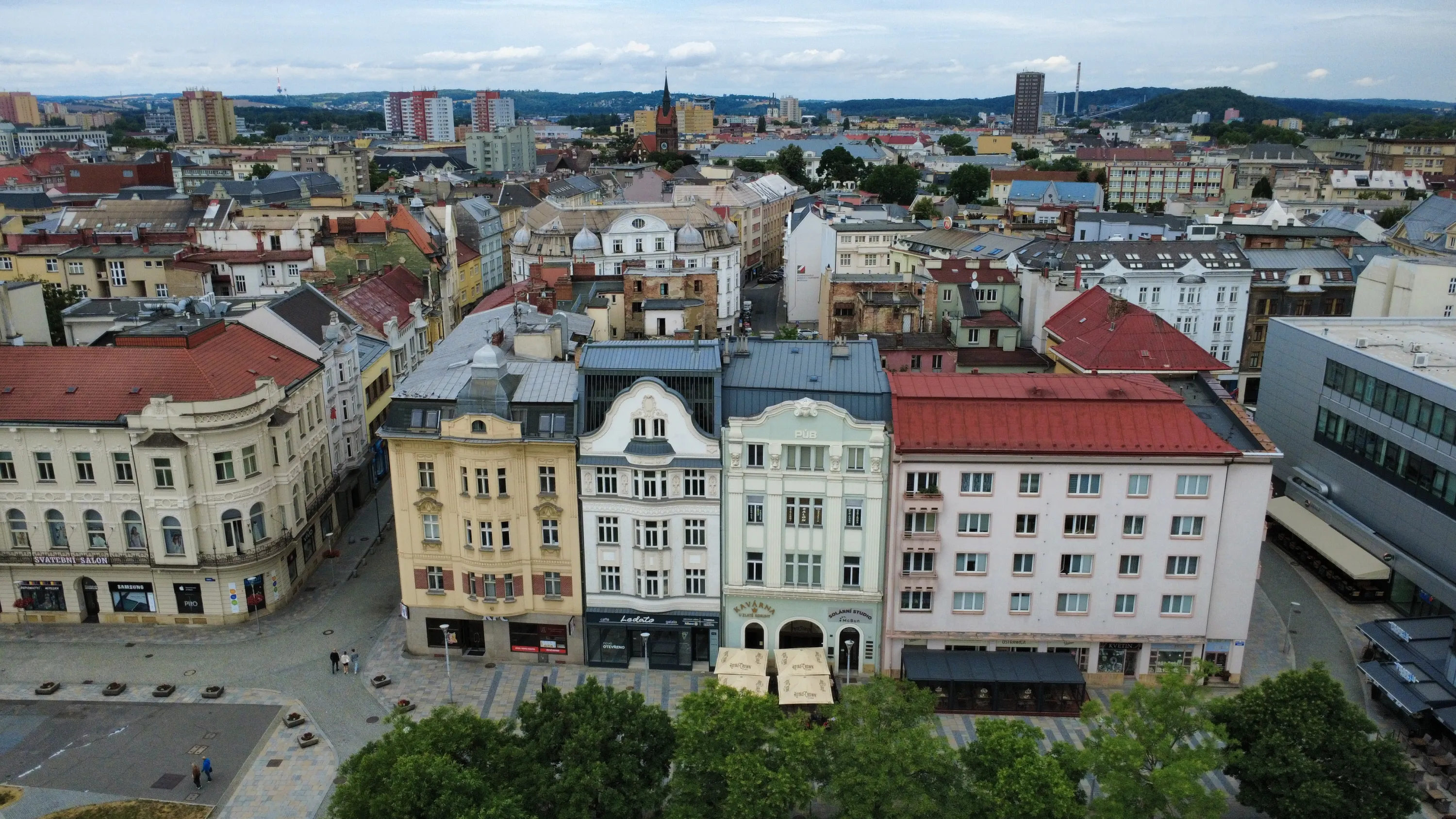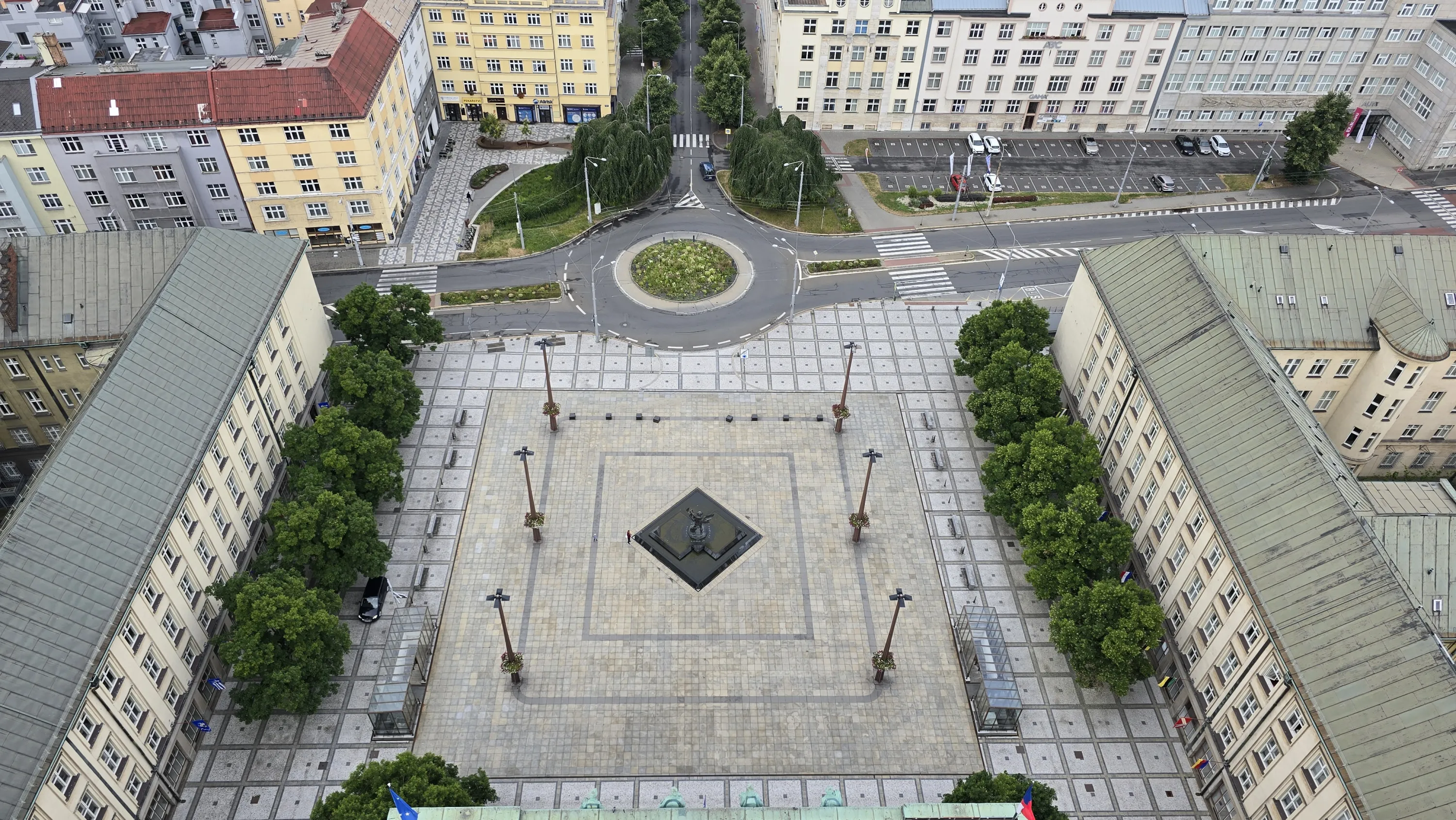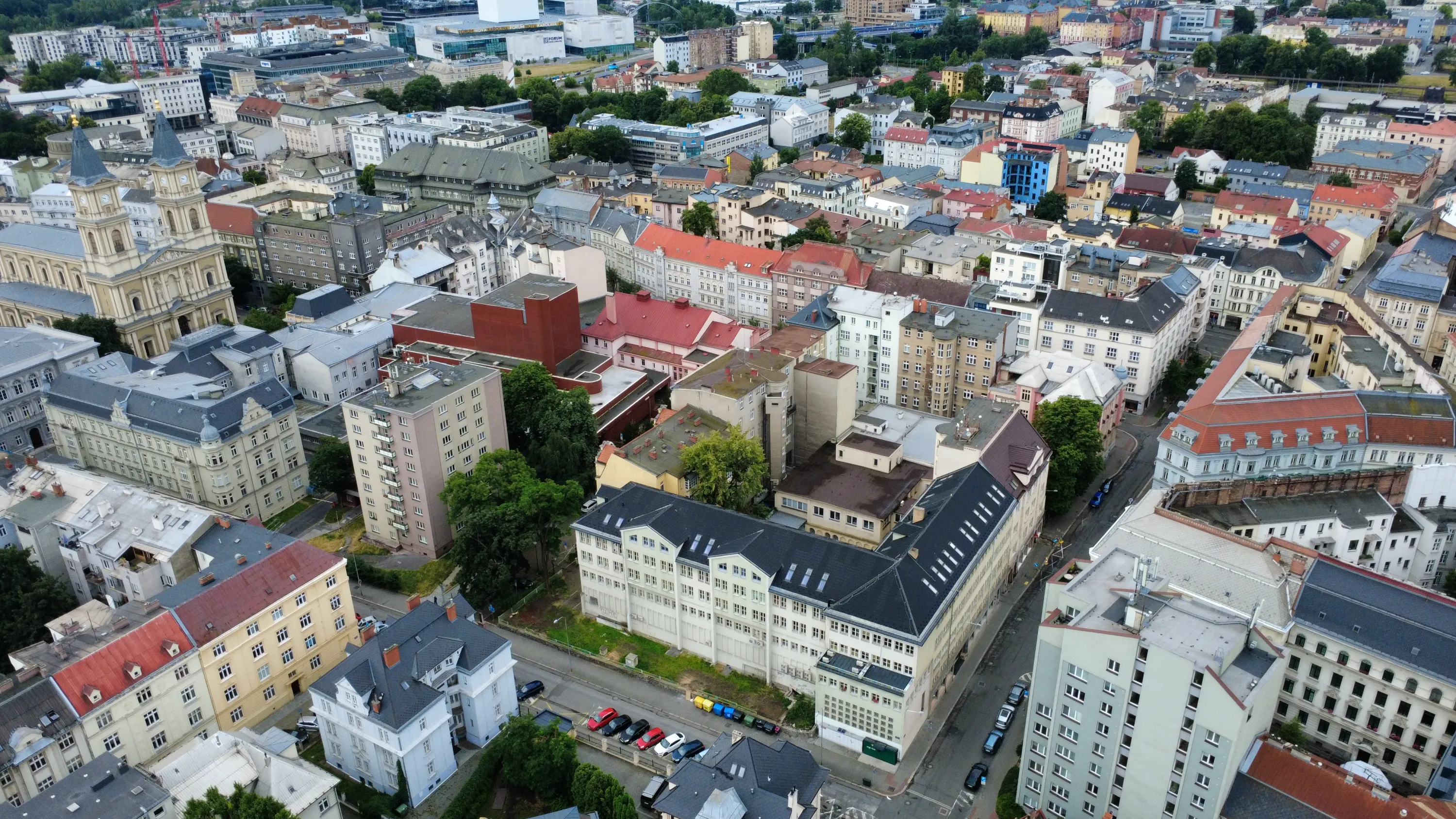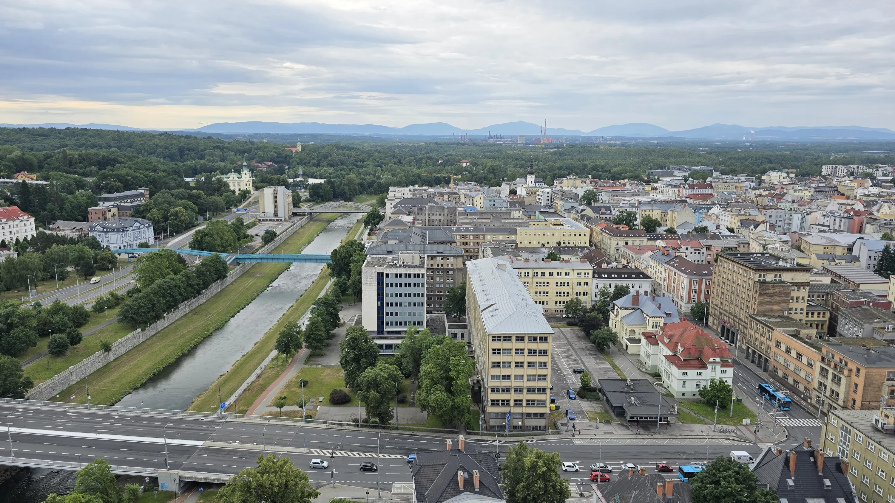 Цей район є цікавим з точки зору аерофотографування. Я хотів його пофотографувати з висоти, але тут у мене сталося непоправне — запустивши дрон з відносно безпечної точки, я хотів його вирівняти, щоб він був більш-менш по центру, але набрав недостатньо висоти і випадково влетів у дерево, де він заплутався у гілках на висоті 10 метрів. Запустити його звідти я не можу, бо пропелери заблоковані. Там ще й таке дерево, що на нього не вилізеш. Намагався збити його звідти камінням та палками, але він так заплутався, що це взагалі не варіант. Приблизно в цей момент починалася злива і вітер посилювався, я думав, може його вітром знесе, але і це не допомогло. Врешті решт я змирився з тим, що я його… ну, ви зрозуміли із заголовка. Добре, що після фотографування центральної частини Острави я завантажив фото з дрона на телефон і у мене хоча б це збереглося.