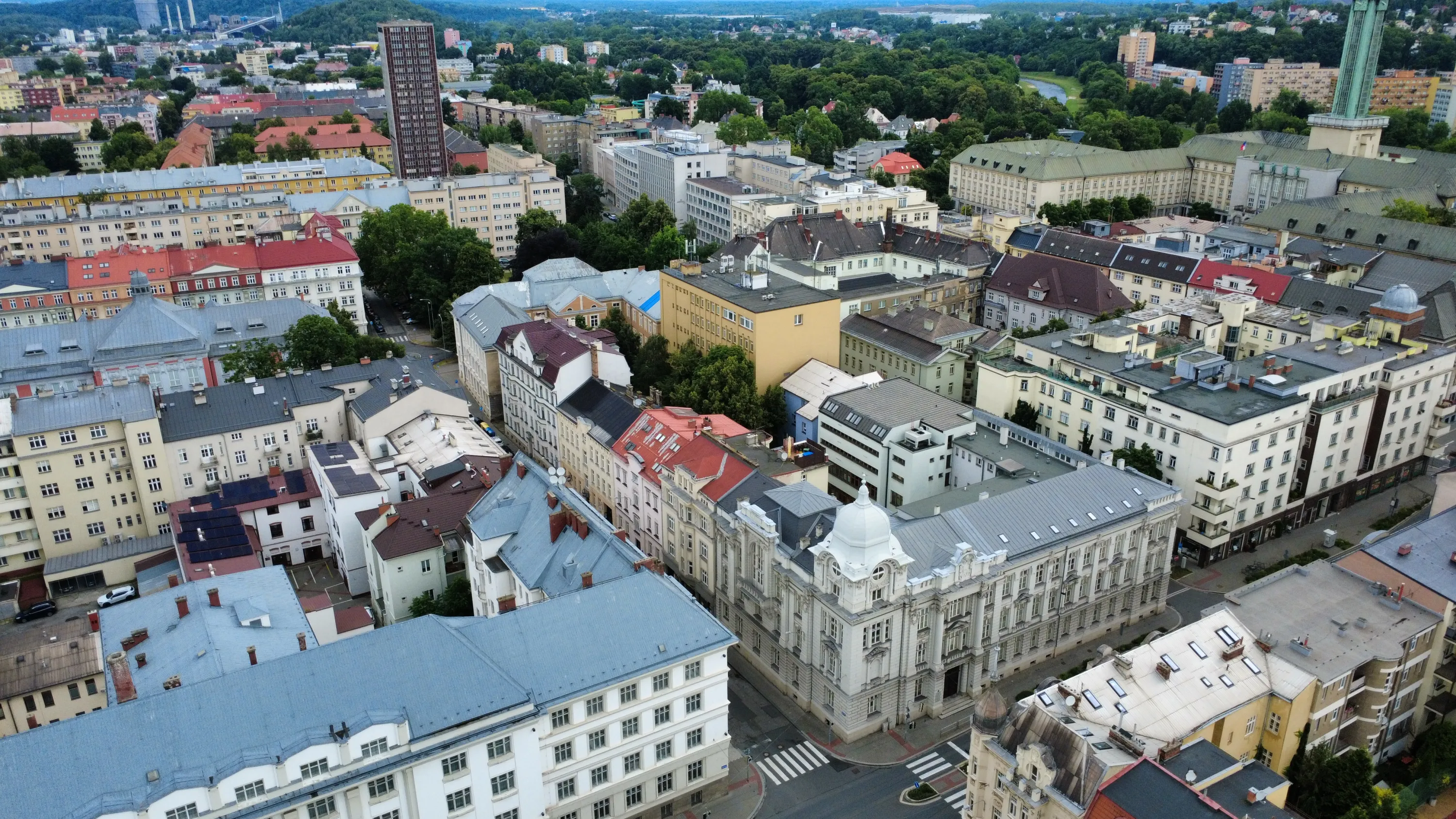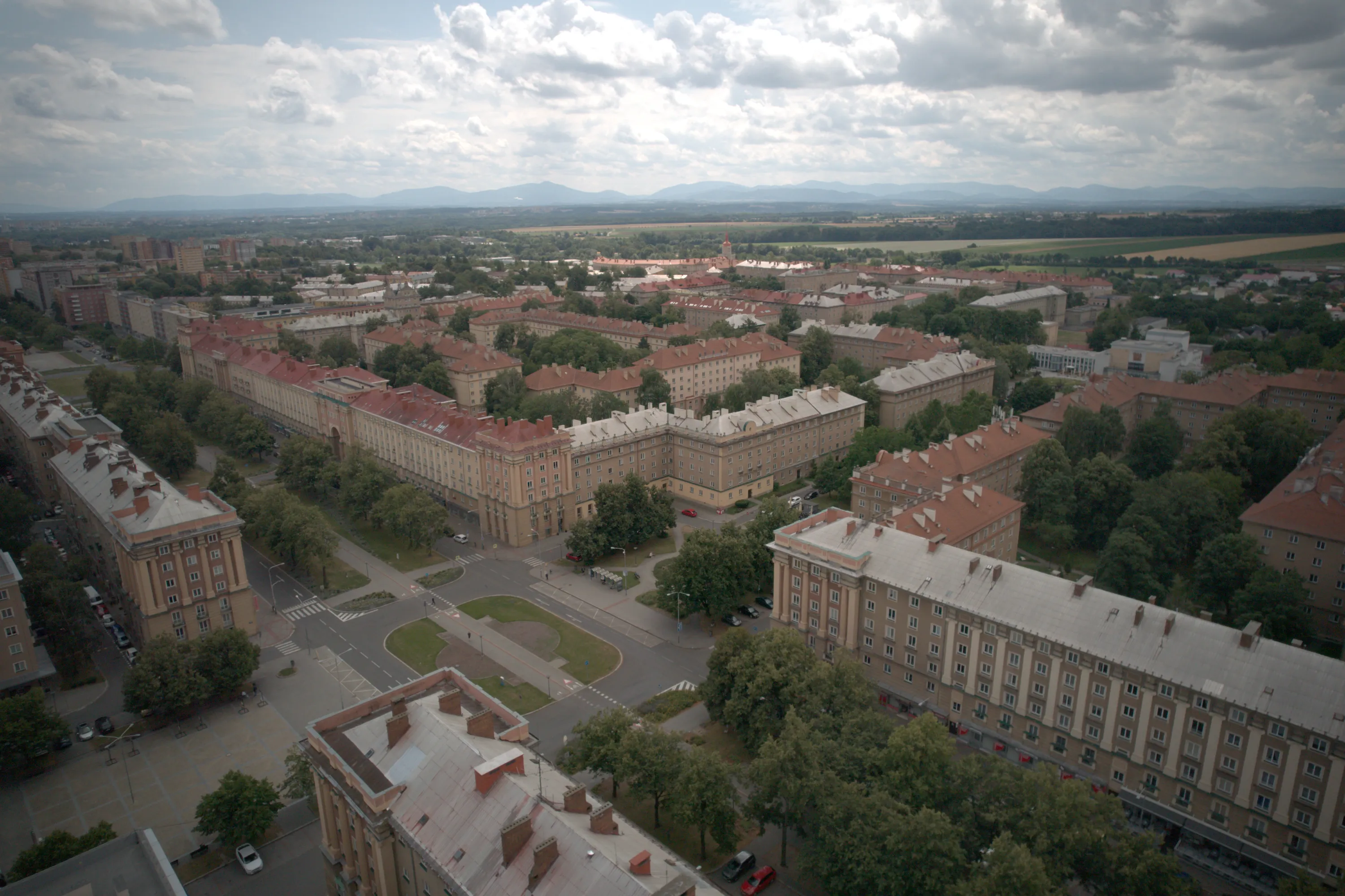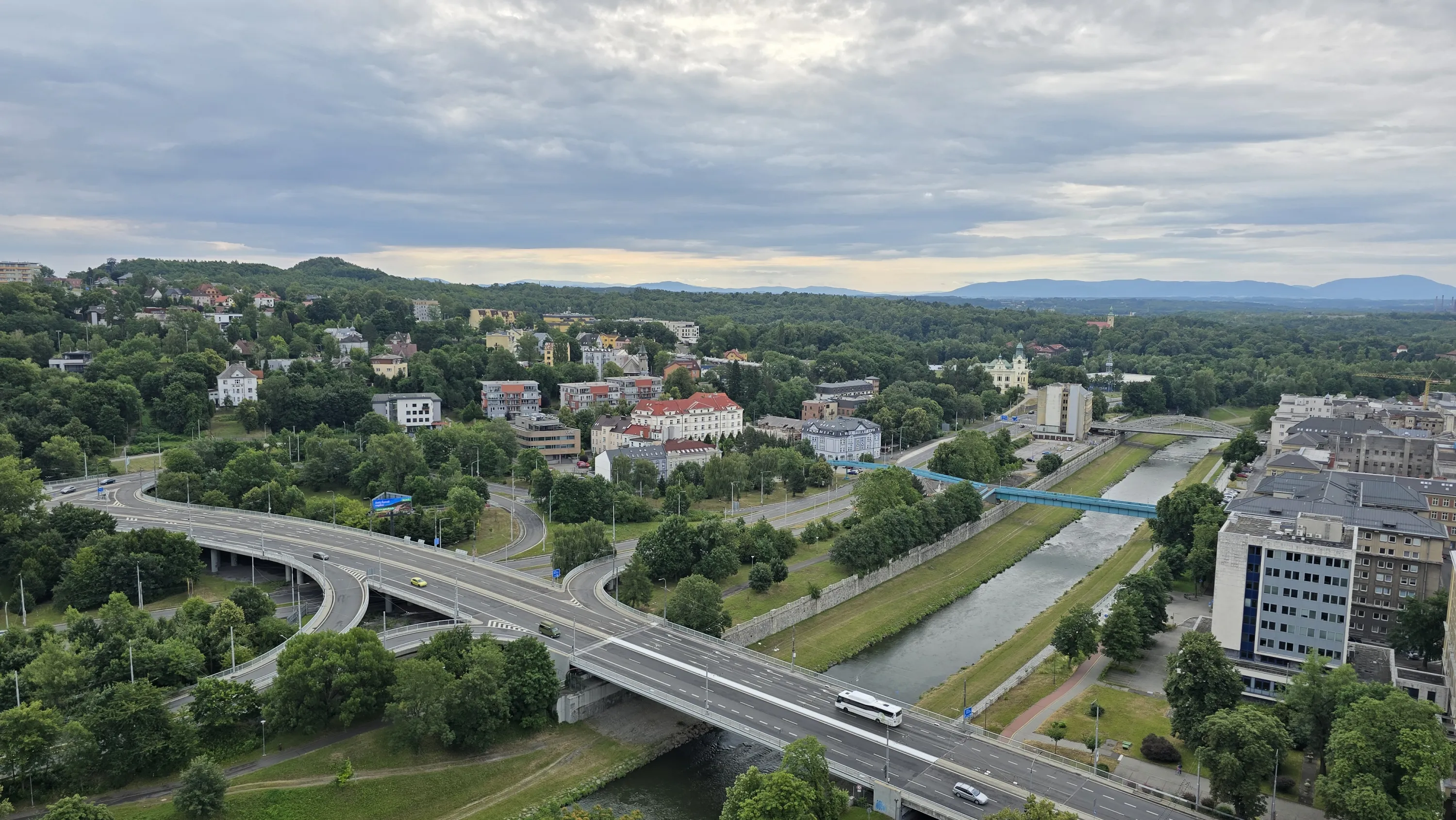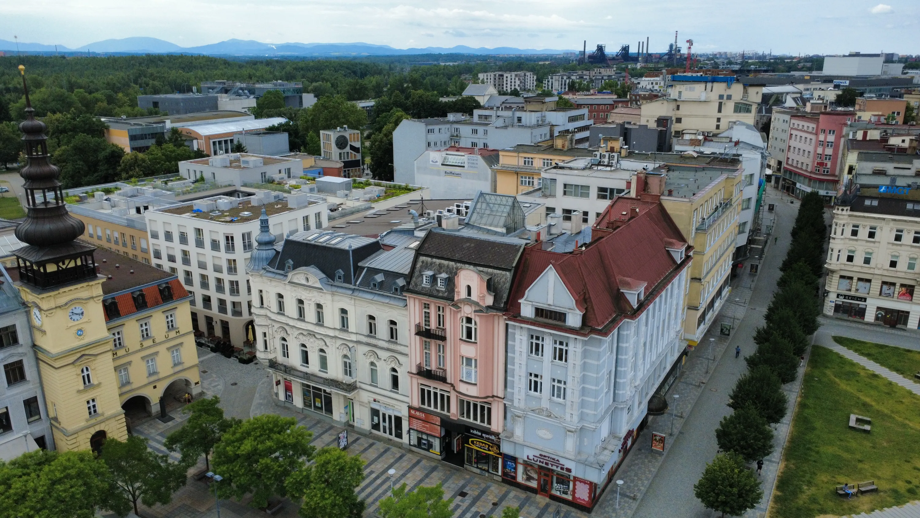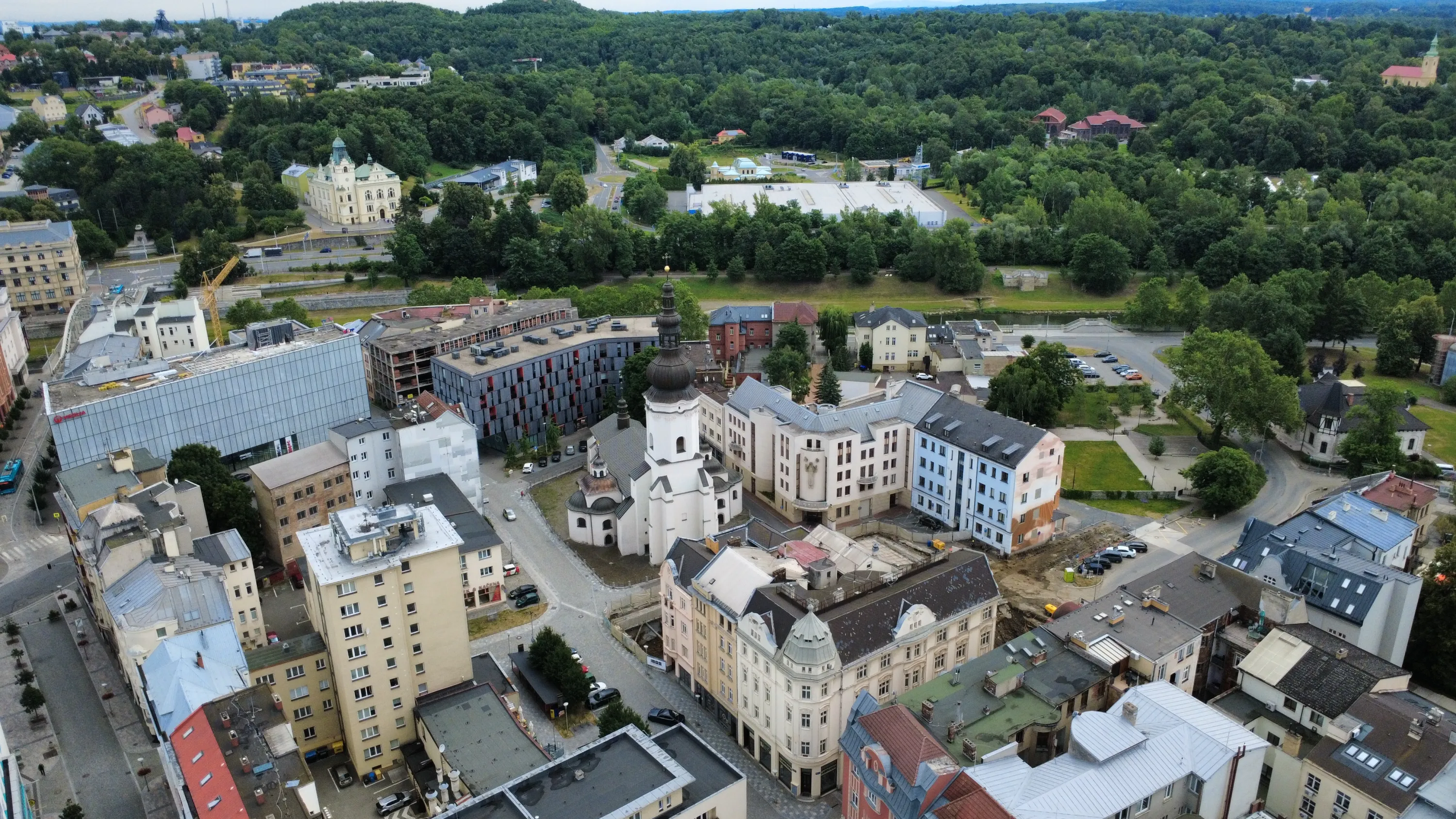 Цей район є цікавим з точки зору аерофотографування. Я хотів його пофотографувати з висоти, але тут у мене сталося непоправне — запустивши дрон з відносно безпечної точки, я хотів його вирівняти, щоб він був більш-менш по центру, але набрав недостатньо висоти і випадково влетів у дерево, де він заплутався у гілках на висоті 10 метрів. Запустити його звідти я не можу, бо пропелери заблоковані. Там ще й таке дерево, що на нього не вилізеш. Намагався збити його звідти камінням та палками, але він так заплутався, що це взагалі не варіант. Приблизно в цей момент починалася злива і вітер посилювався, я думав, може його вітром знесе, але і це не допомогло. Врешті решт я змирився з тим, що я його… ну, ви зрозуміли із заголовка. Добре, що після фотографування центральної частини Острави я завантажив фото з дрона на телефон і у мене хоча б це збереглося.