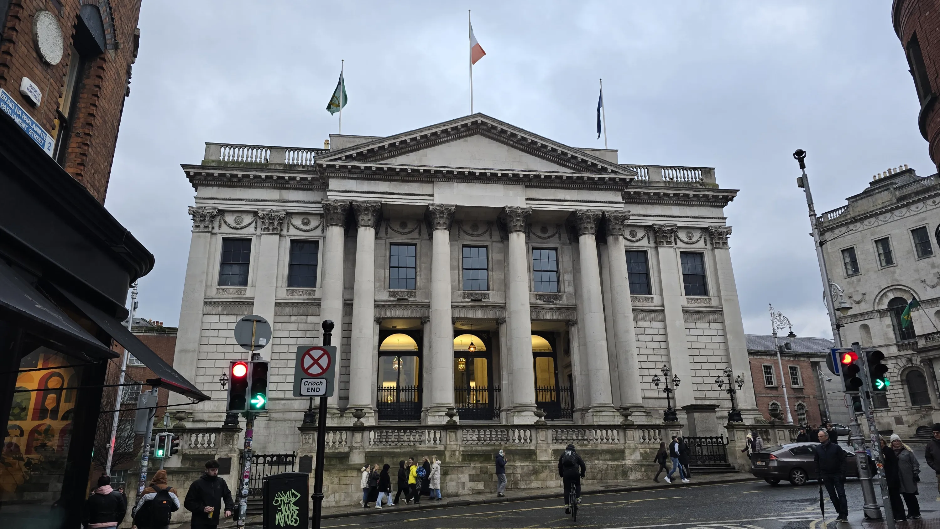 Найбільше туристичних локацій розташовано на південному березі, тому пропоную саме звідти розпочати більш детальне знайомство з ірландською столицею. І почнемо ми з колишньої будівлі ірландського парламенту. Парламент тут засідав до 1800-го року, після чого переїхав в іншу будівлю, а цю будівлю передали Національному банку. Але не дивлячись на це її досі називають будівлею парламенту: