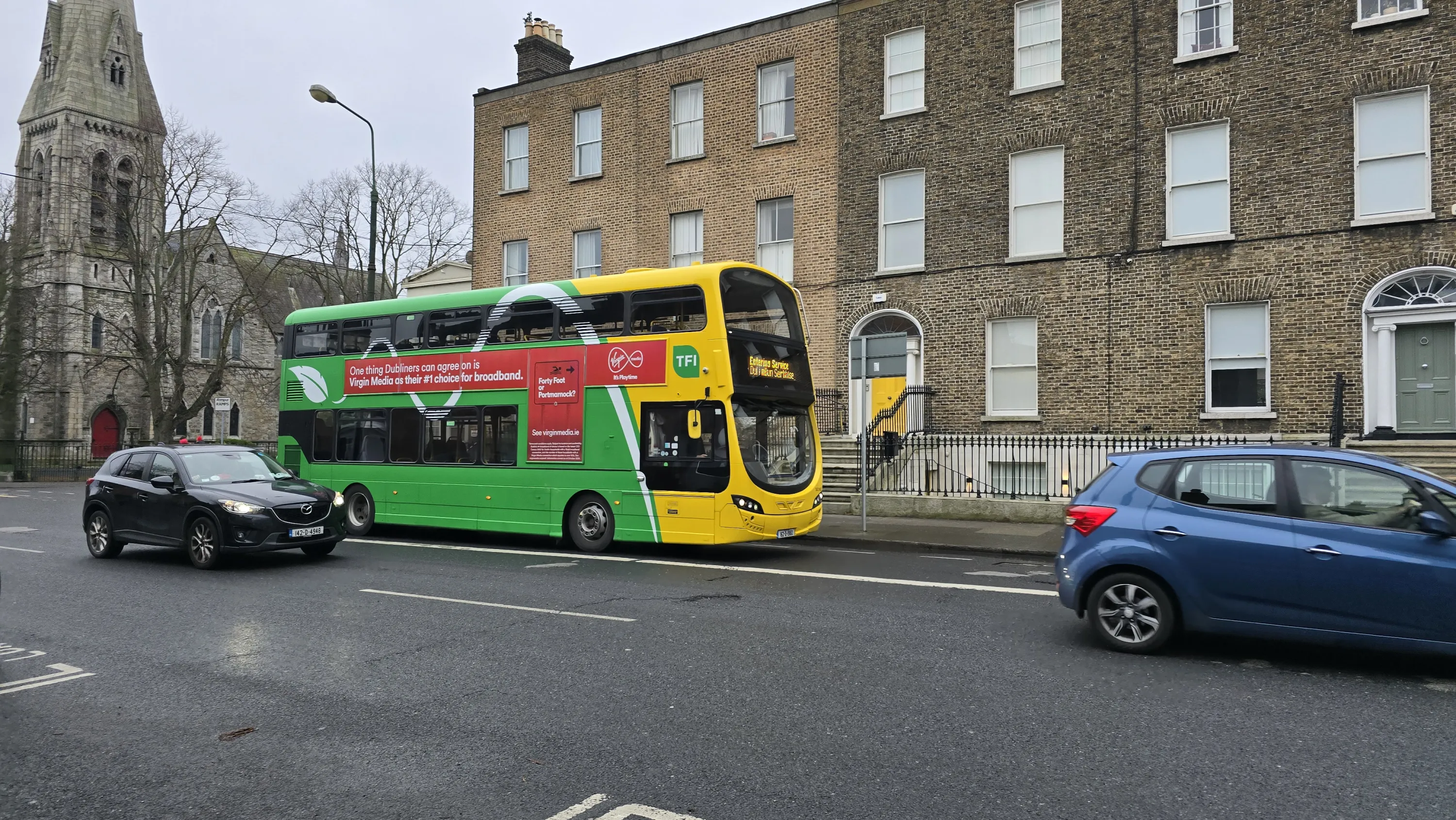 Громадський транспорт в Дубліні представлений переважно автобусами і трамваями. Метро тут немає — Дублін не настільки великий, щоб його тут будувати. Автобуси переважно двоповерхові, як в Лондоні, тільки вони тут пофарбовані в зелено-жовті кольори: