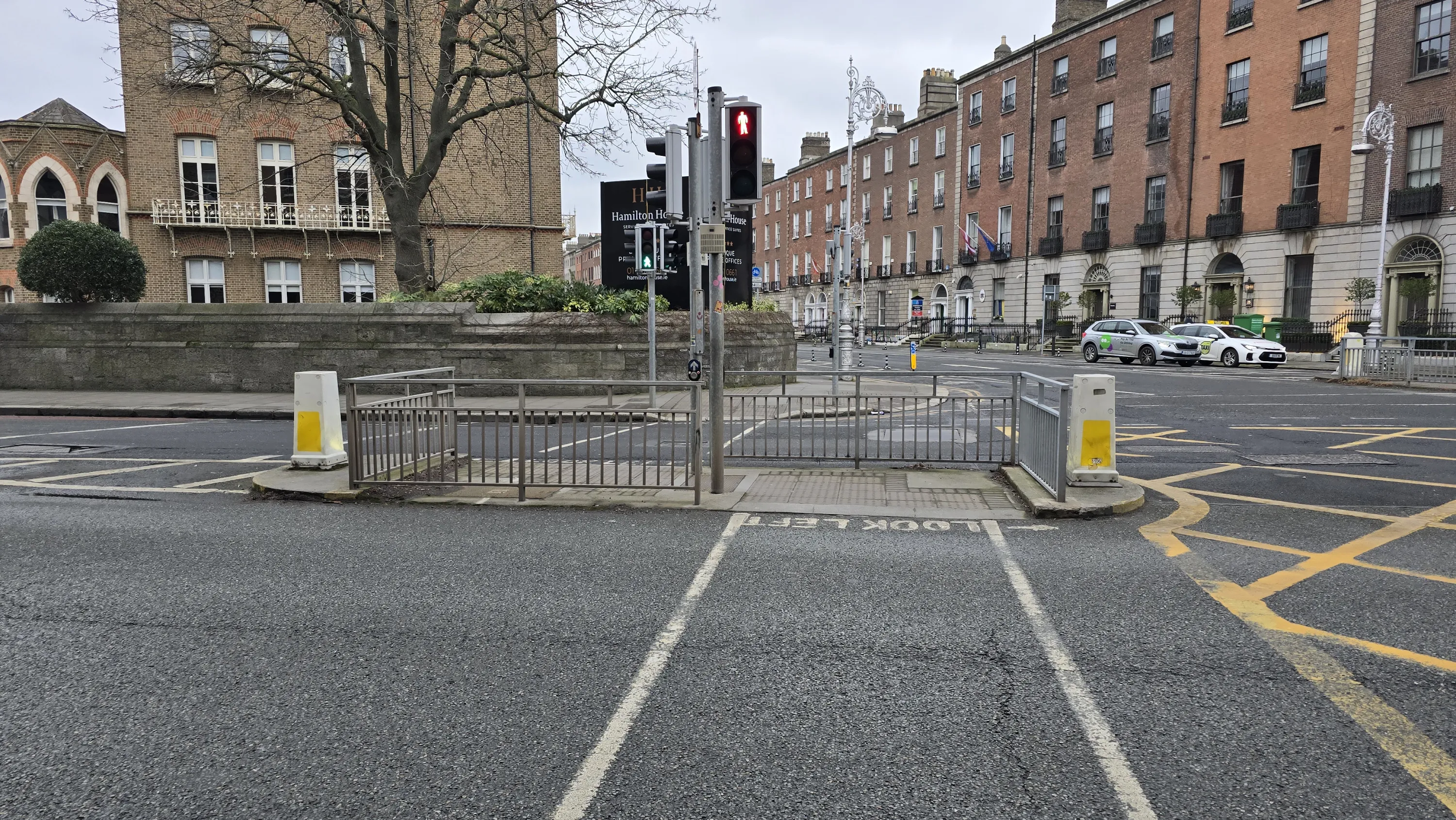 Ось так виглядають пішохідні переходи в Ірландії — немає “зебри” як такої, просто дві вертикальних лінії, між якими порожнина. Виглядає настільки нетипово, що якби не пішохідний світлофор, я б напевно і не здогадався, що це пішохідний перехід. Крім того, тут іноді зустрічаються асиметричні пішохідні переходи, як ось це на фото — як бачите, на другій половині дороги перехід зсунутий вліво, а посередині розташований невеликий острівець. Тобто щоб перейти цю вулицю, вам потрібно пройти прямо до середини дороги, потім на острівці повернути ліворуч, і потім знову прямо. Таке я теж вперше бачу: