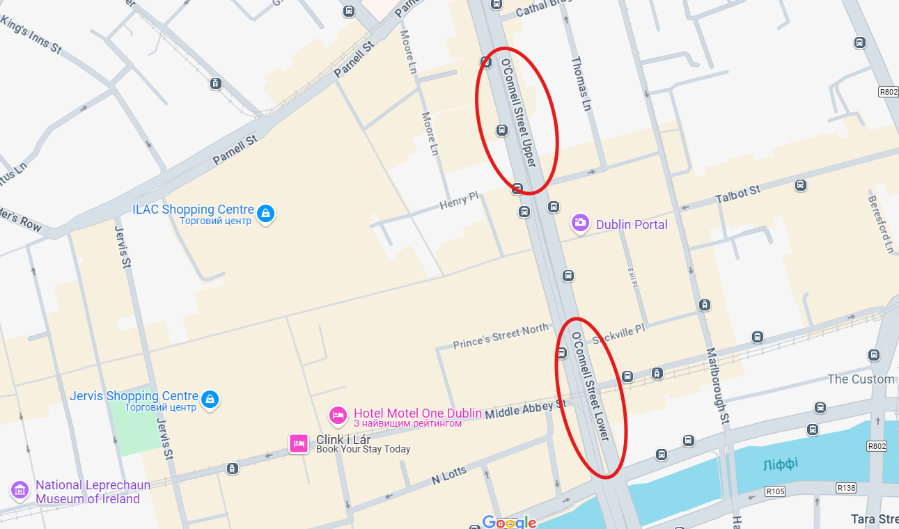 До речі, помітив цікаву деталь, що деякі вулиці тут поділяються на верхню та нижню частину, в тому числі й вулиця О’Коннелла — північна частина вулиці називається Верхня вулиця О’Коннелла (O’Connell Street Upper), а південна — Нижня вулиця О’Коннелла (O’Connell Street Lower). Хтось, звісно, може згадати, що і в Києві є дещо подібне, наприклад, вулиці Верхній вал та Нижній вал, але це буде некоректна аналогія, бо Верхній вал і Нижній вал — це вулиці, які ідуть паралельно впритул одна до одної, просто по одній з них рух іде в одному напрямку, по іншій — в протилежному. З вулицею О’Коннела ситуація зовсім інша — верхній сегмент є продовженням нижнього і цей поділ досить умовний. Наприклад, по карті взагалі неможливо з’ясувати, де закінчується Нижня вулиця О’Коннелла і починається Верхня: