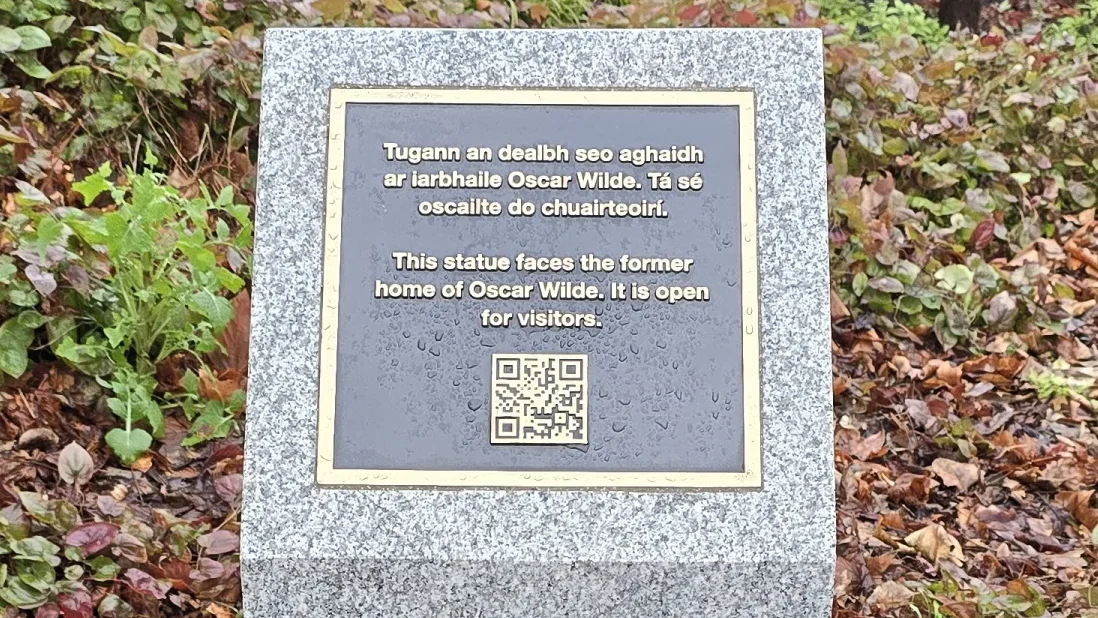 На табличці біля пам’ятника вказано, що пам’ятник встановлено навпроти будинку, де Оскар Уайльд жив. Написано ірландською та англійською мовами: