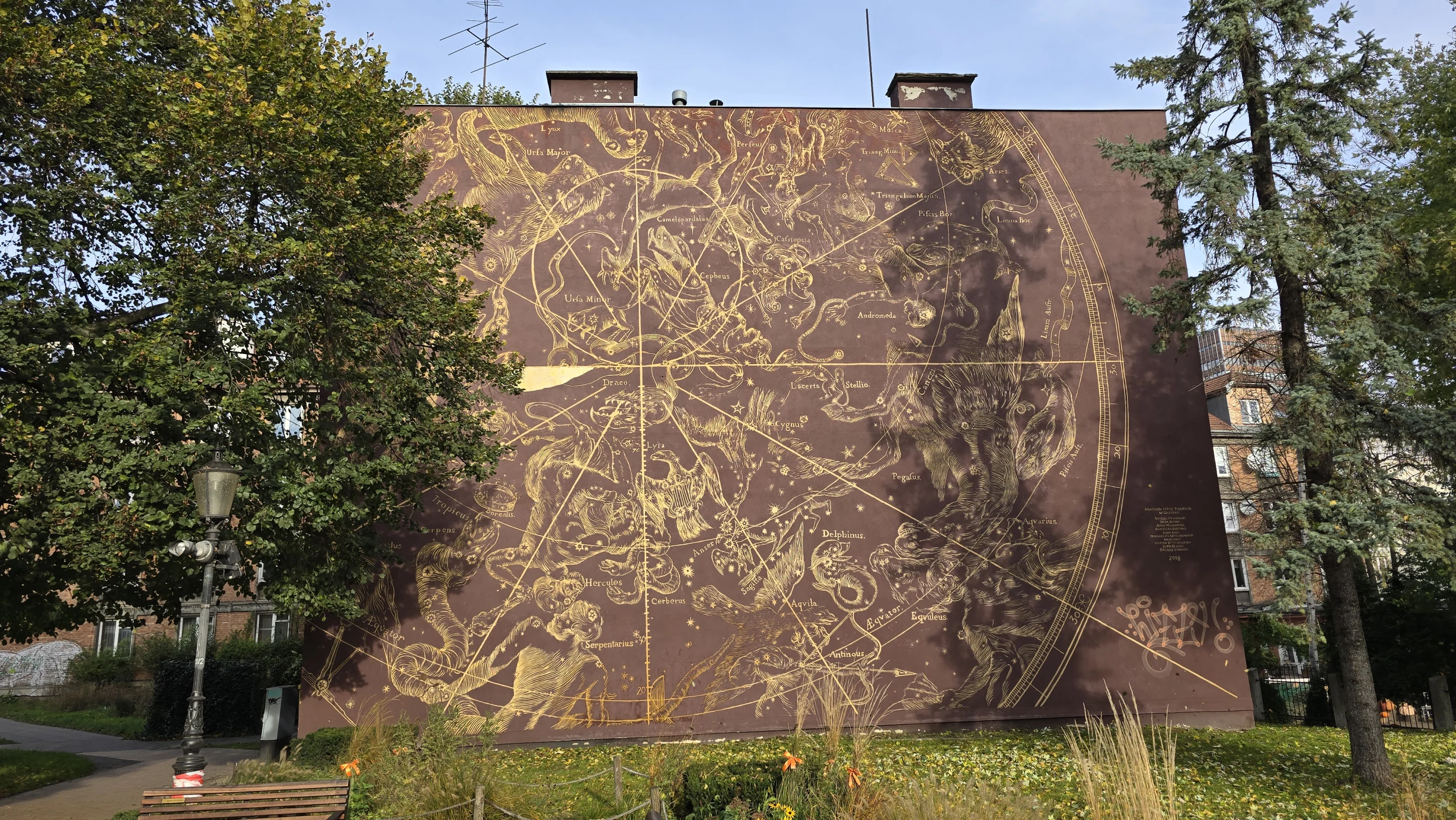 Мурал з картою зоряного неба Яна Гевелія на будівлі поруч із пам’ятником йому: