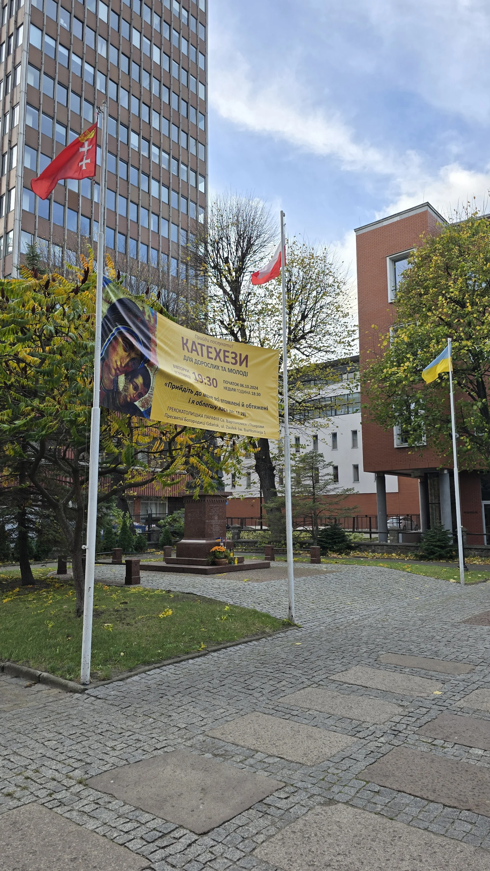 Зліва від пам’ятника знаходиться українська греко-католицька церква: