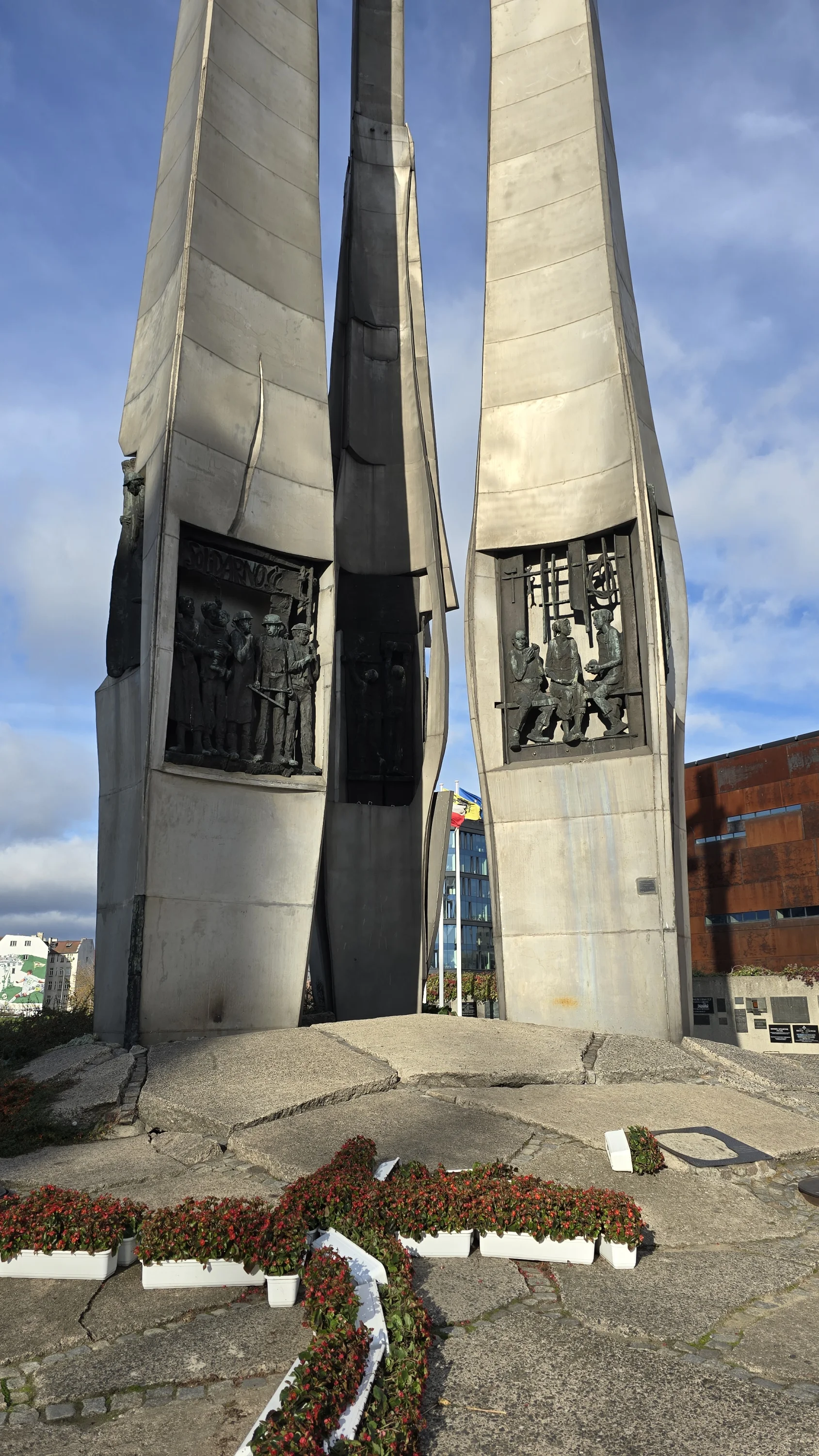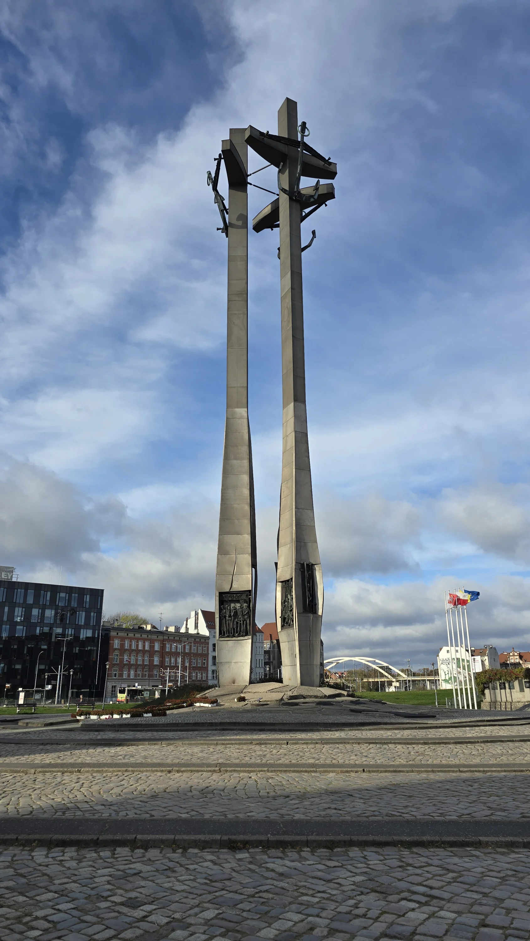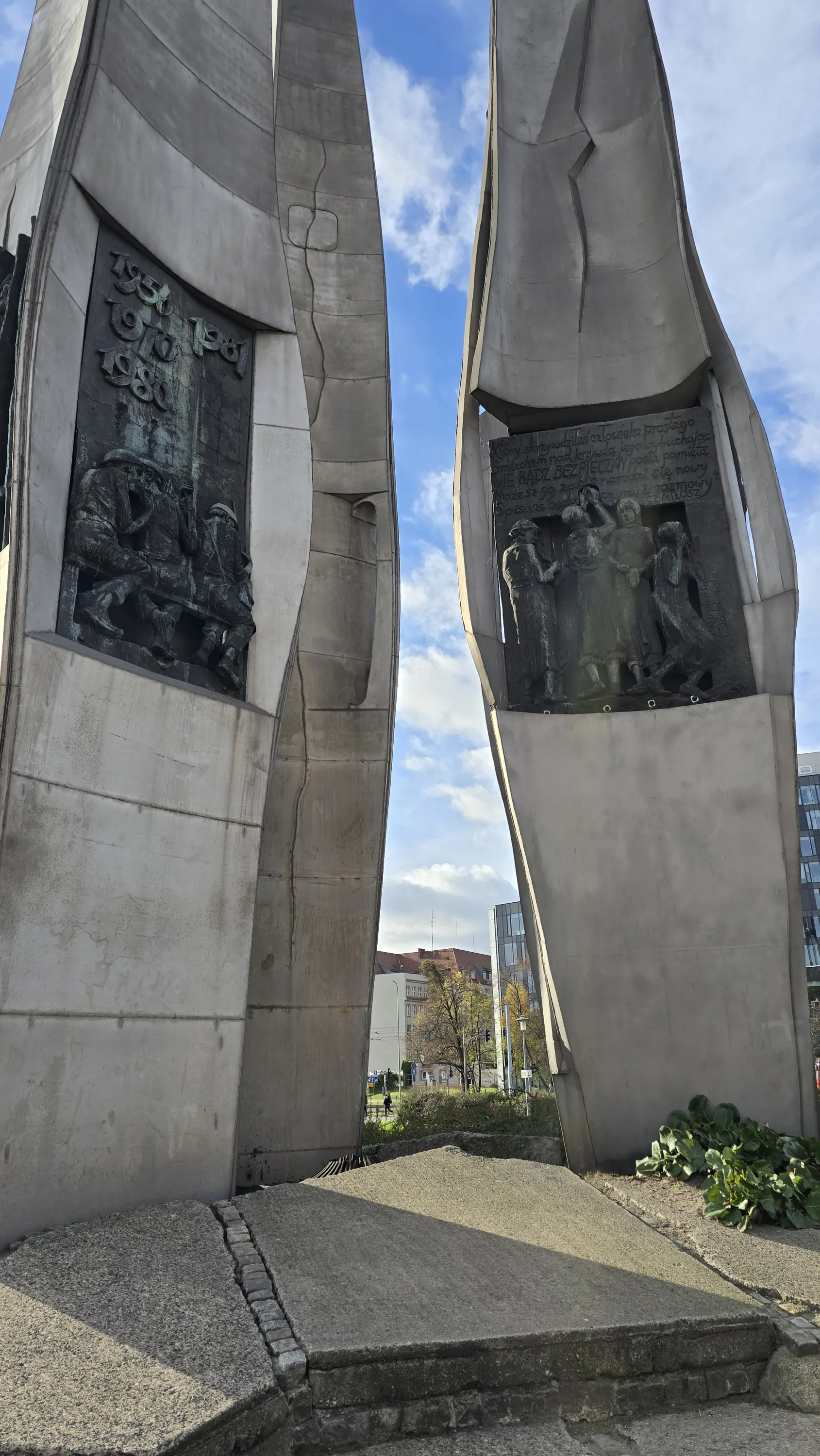 Але ми вже трохи відійшли від теми, тому повернемося до Гданська. І раз ми вже заговорили про падіння комунізму, ми зараз перемістимось до ще однієї історичної локації північніше Старого міста, звідки власне і почалося його падіння в Польщі і не тільки. Це пам’ятник полеглим працівникам верфі у вигляді трьох хрестів з якорями. В грудні 1970-го працівники верфі влаштували страйк внаслідок різкого підвищення цін на продовольчі та інші товари. В результаті зіткнень протестувальників з поліцією 42 людини загинуло. Але це все передісторія. Через 10 років працівники верфі влаштували новий страйк, який очолив Лех Валенса — активіст та колишній працівник верфі, звільнений за участь у непідконтрольних владі вільних профспілках. Протестуючі вимагали поновити Валенсу на роботі, дозволити встановити пам’ятник загиблим у 1970-му колегам, підняти заробітну плату, забезпечити свободу слова та віросповідання тощо. Цей “другий Майдан” виявився більш успішним за попередній, оскільки змусив комуністичну владу Польщі піти на поступки — була легалізована очолювана Лехом Валенсою профспілка “Солідарність”, яка згодом перетворилася у масовий рух за демократизацію Польщі. В кінці того ж 1980 року було встановлено цей пам’ятник: