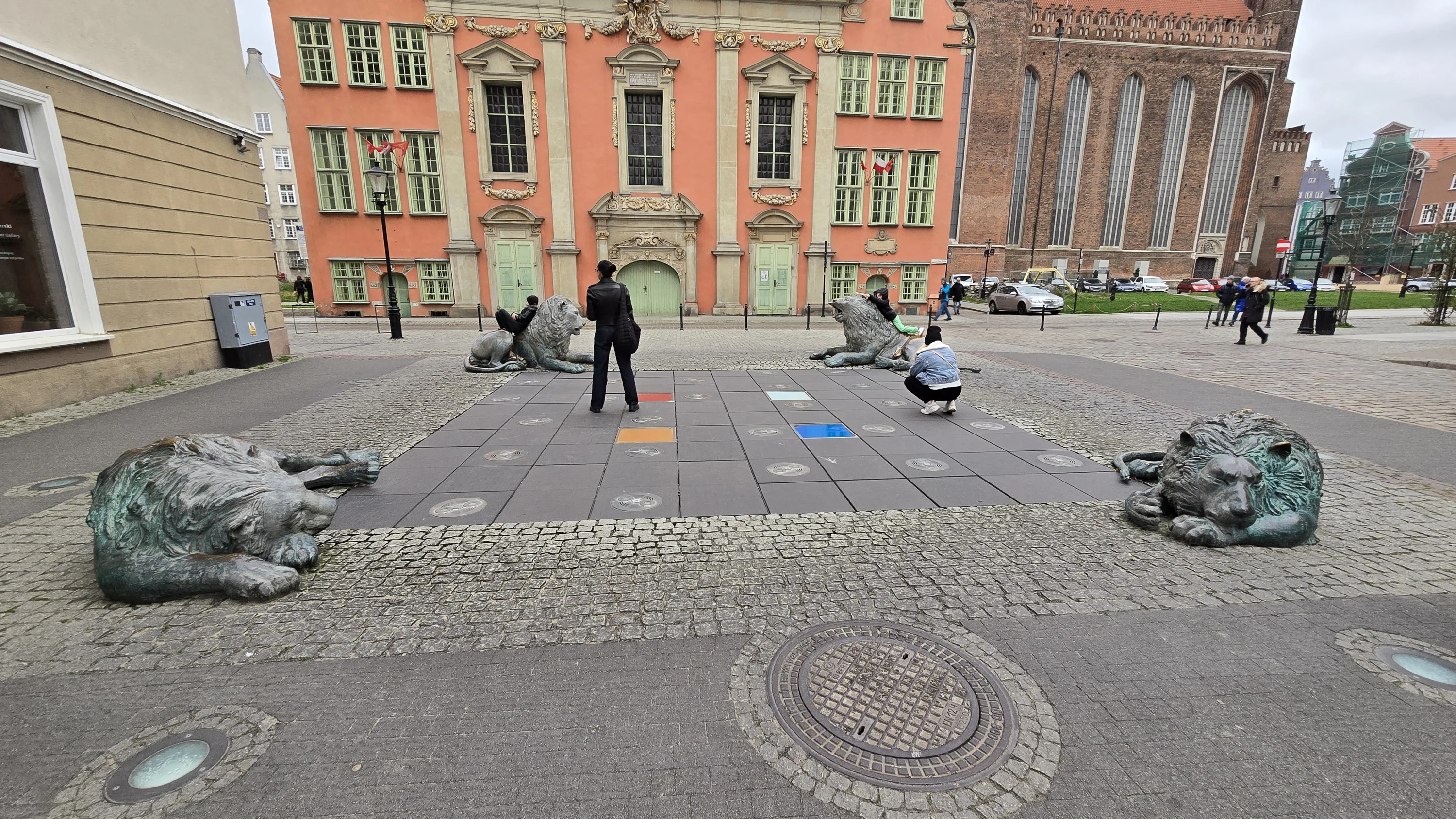 Пам’ятаєте, я в одному з фотозвітів про Вроцлав розповідав про маленькі скульптури гномів, які є одним із символів цього міста? Хто не читав або забув, нагадаю — ці скульптури встановлювались з метою викликати у туристів спортивний інтерес, або іншими словами — бажання відшукати всіх гномів. Для цього навіть існують спеціальні туристичні карти, де вказано місцезнаходження кожного гнома. Так от, десь на початку 2010-х Гданськ вирішив запозичити у Вроцлава цю ідею, але замість гномів тут вигадали власного персонажа — лева Гевельйона (Hewelion). Його ім’я є похідним від прізвища астронома Яна Гевелія (про нього ми ще поговоримо) та англійського слова “Lion” (лев). Лева обрали в якості персонажа, оскільки ця тварина є одним із символів Гданська (на великому гербі міста зображено двох левів). В принципі, гноми у Вроцлаві також не на рівному місці з’явились (у 1980-х вони були символом одного з антикомуністичних рухів у місті).