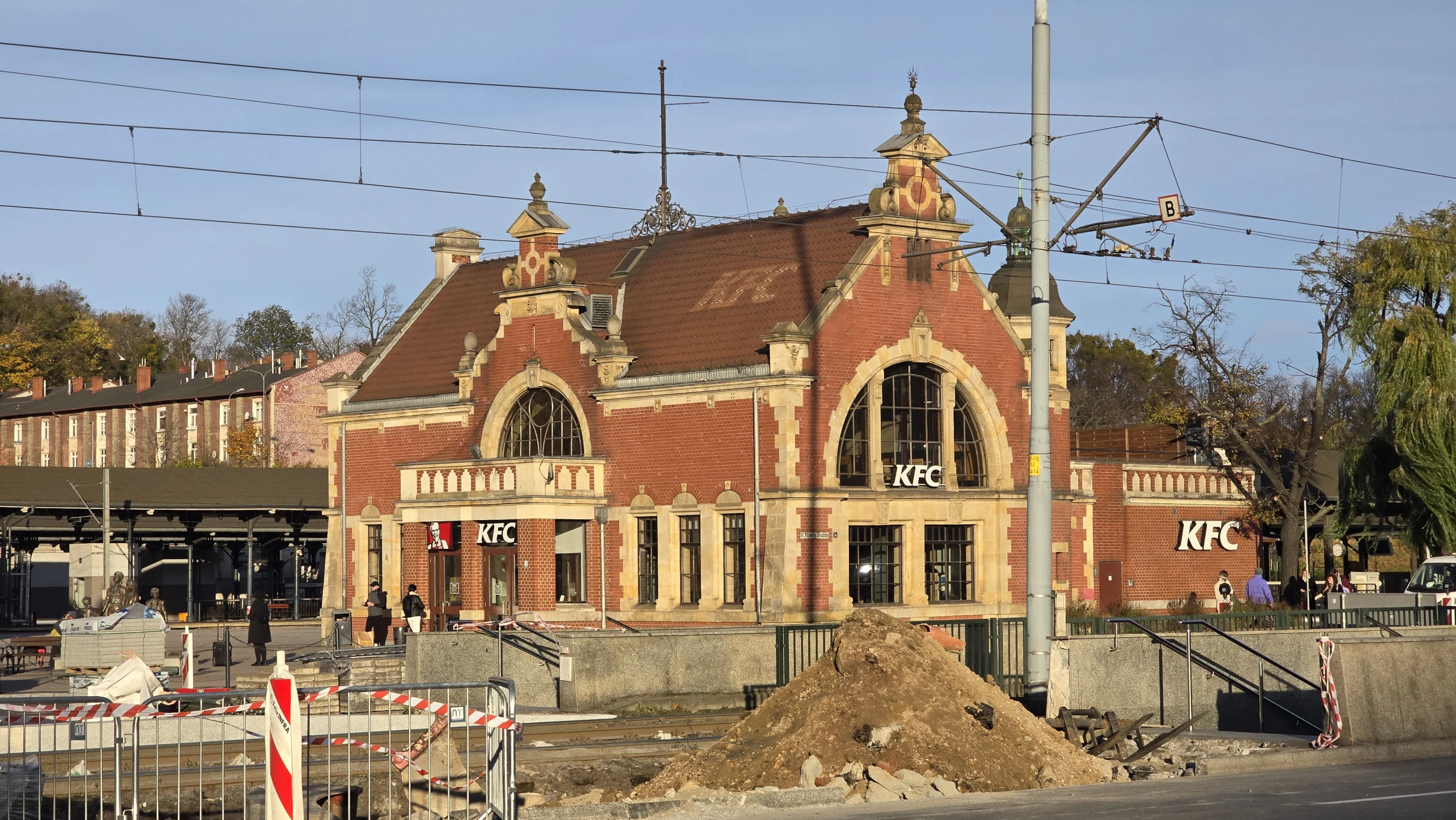Справа від вокзалу знаходиться фаст-фуд KFC, будівля якого виконана в ідентичному стилі: