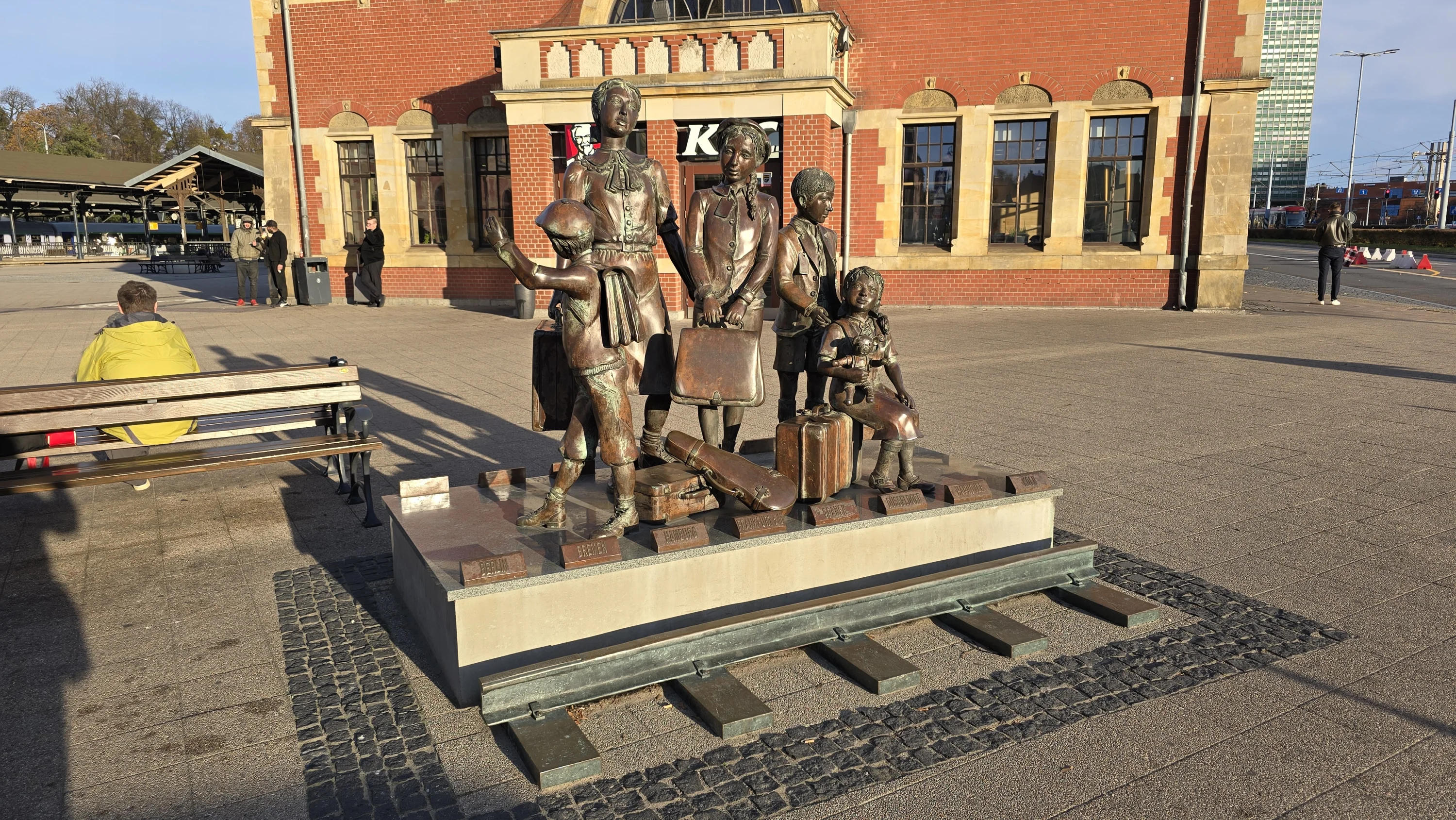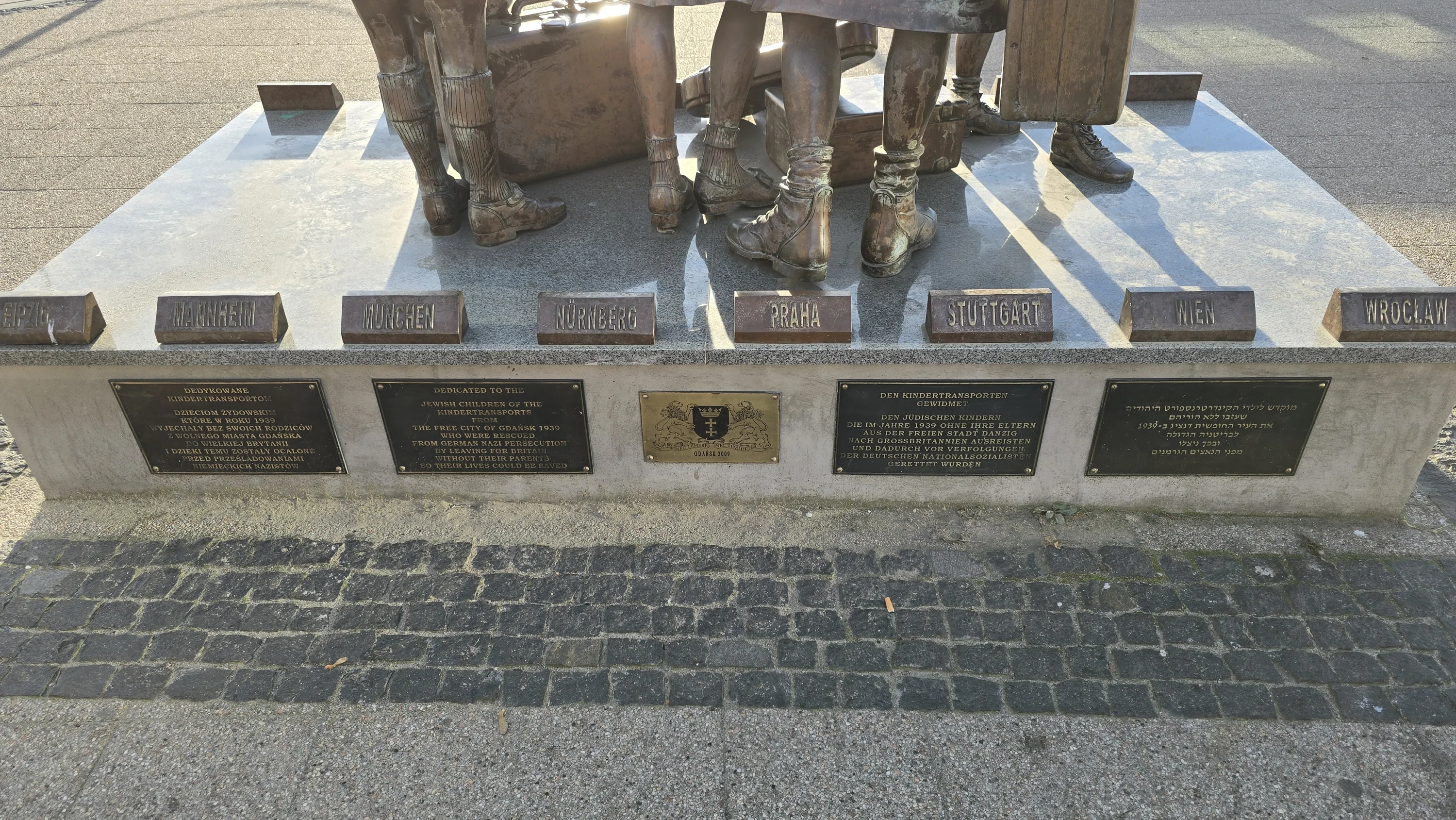 Перед KFC стоїть пам’ятник “Кіндертранспорту” — рятівній операції, яка була здійснена незадовго до початку Другої світової війни. Її суть полягала в перевезенні та розміщенні на території Великої Британії єврейських дітей з Німеччини, Австрії, Чехословаччини, Польщі та Вільного міста Данцига. З Данцига з травня по серпень 1939-го було відправлено чотири транспорти єврейських дітей, чиї батьки не мали можливості покинути місто. Автором пам’ятника є ізраїльський скульптор Франк Майслер, який сам в 10-річному віці був врятований завдяки цій операції. Його батьки невдовзі були вбиті нацистами. Пам’ятник представляє собою групу дітей, які на залізничній платформі очікують на поїзд: