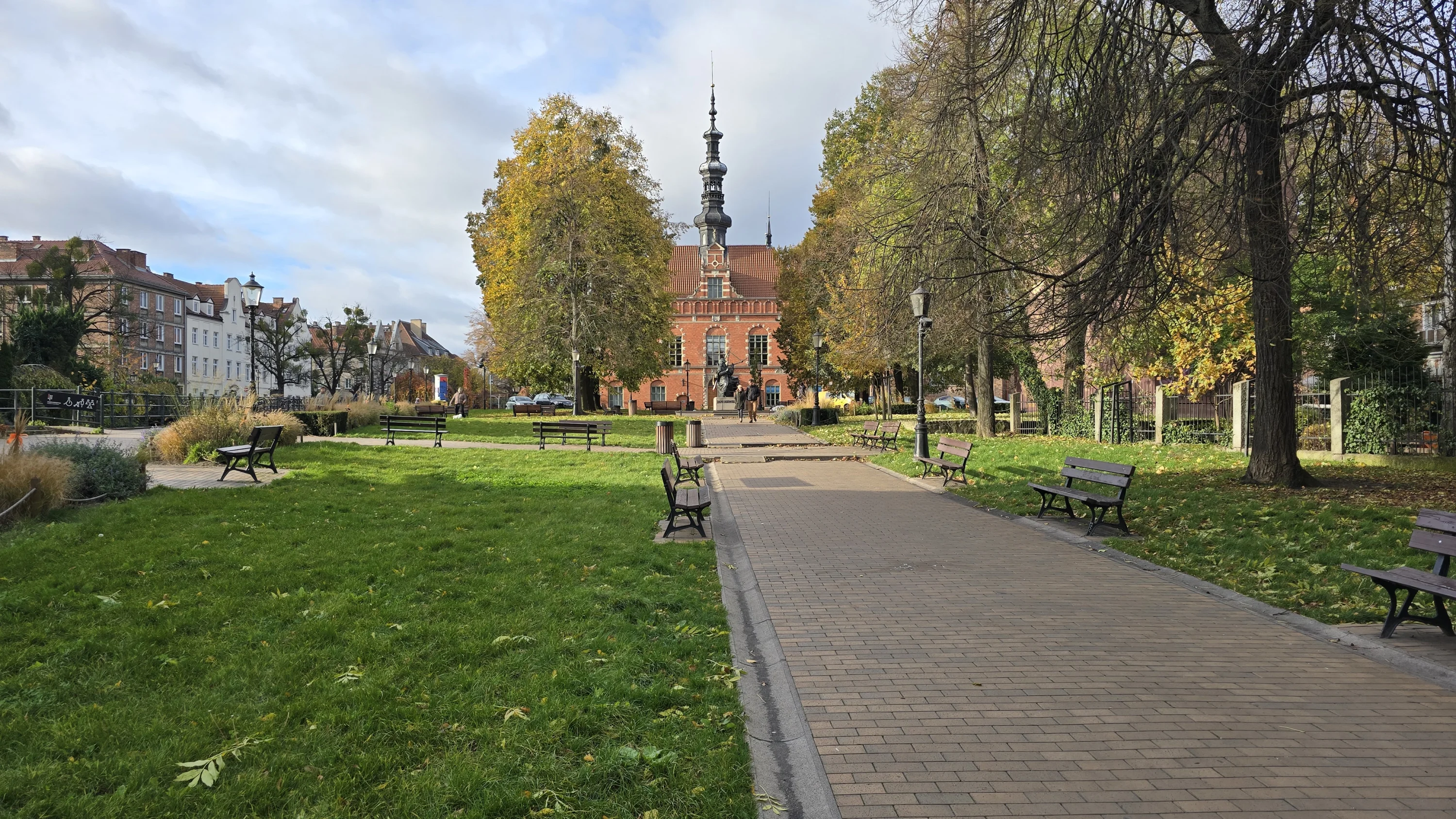 Перед сквером — будівля ратуші Старого міста (це вже друга ратуша Гданська):