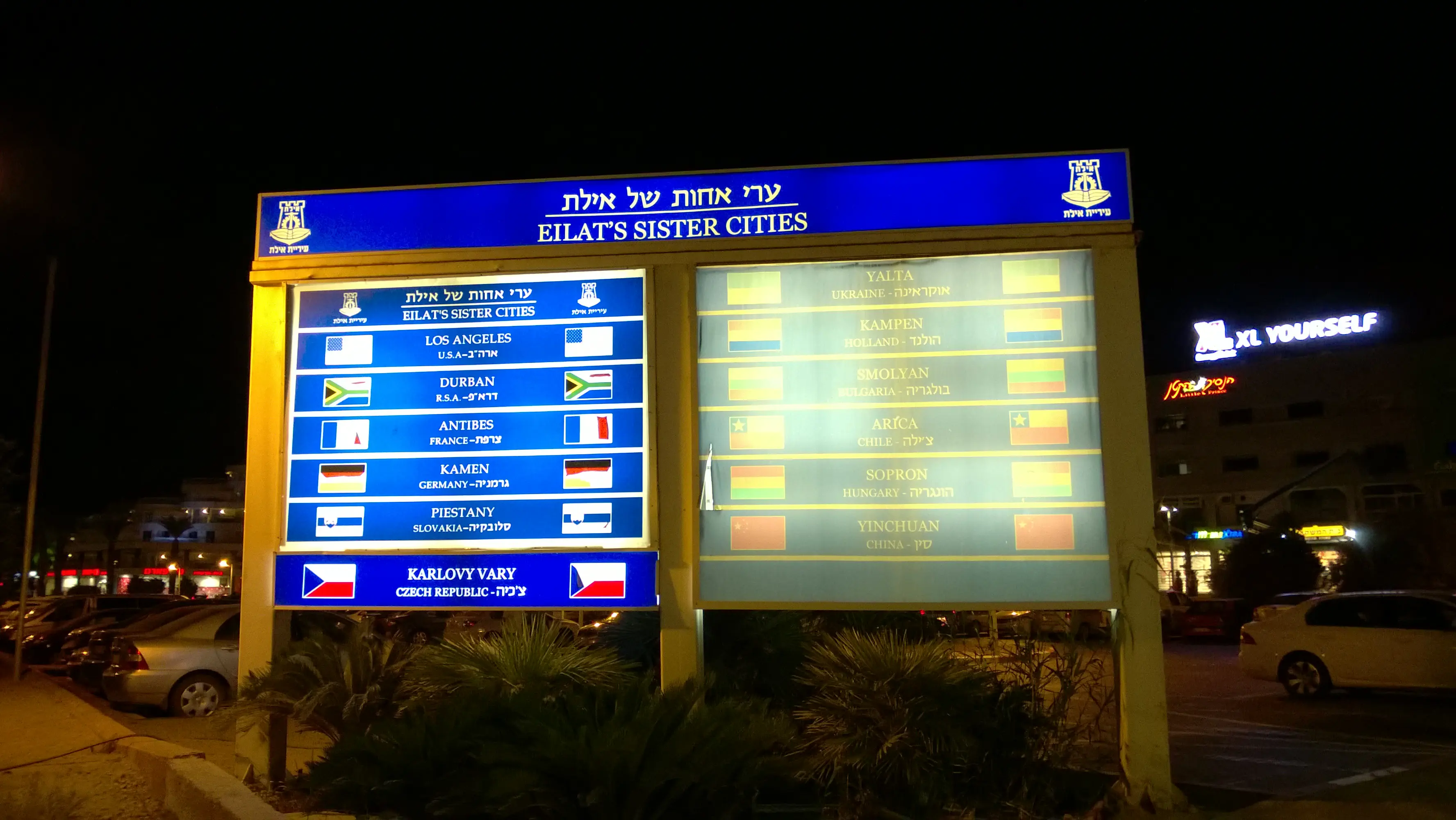 В центрі міста встановлено табло із списком міст-побратимів Ейлата. Приємно серед них бачити і Ялту під українським прапором:
