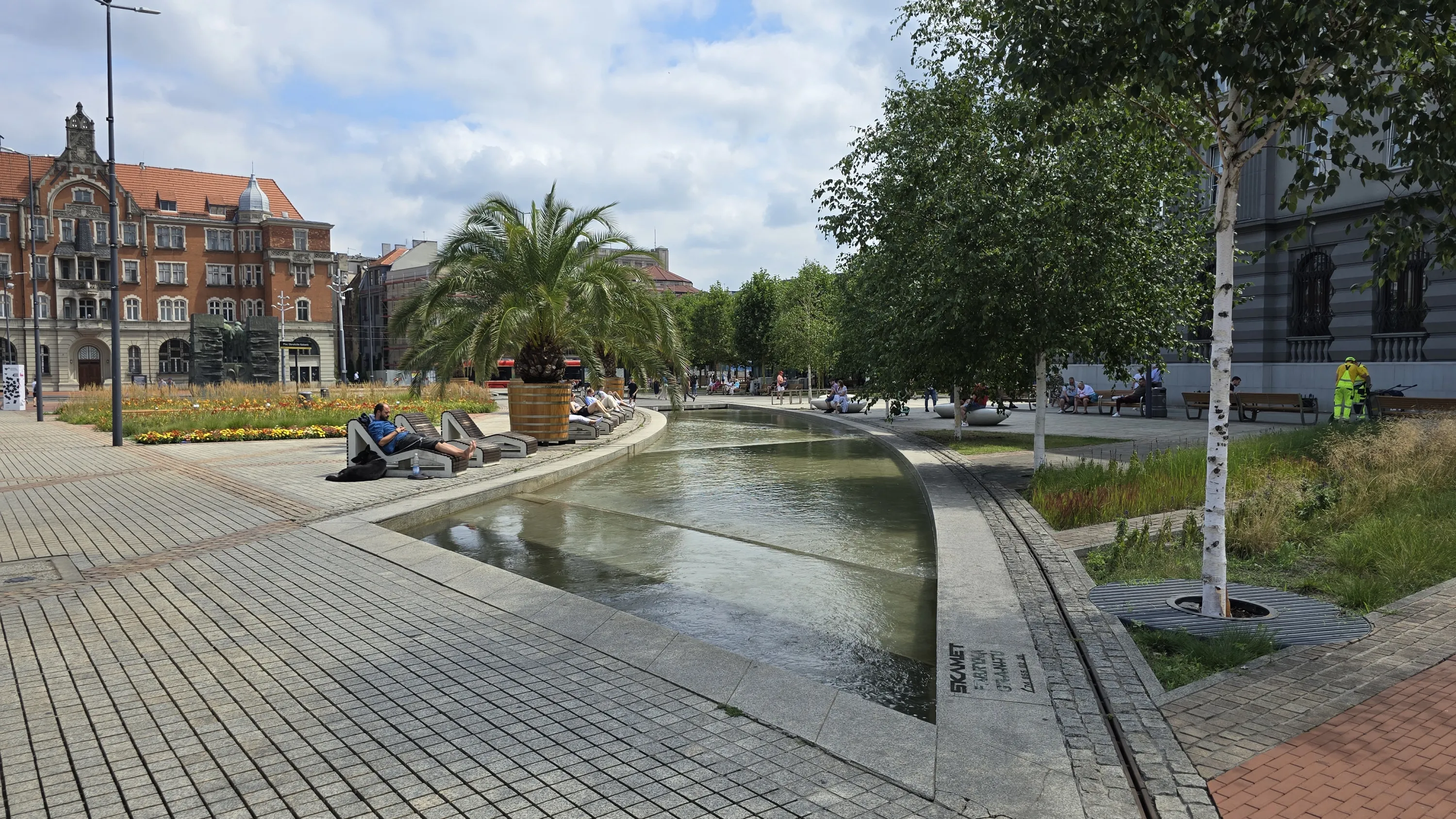 На площі є зона відпочинку з пальмами та каналами:
