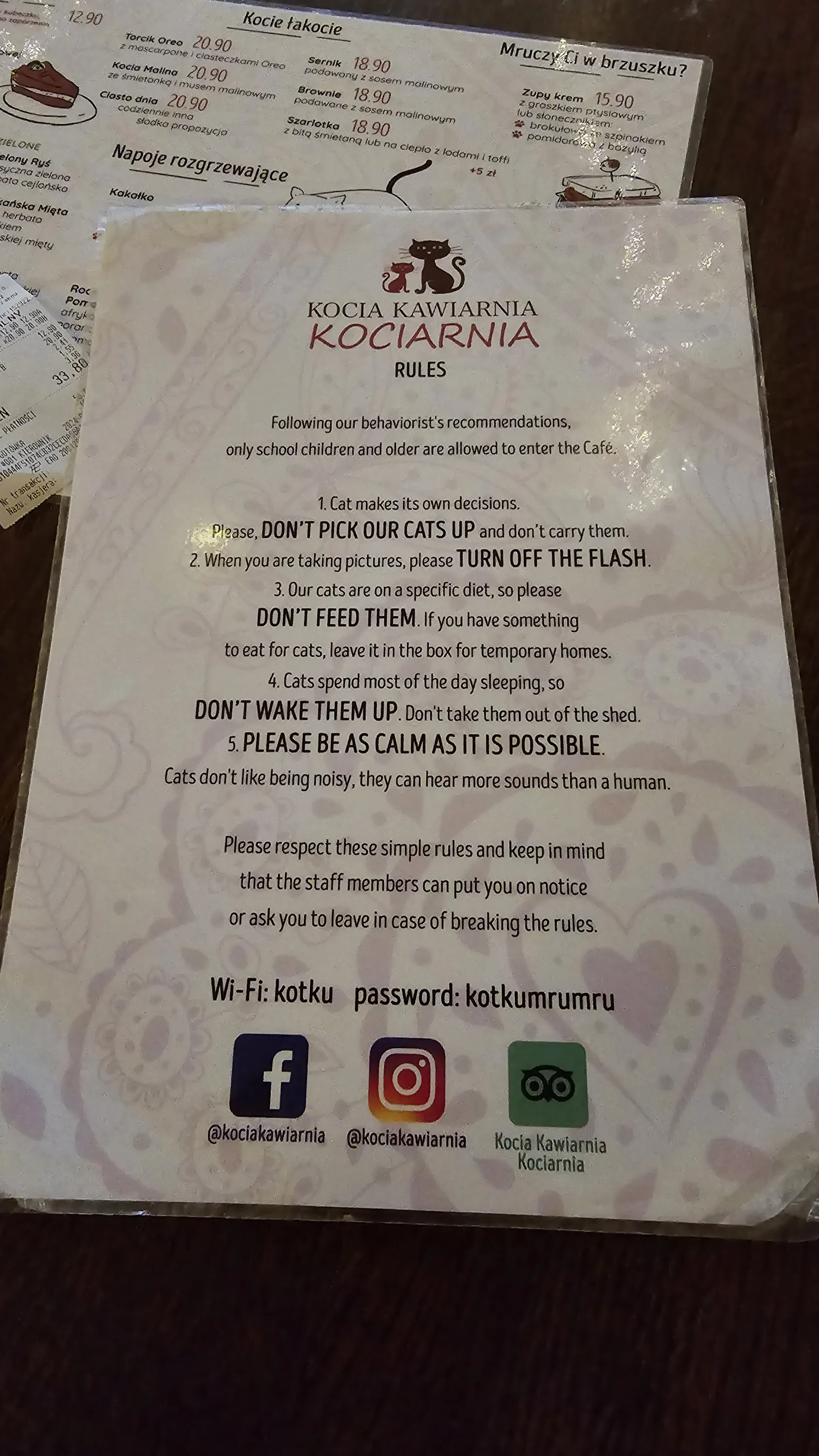 Пам’ятаєте, я в попередньому фотозвіті про Краків розповідав, що неподалік від Старого міста є котяча кав’ярня “Котярня”? Так от, я нарешті там побував. Я вже бував раніше в подібному закладі в Львові, тому для мене кафе з котами — тема не нова. Але як справжній “котячий батько” я просто не міг сюди не зайти 😸. Загалом від львівського Cat Cafe краківська “Котярня” не надто відрізняється, однак правила тут більш суворі. Наприклад, дітям дошкільного віку заборонено відвідувати заклад навіть в супроводі дорослих. Крім того, не можна брати котів на руки (просто гладити можна), при фотографуванні не можна використовувати спалах, не можна їх годувати, оскільки вони на особливій дієті, не можна їх будити, якщо вони сплять, а також по можливості радять не створювати зайвого шуму:
