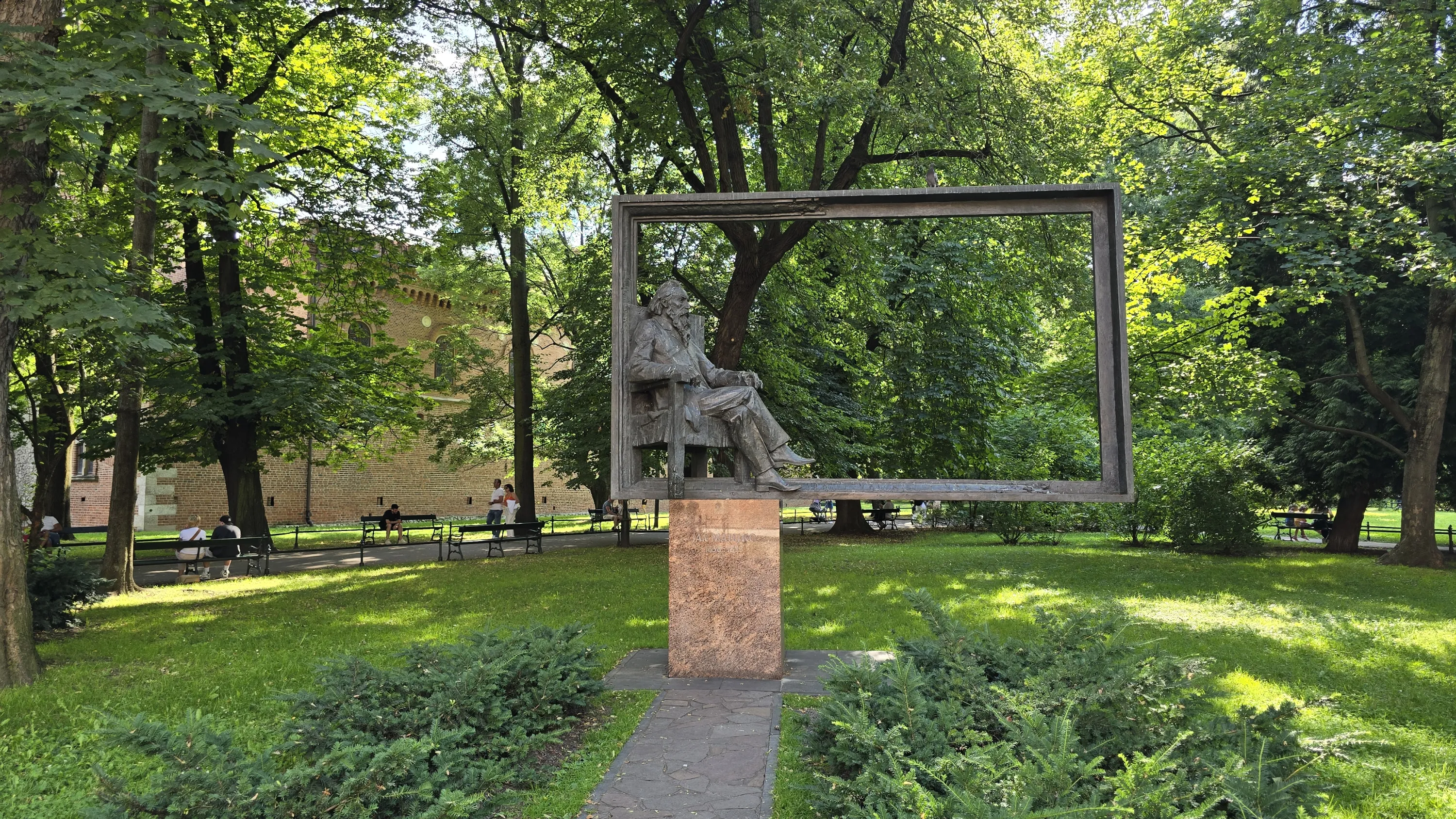 Біля Флоріанських воріт стоїть досить оригінальний пам’ятник Яну Матейко — польському художнику чеського походження родом з Кракова. Цей пам’ятник встановлено ще в 2013 році, тобто я ще під час свого першого візиту до Кракова в 2018-му мав би його побачити, досі дивуюсь, як я його не помічав раніше: