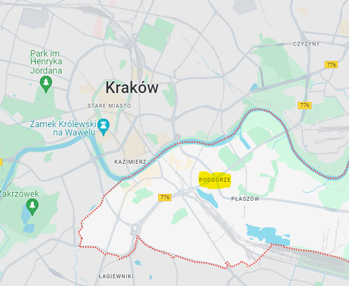 А зараз давайте перейдемо в південну частину міста, а саме в район Передгір’я (Подгуже) на лівому березі Вісли: