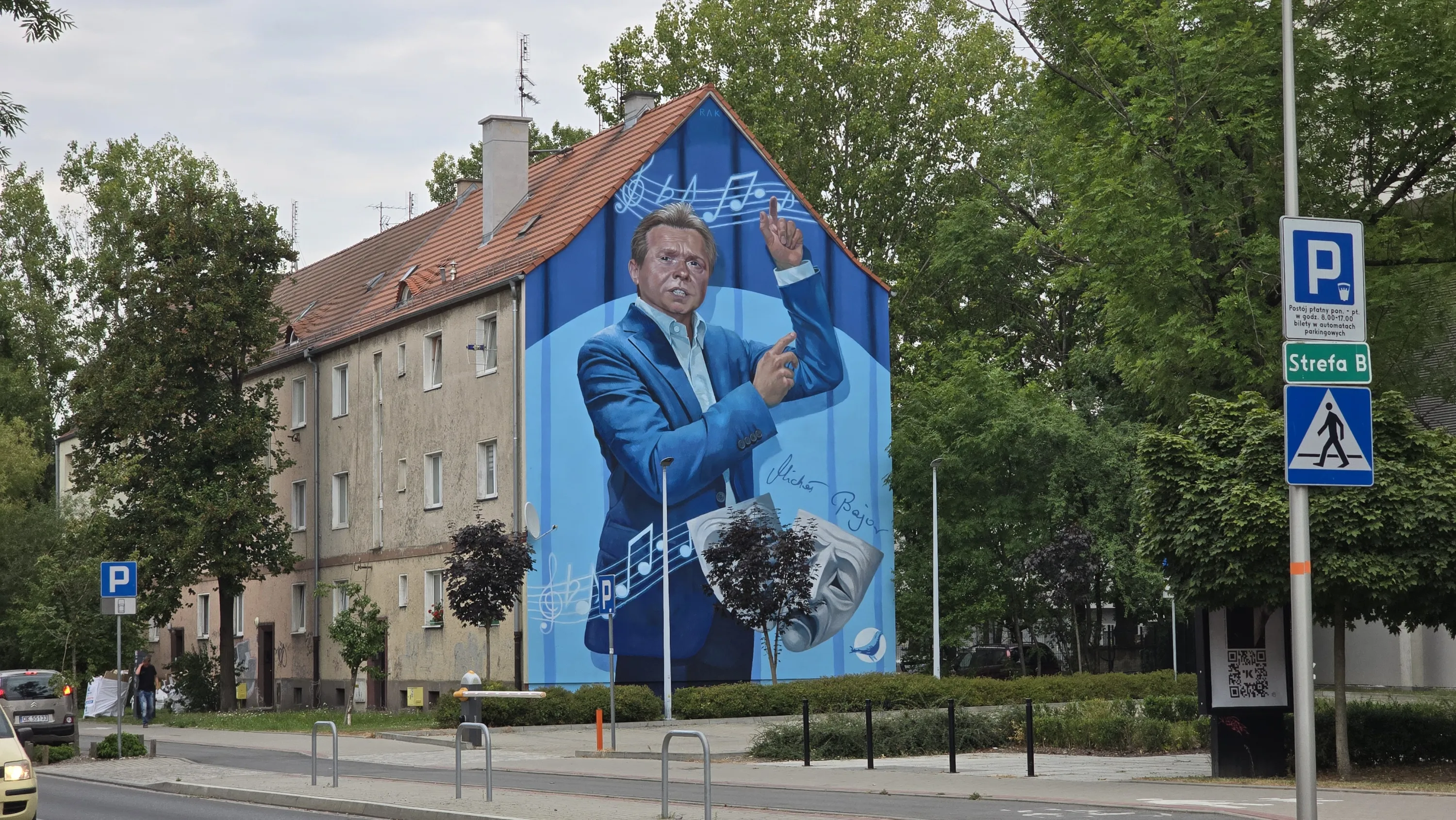 Оскільки Ополе вважається столицею польської пісні, тут на будинках час від часу можна побачити мурали на музичну тематику, як ось цей, наприклад. Тут зображений чоловік, який дуже нагадує Олександра Малініна, але це не він 😊, це польський музикант та актор Міхал Байор: