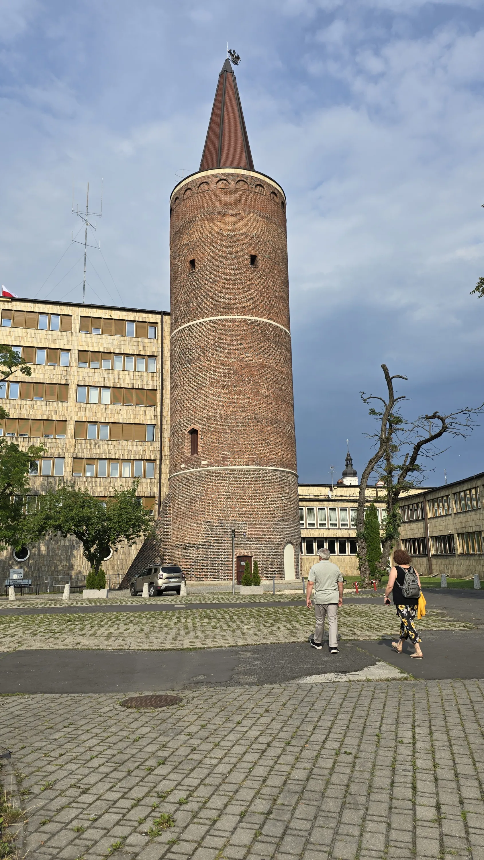 Навпоти нього знаходиться П’ястовська вежа — єдине, що залишилося від замку династії П’ястів, про який я згадував трохи вище. Замок було знесено десь в 1930 році, коло Ополе було частиною Німеччини. Вежу також планували знести, однак рішучий опір польської громади міста змусив німецьку адміністрацію відмовитися від її демонтажу: