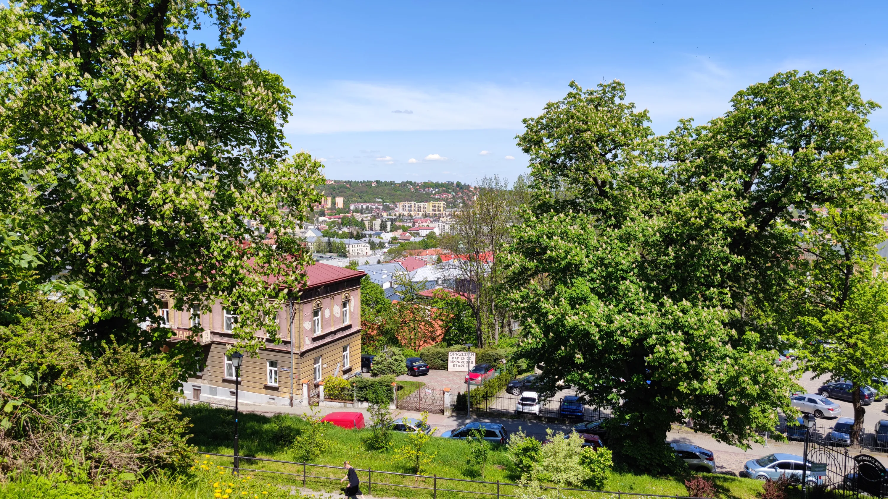 Звідси можна побачити місто зверху, правда, дерева трохи заважають: