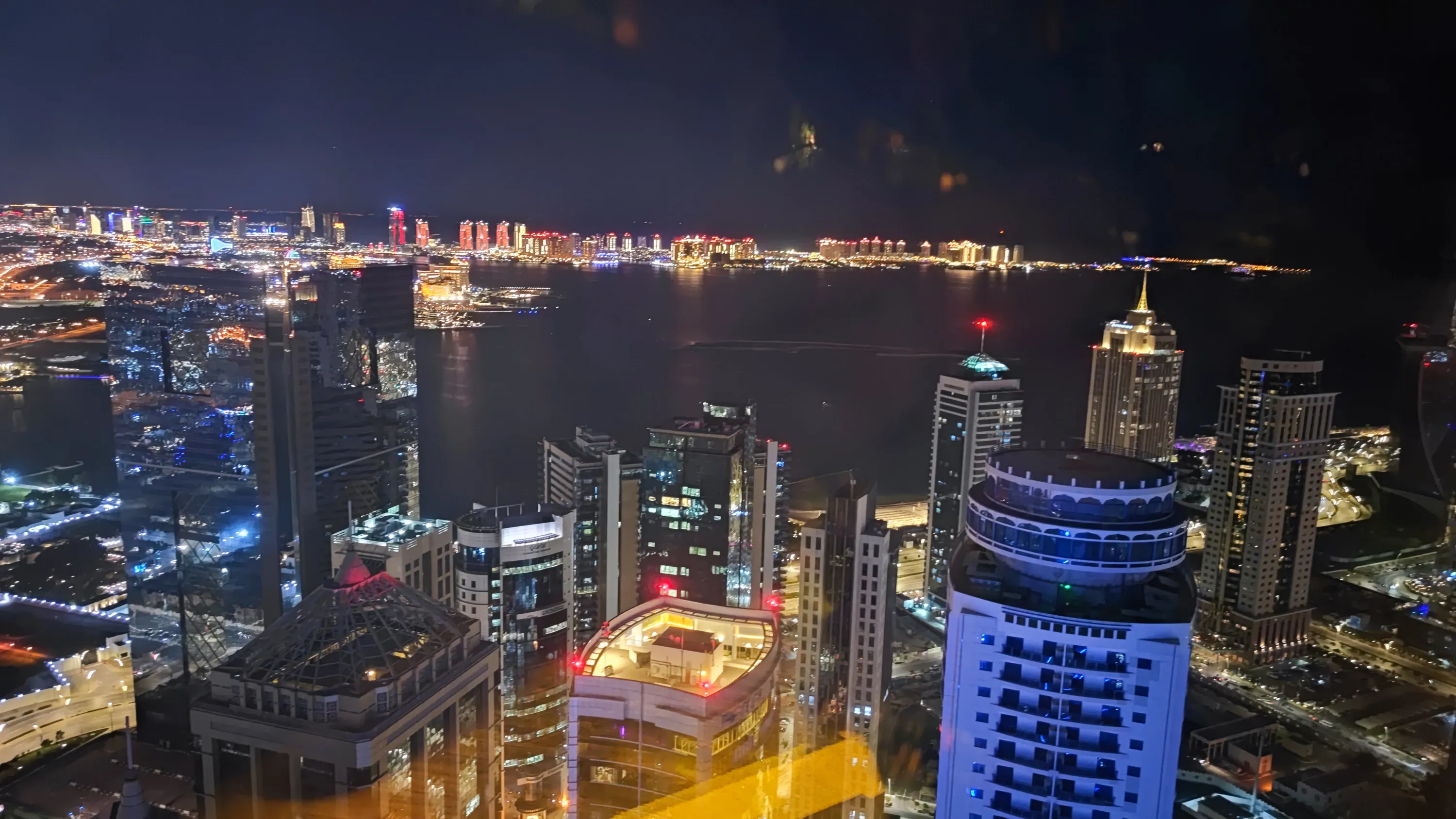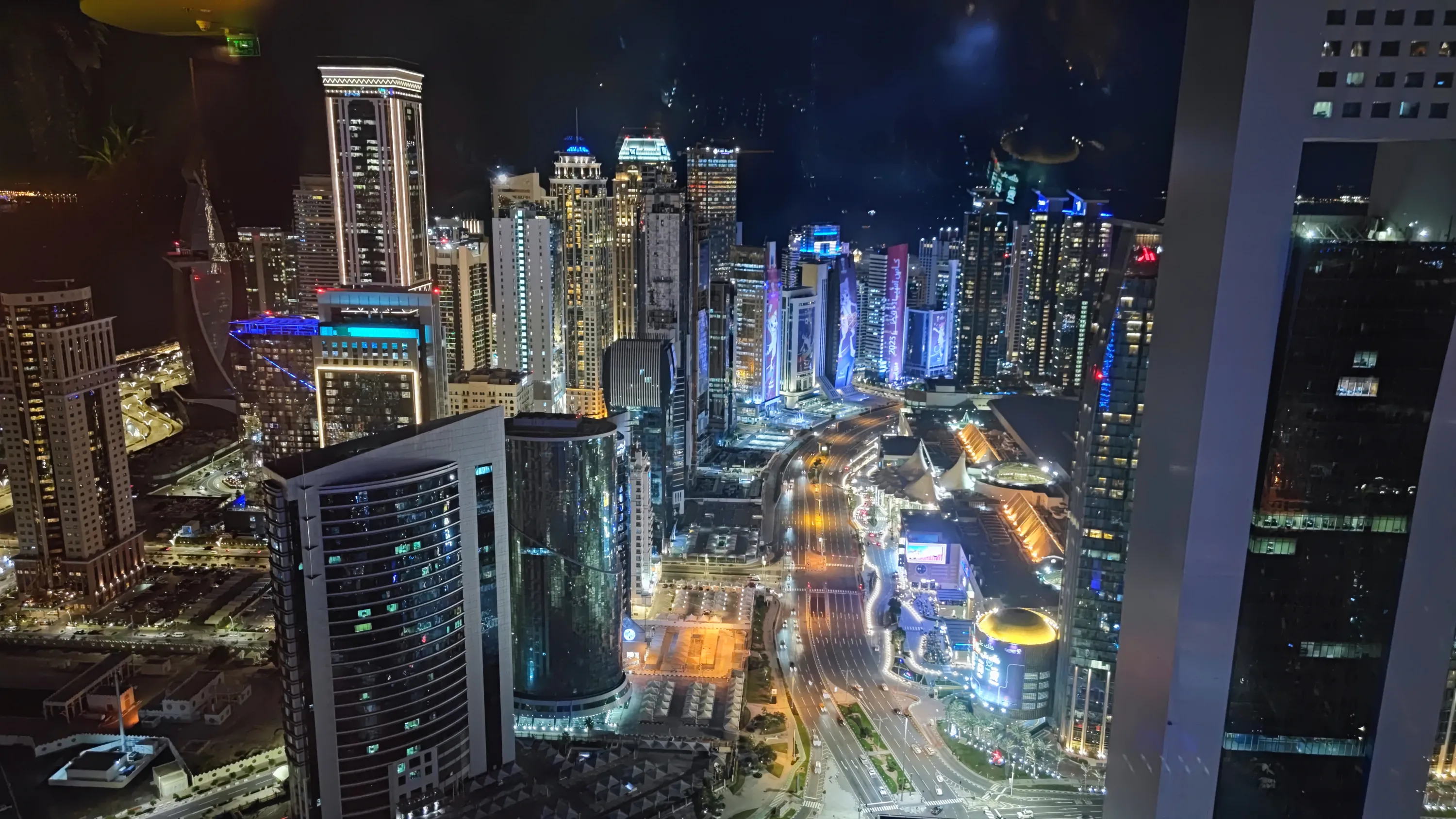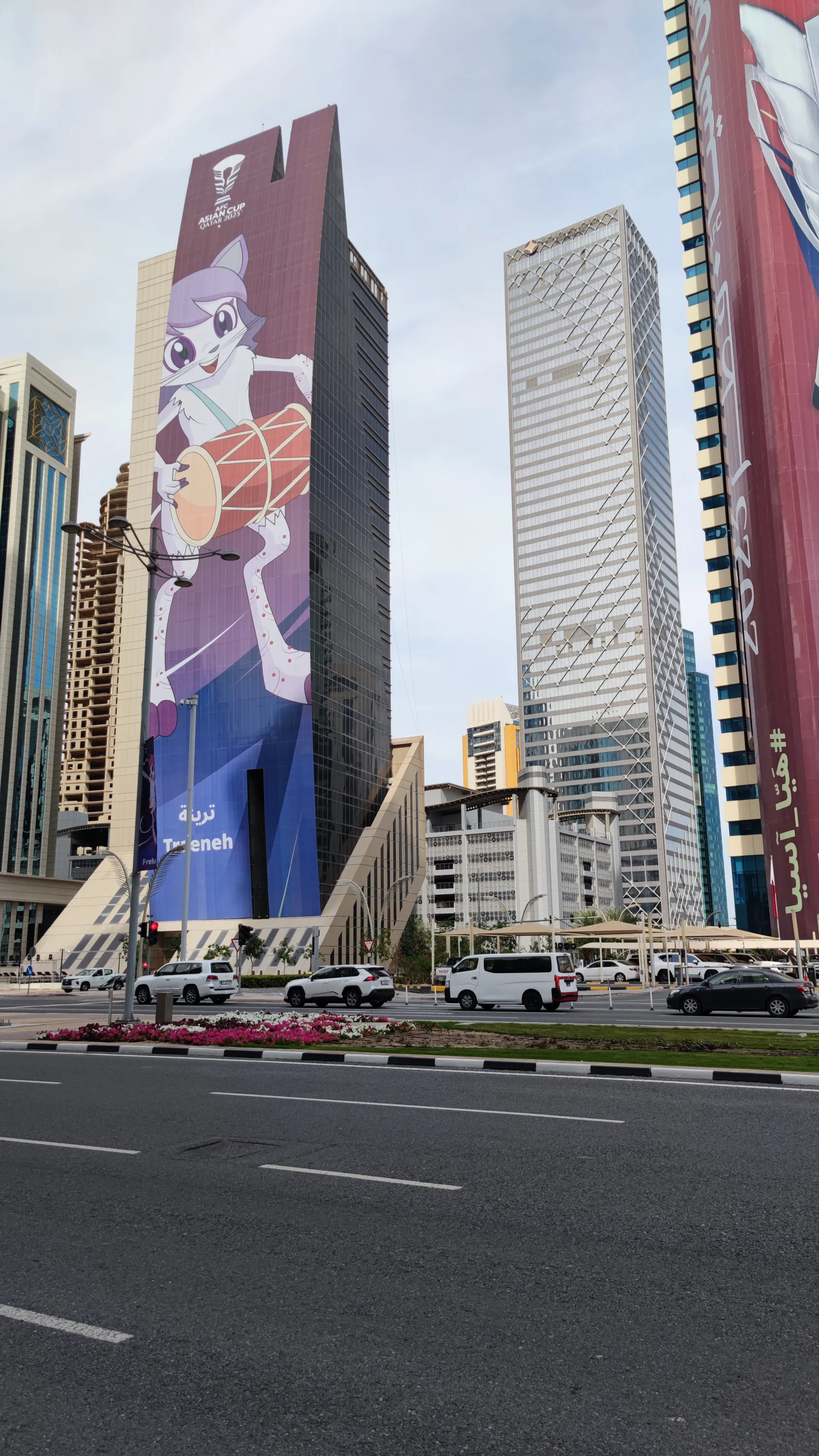 Хмарочоси вночі (до речі, зверніть увагу на інсталяції у вигляді м’ячів вздовж дороги — в Катарі проходить чемпіонат Азії з футболу):
