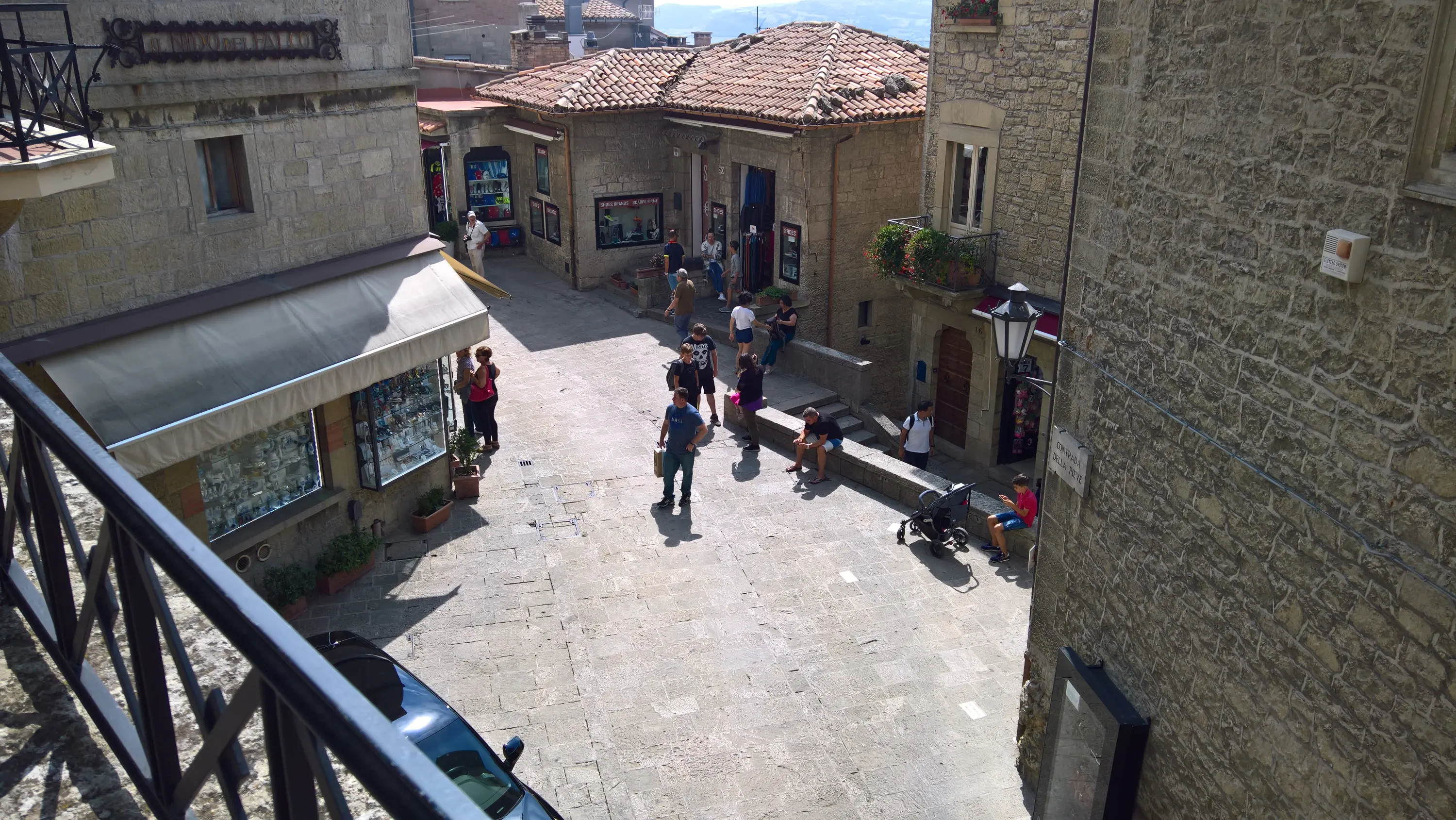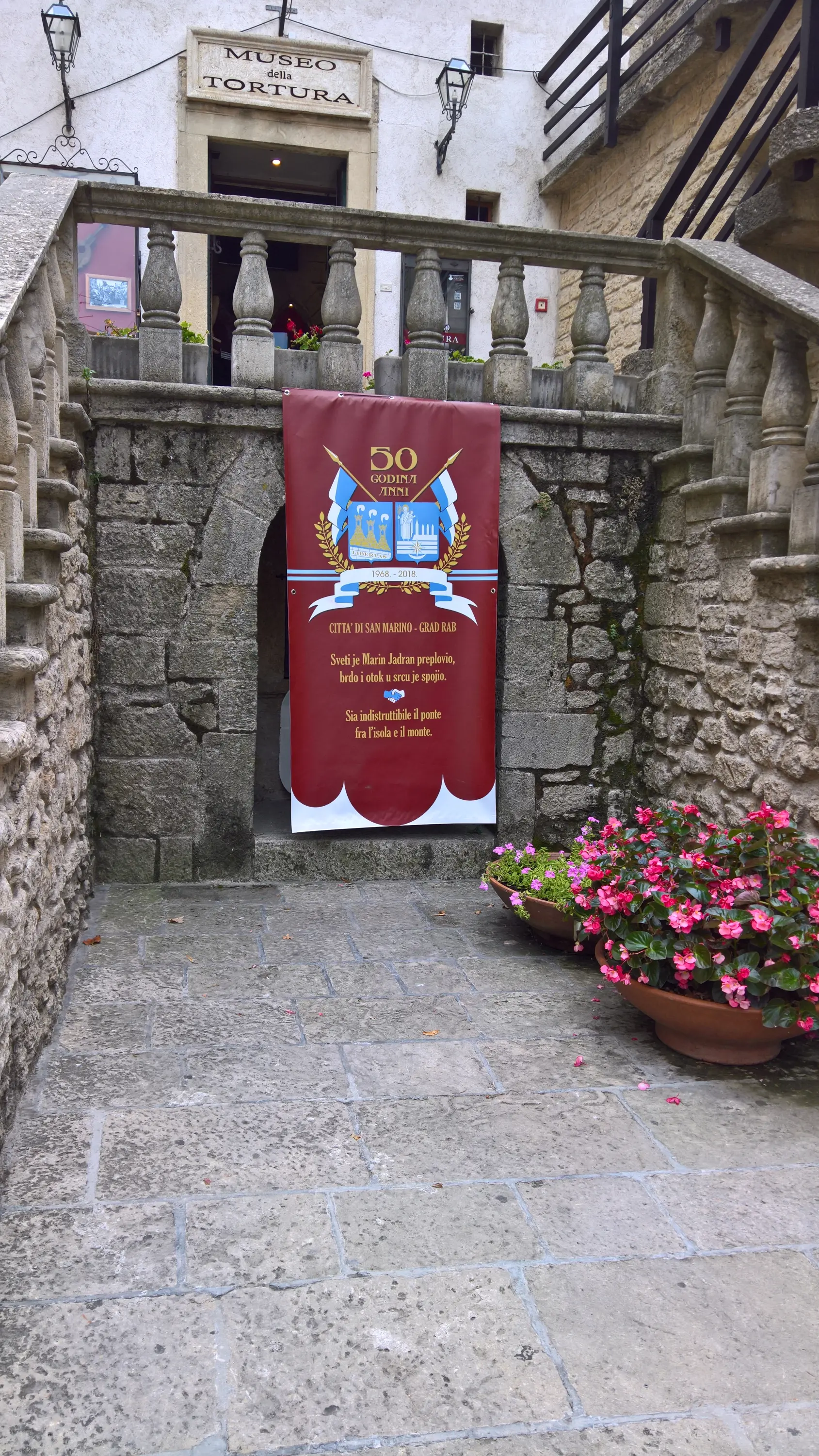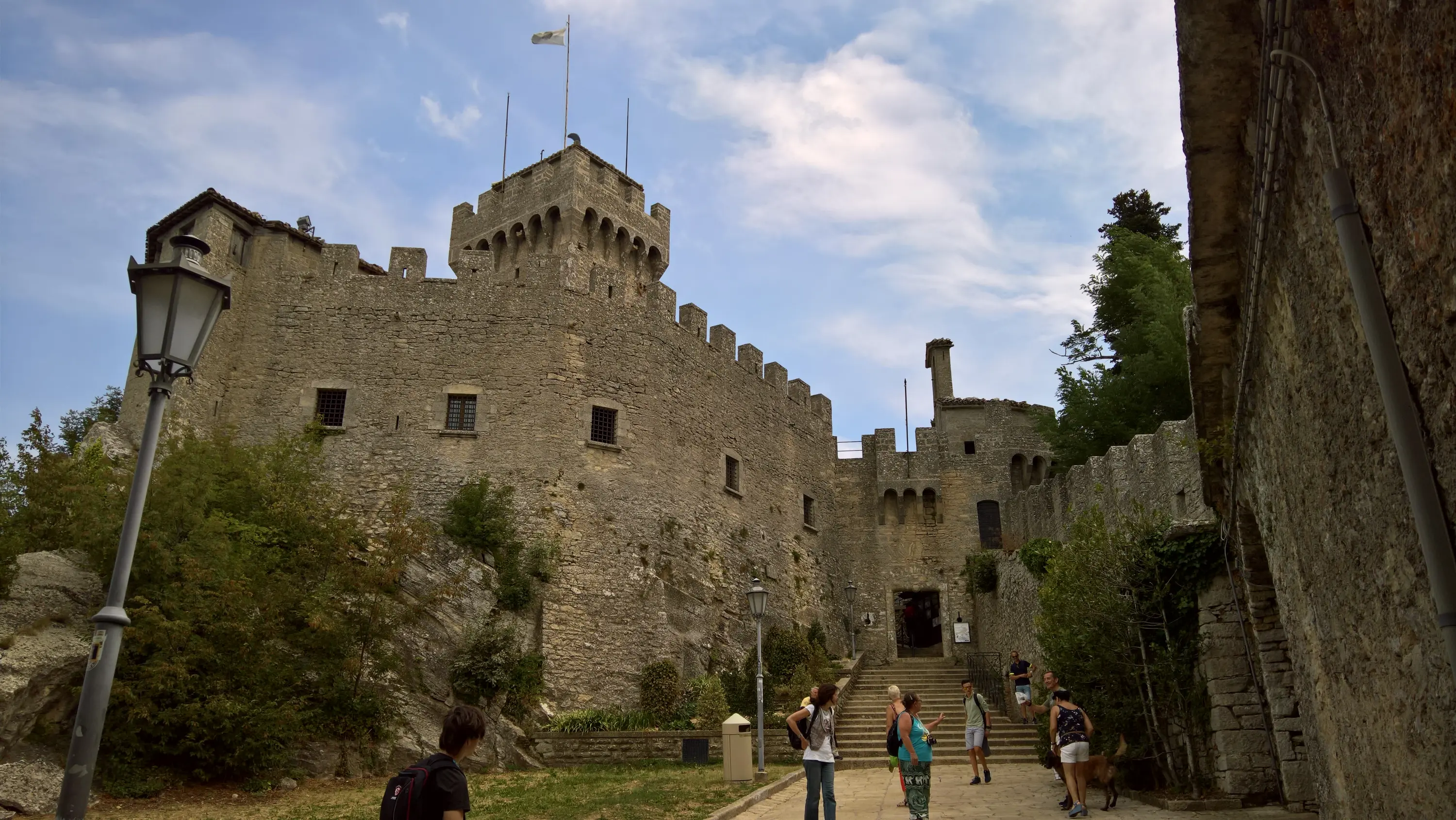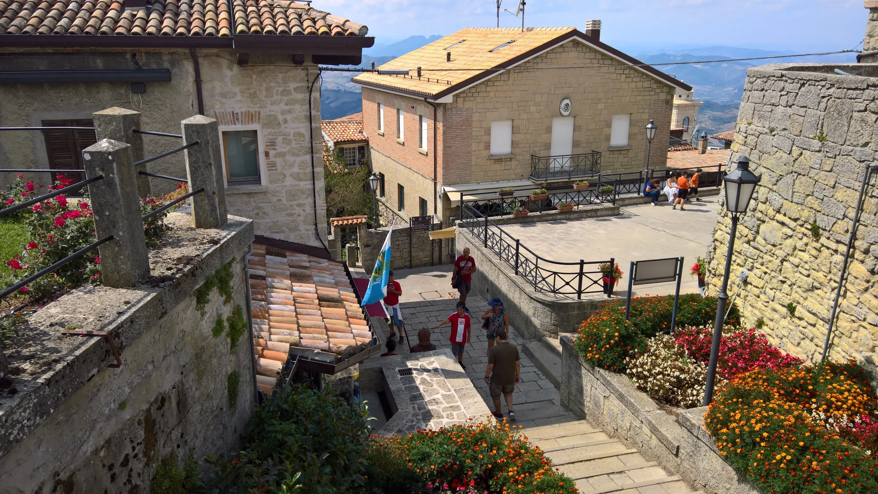 Сан-Марино є давньою республікою, історія якої бере свій початок в 301 році, коли муляр-християнин Марин втік на гору Титано в пошуках притулку від антихристиянського імператора Діоклетіана та заснував там громаду однодумців. Чесно кажучи, мене раніше завжди дивувало, як ця країна змогла дійти до наших часів у вигляді суверенної держави. Якщо, наприклад, в Монако є автохтонний народ – монегаски, який там є державотворчим (хоч їх там залишилось лише 20% населення), то в Сан-Марино корінним народом є по суті ті ж самі італійці. Але жителі Сан-Марино на повному серйозі ідентифікують себе як деяку окрему політичну націю, яка дуже пишається незалежністю своєї країни. До того ж, вони настільки люблять свою символіку, що навіть пішохідні переходи фарбують кольорами державного прапора: