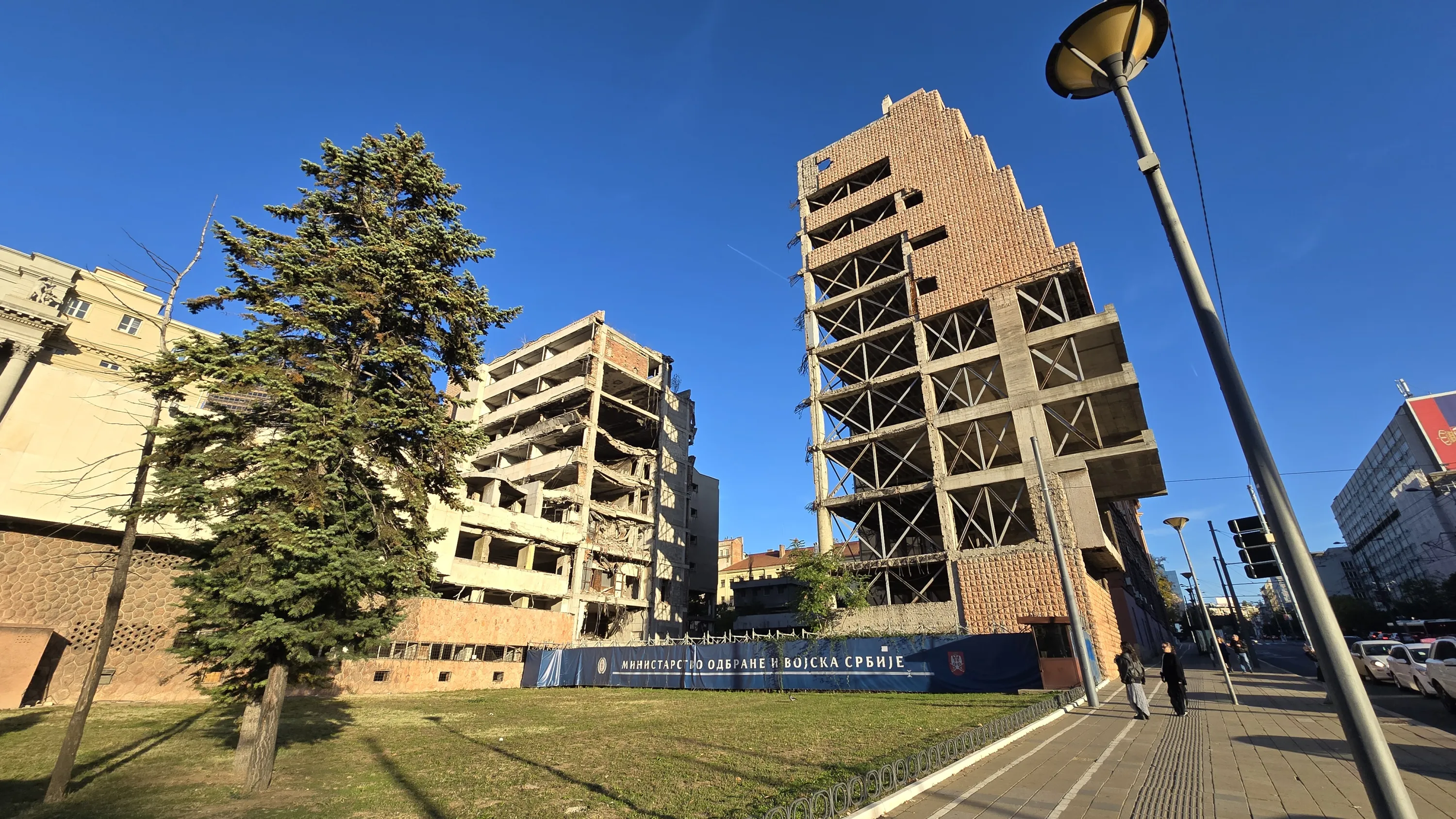 А ось вам і “ехо війни” — колишня будівля генштабу, зруйнована під час бомбардувань НАТО в 1999-му: