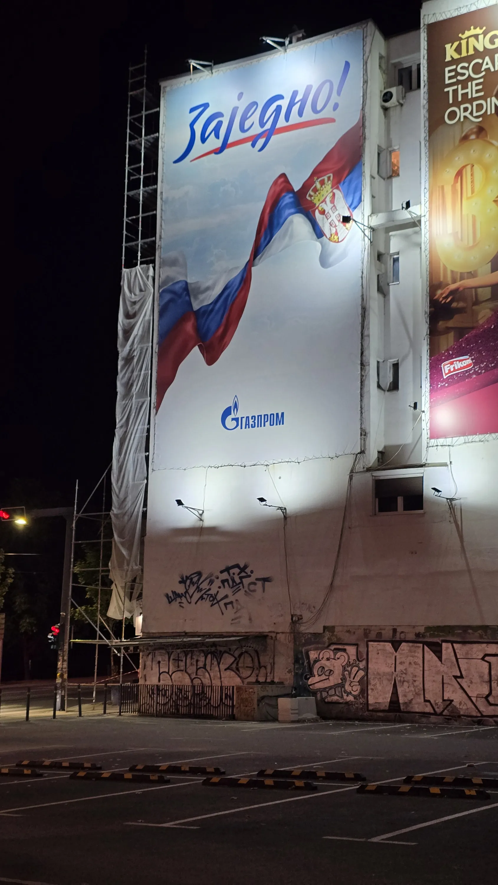 І прямо на цій площі черговий крінж (реклама “Газпрому” дуже вдало грає на тому, що якщо перевернути сербський прапор догори ногами — вийде російський):