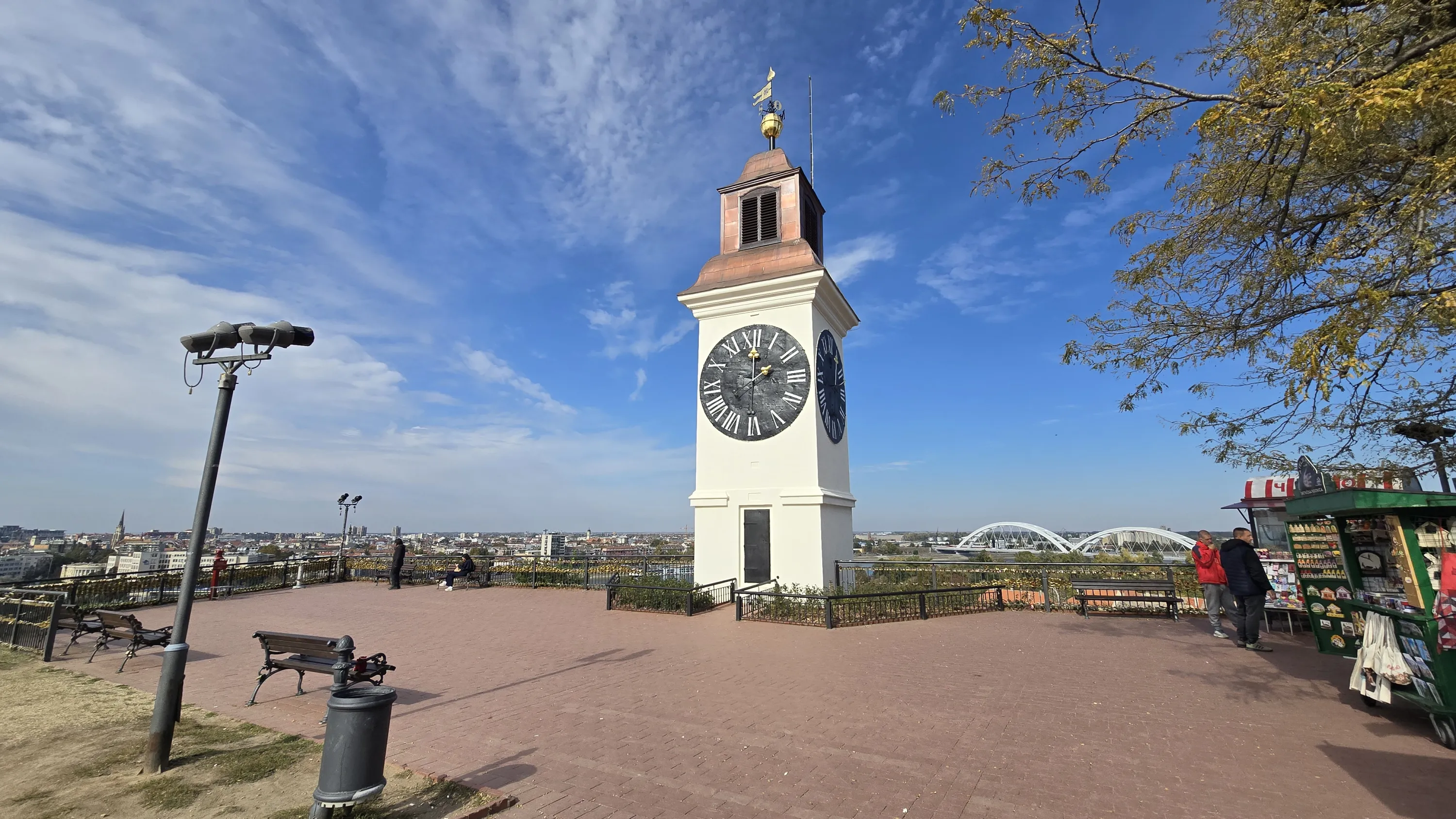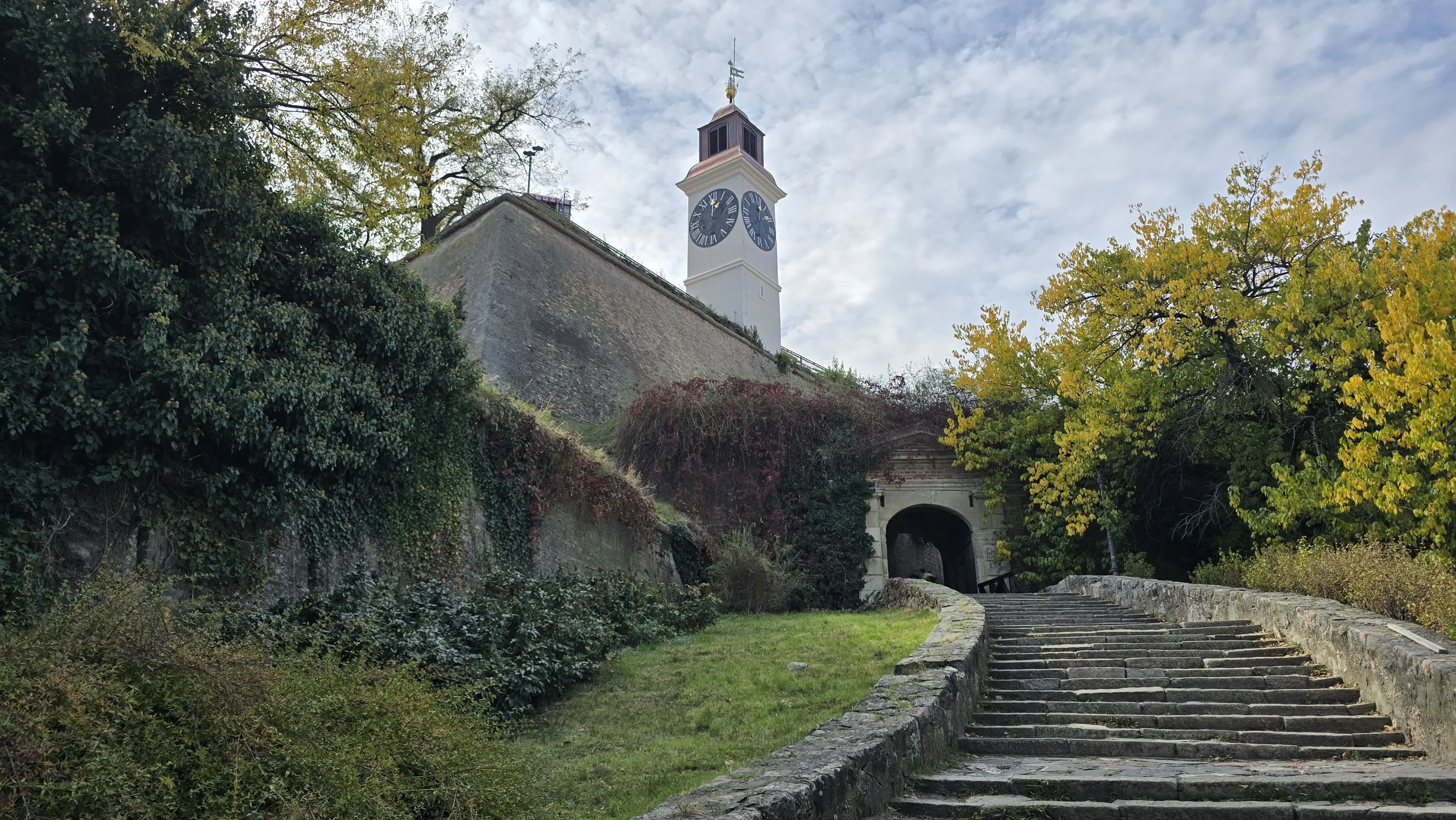 Одним з найцікавіших об’єктів фортеці є її годинникова вежа, яка має одну особливість. Ви ні за що не здогадаєтесь, в чому вона полягає, оскільки ось так по фото це дуже важко помітити. А полягає вона в тому, що велика стрілка на годиннику показує години, а маленька — хвилини, а не навпаки, як ми звикли. Ідея полягала в тому, щоб годинник було видно здалеку — з човнів на Дунаї та з протилежного берега. І оскільки для простих людей важливіше було знати, яка зараз година, а не точну кількість хвилин, вирішили зробити так, щоб стрілка, що показує години, була довшою, щоб її було краще видно. Тобто на даній світлині годинник показує не 14:00, а 12:10: