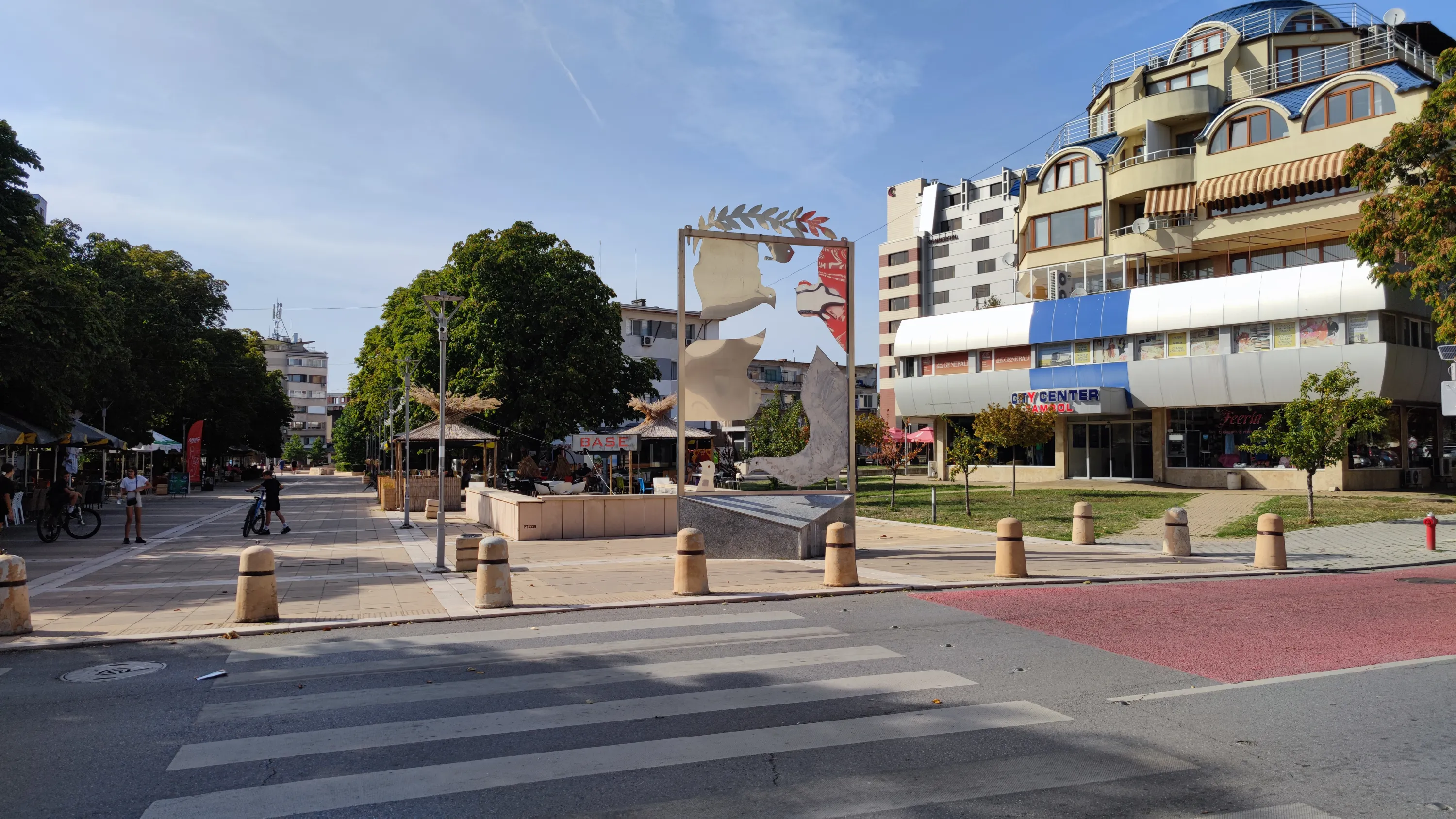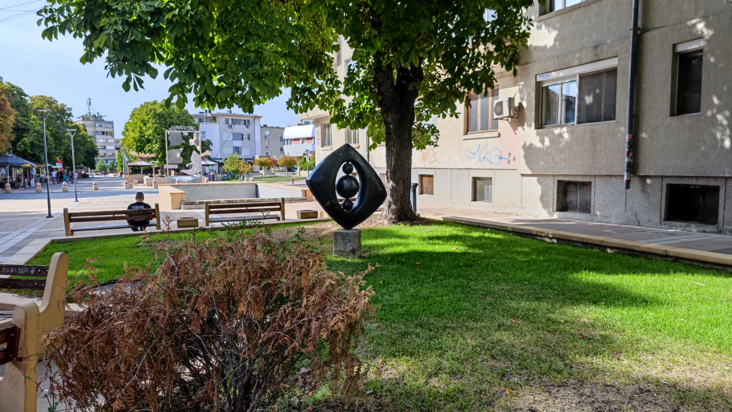 Центральна площа міста, на якій розташована будівля міської ради. Перед нею — фонтан, по кутках від якого встановлені таблички з попередніми назвами Ямбола: