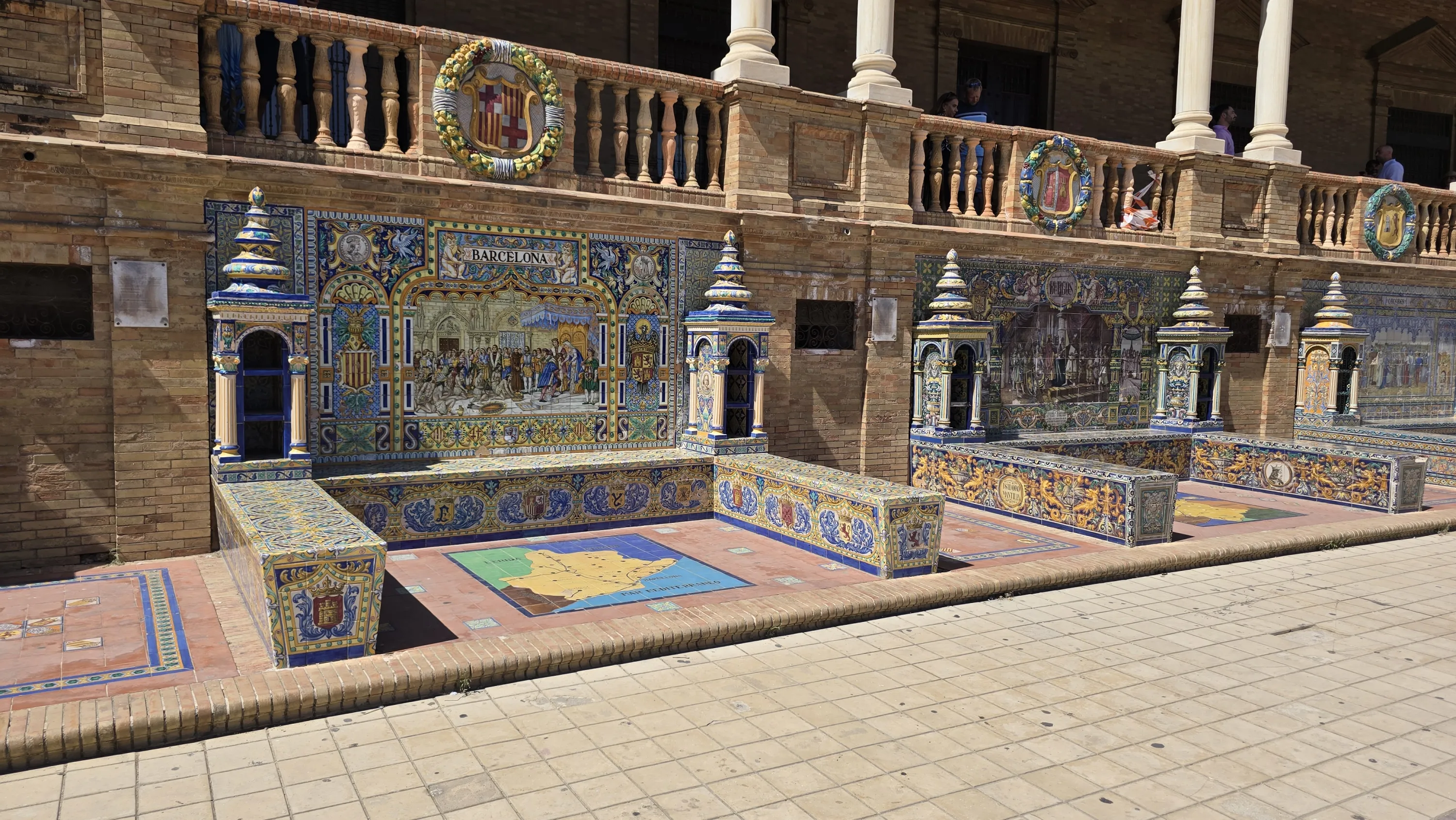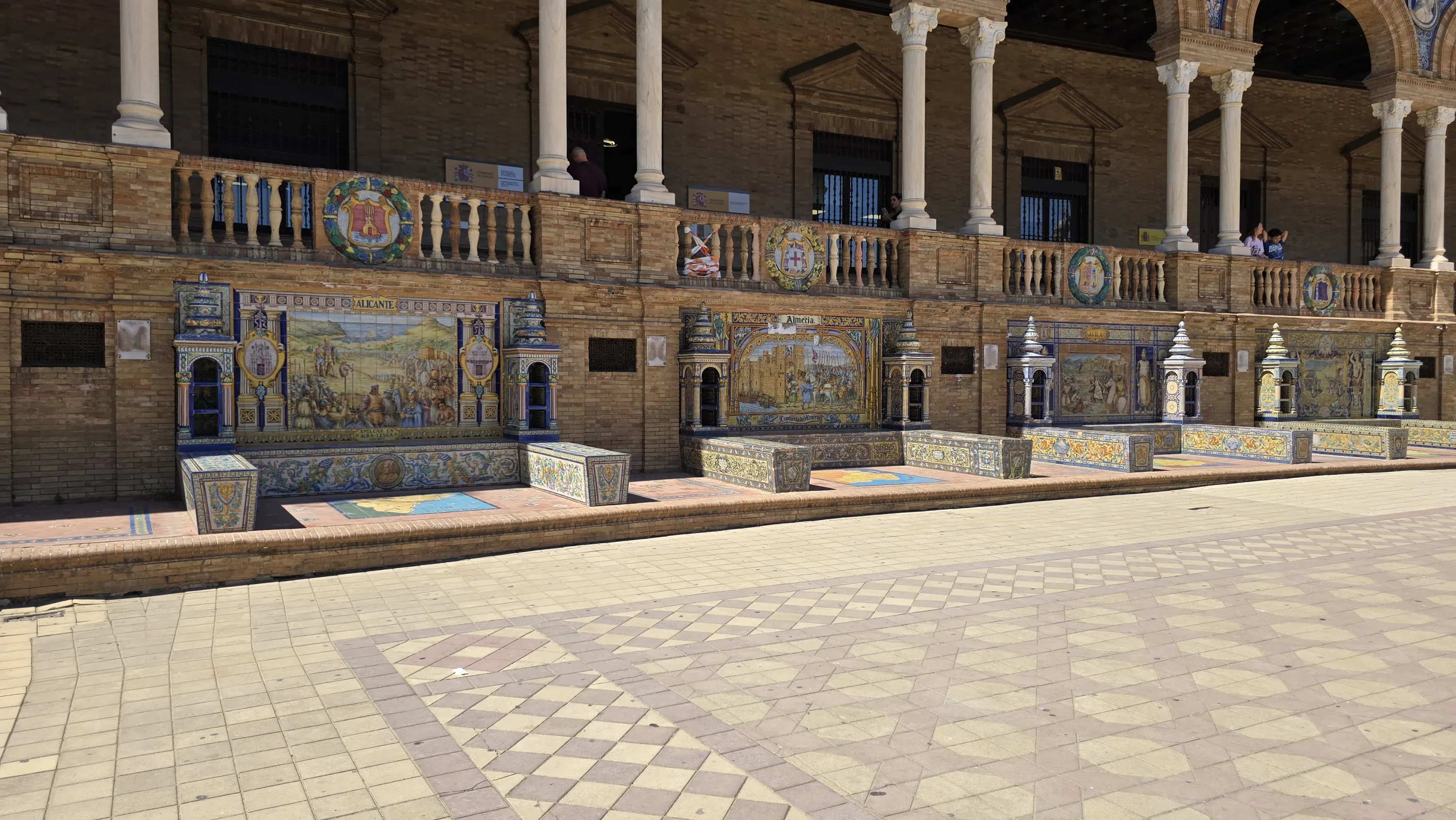На передньому плані лавки з мозаїкою, присвячені різним містам Іспанії:
