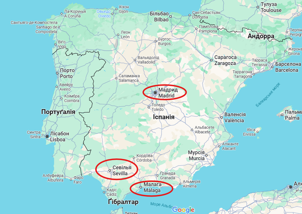 І ось я дістався Іспанської столиці, де на мене чекав ще один мій товариш і колега. Від Севільї до Мадрида поїздом їхати близько двох з половиною годин. І знаєте, що найцікавіше? Подивіться на карту, де знаходиться Малага, де Севілья і де Мадрид: