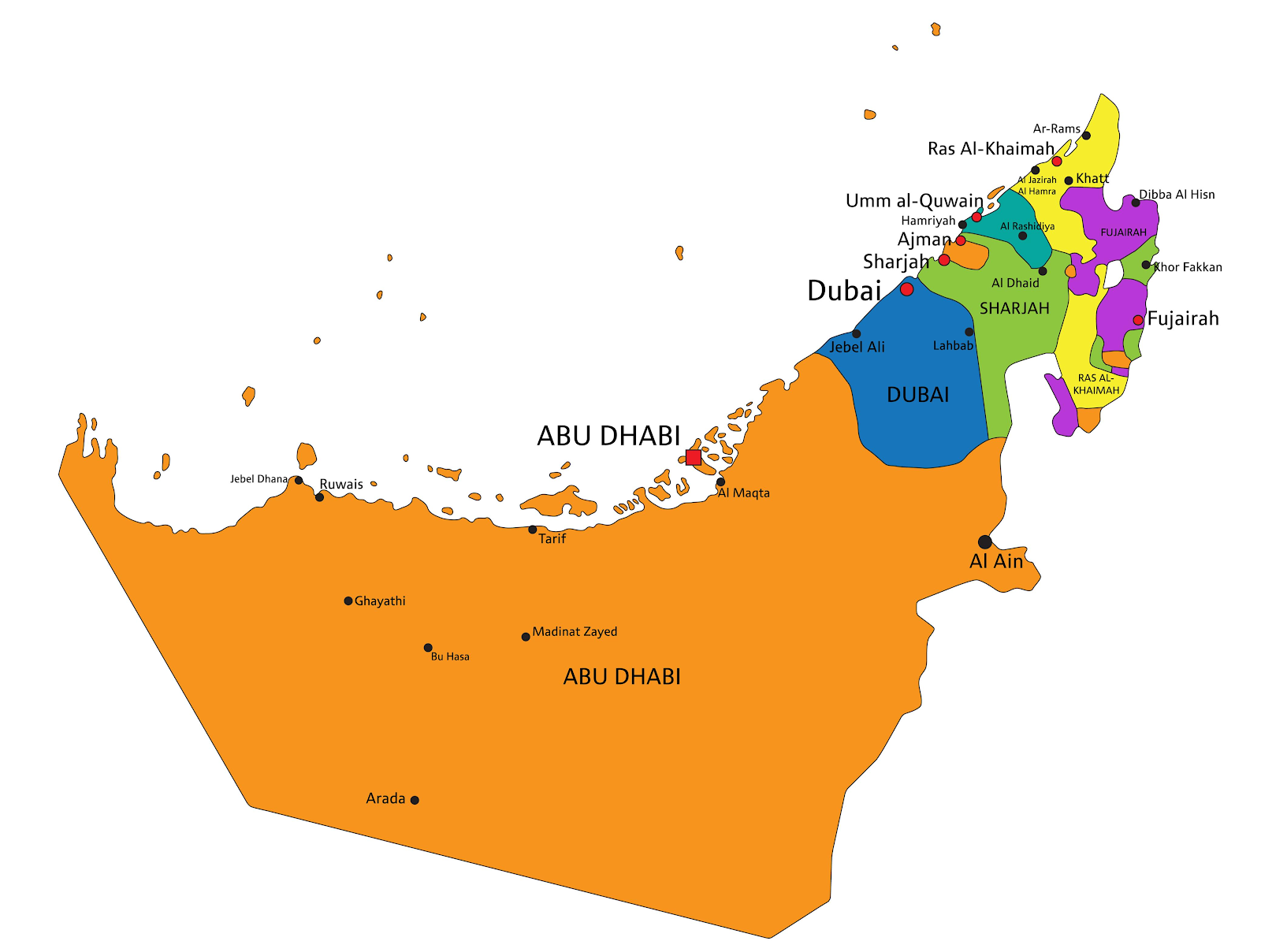 ОАЕ — це федерація абсолютних монархій, яка складається з семи еміратів — Абу-Дабі, Дубай, Шарджа, Аджман, Ум-Ель-Кувейн, Рас-Ель-Хайма та Фуджейра: