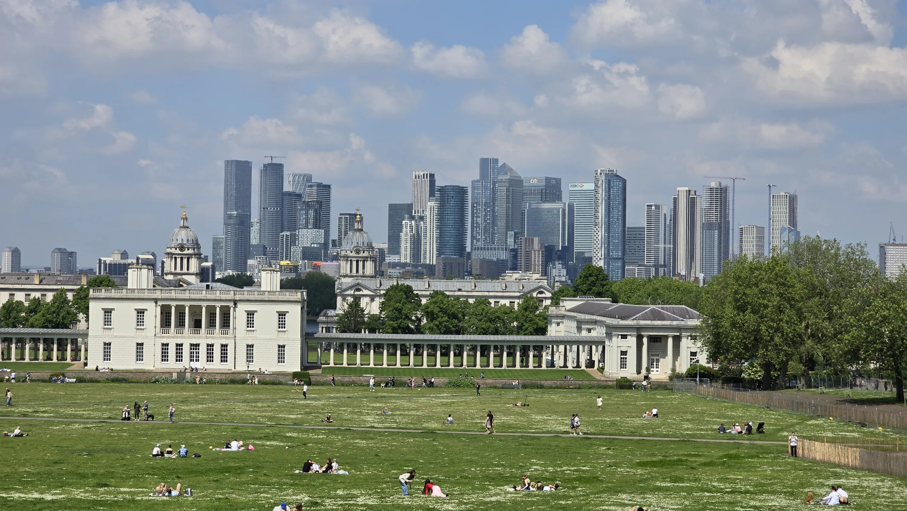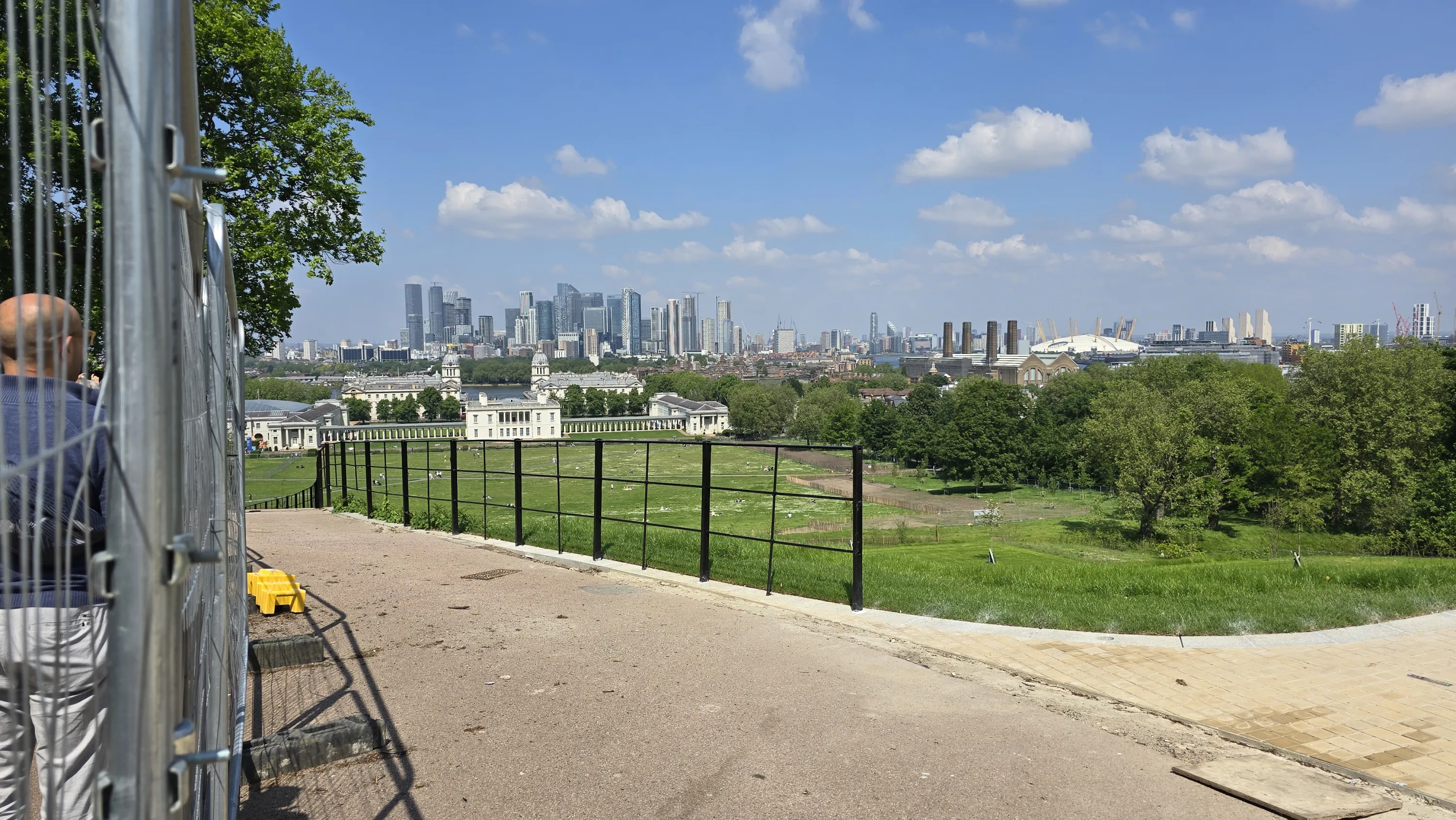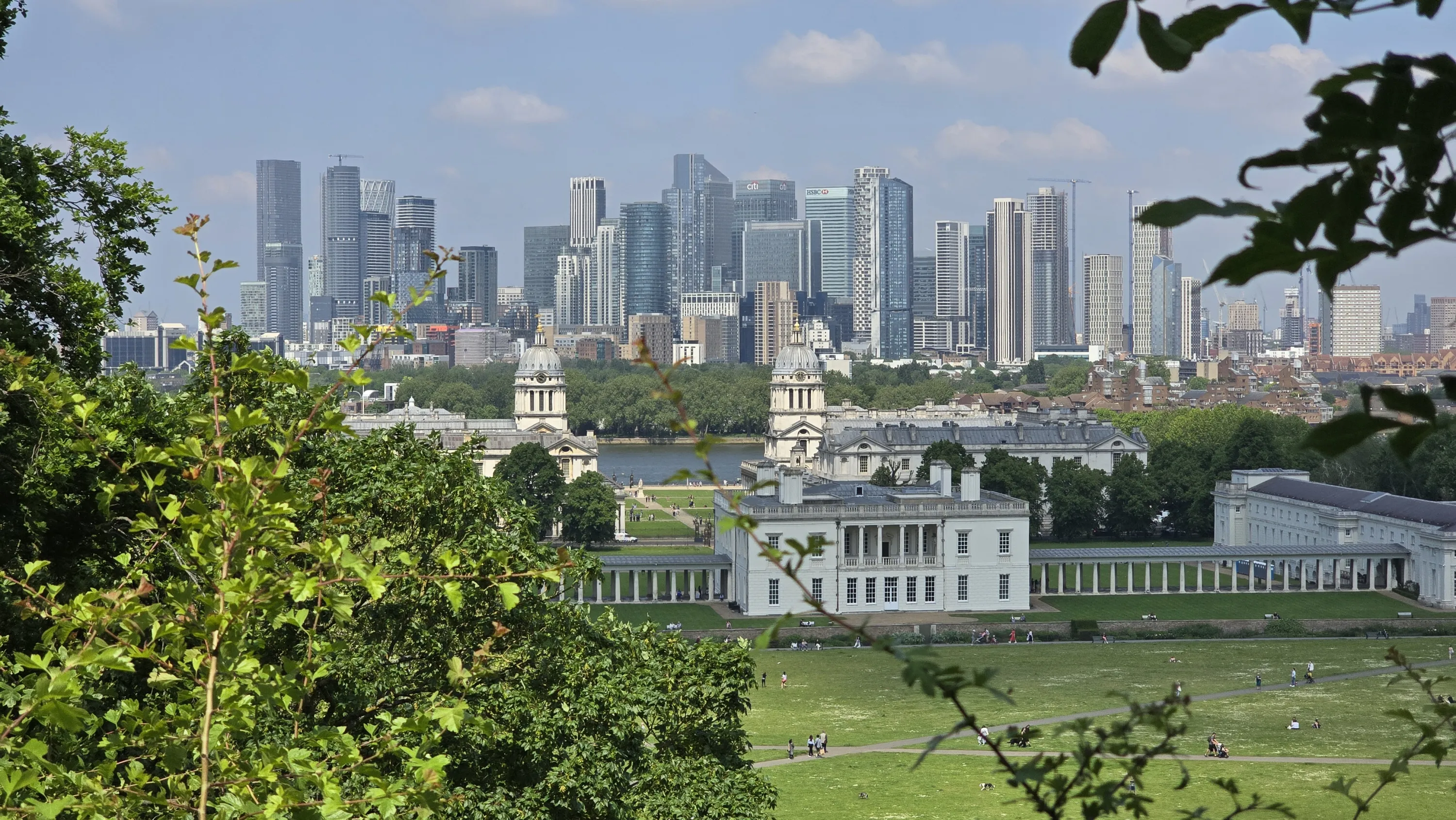 Внизу видно Гринвіцький парк, комплекс симетричних будівель перед ним — морський музей, а на горизонті видніються хмарочоси Canary Wharf: