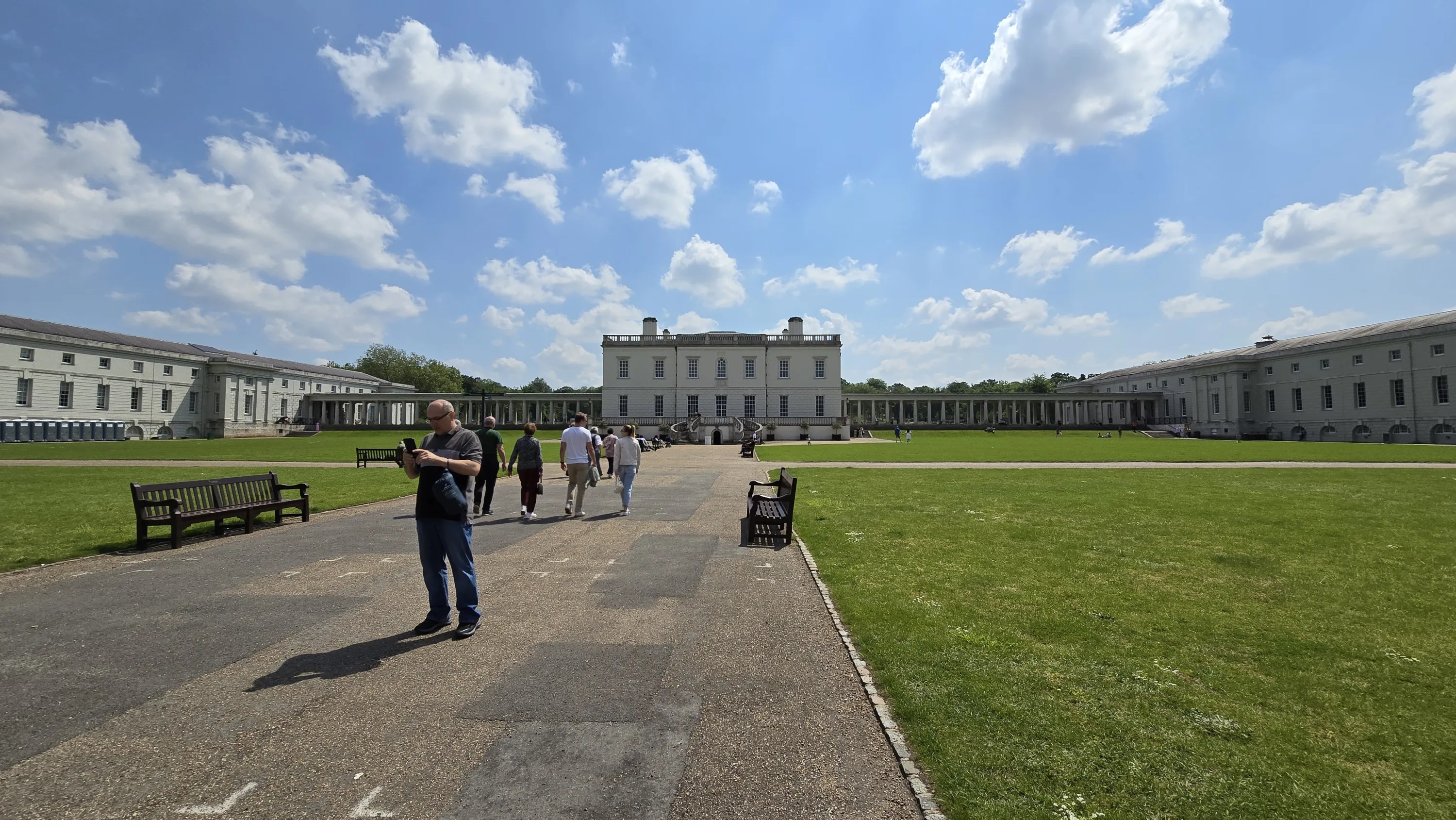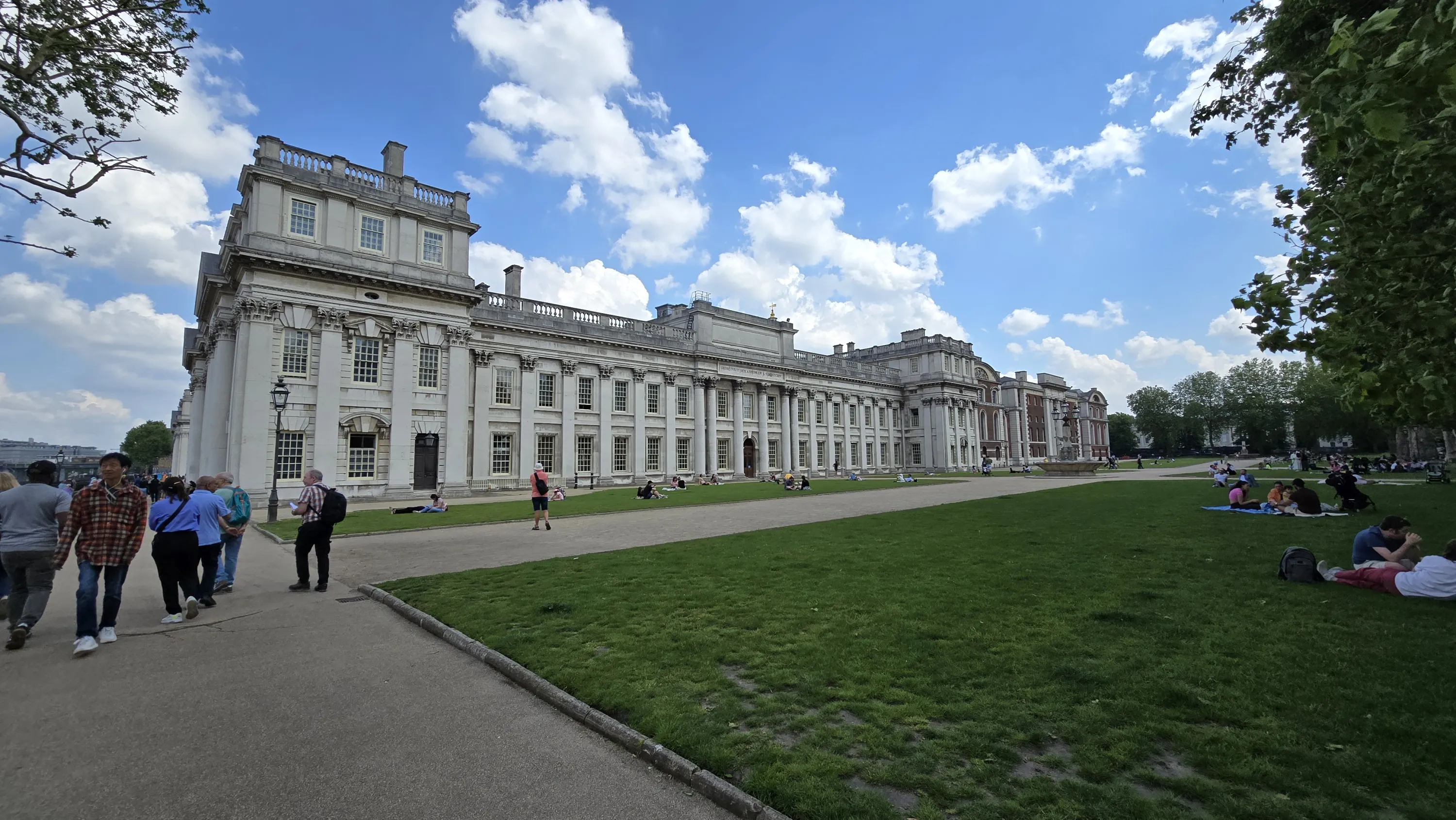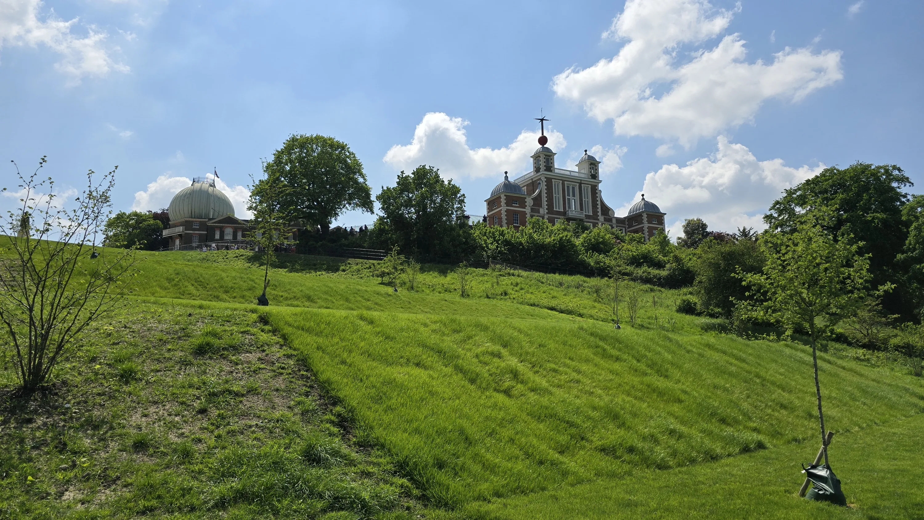 Внизу видно Гринвіцький парк, комплекс симетричних будівель перед ним — морський музей, а на горизонті видніються хмарочоси Canary Wharf: