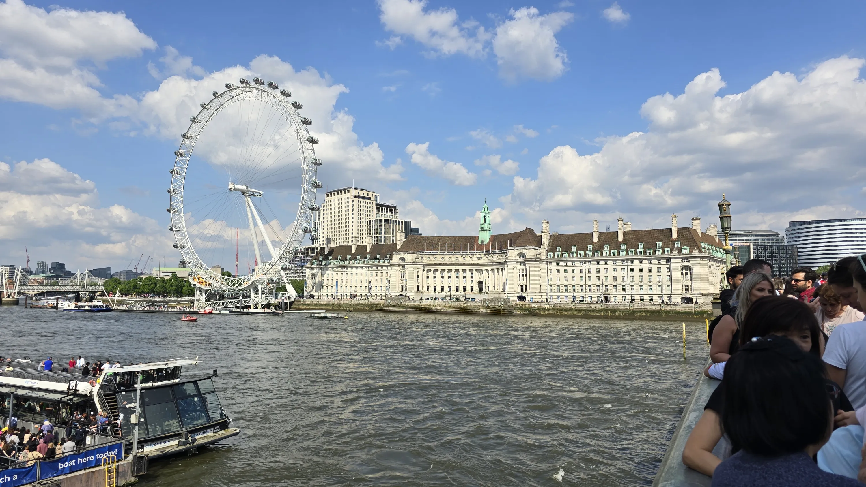 На протилежному березі Темзи можна побачити оглядове колесо London Eye. Я на ньому не катався, оскільки 50 фунтів — якось невиправдано дорого для подібних атракціонів. Біла будівля справа від нього — колишній будинок місцевої влади Лондона: