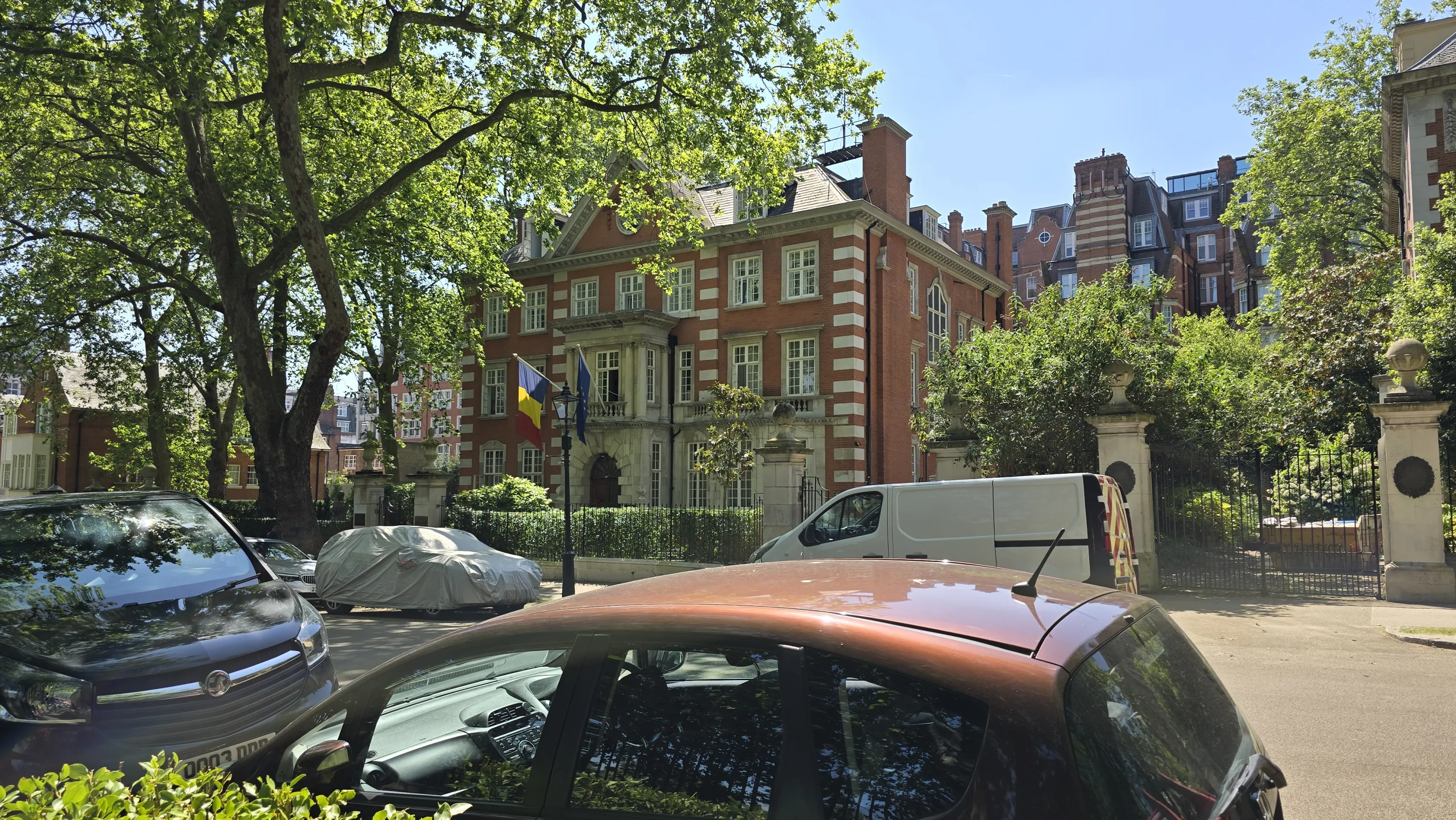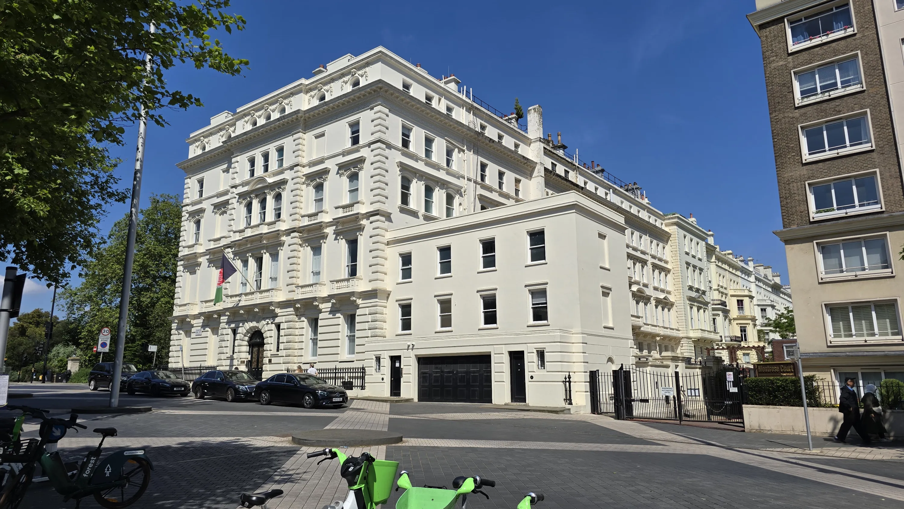 Посольство Афганістану. Зверніть увагу, що на ньому старий прапор — той, що був до захоплення влади талібами (Велика Британія не визнає уряд талібів легітимним). Тобто на рівні дипломатичних представництв уряд Ашрафа Гані все ще продовжує політичну діяльність. Воно й не дивно, під час іракської окупації Кувейту його посольства за кордоном також продовжували працювати: