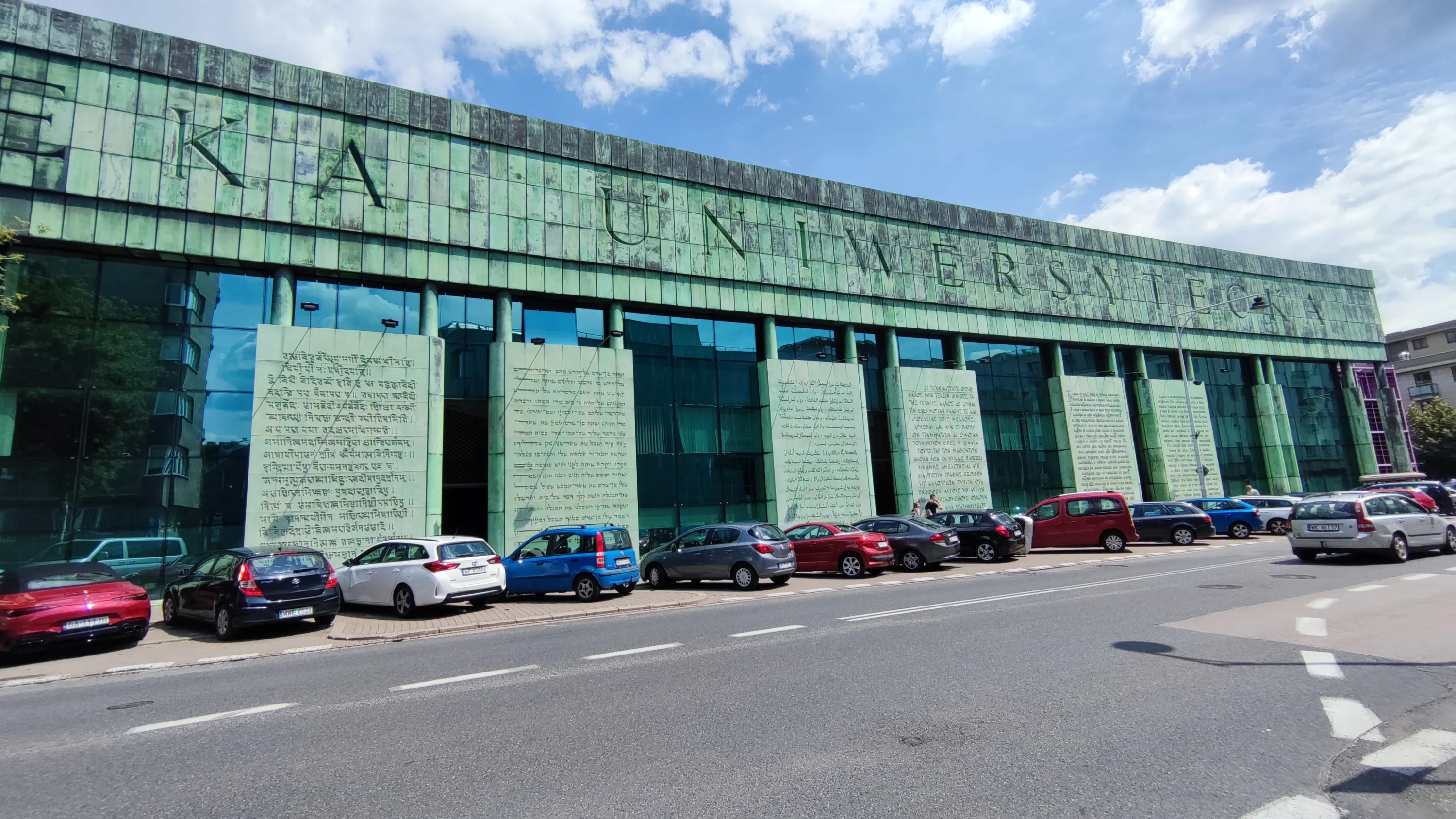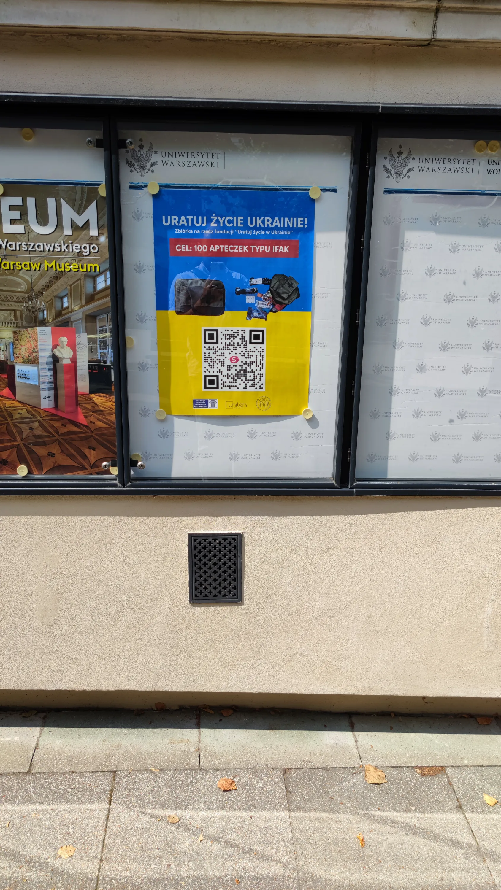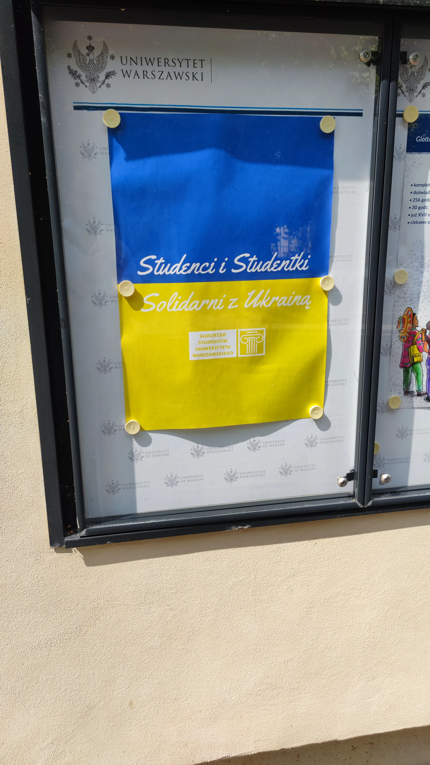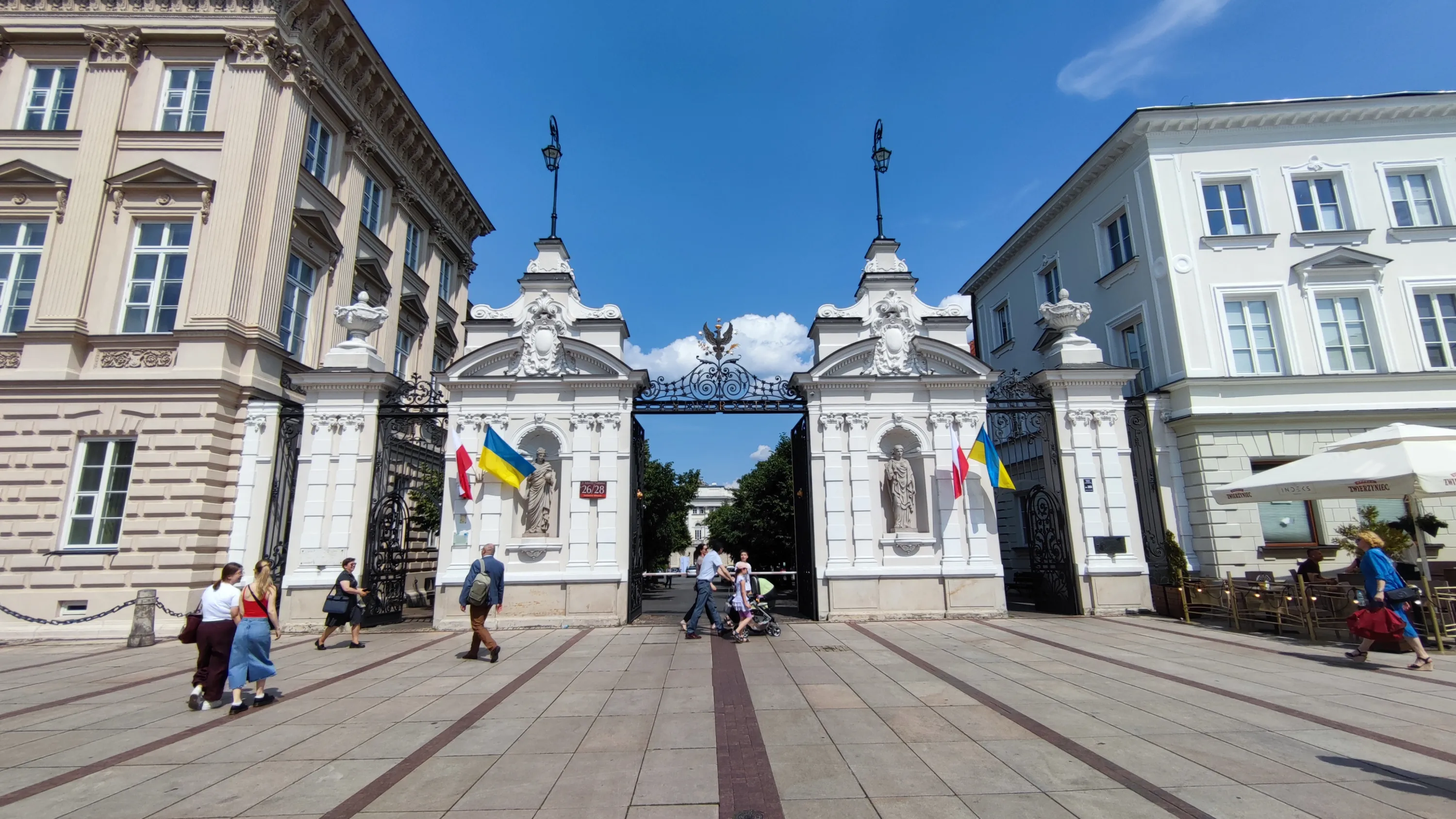 Ворота Варшавського університету, поряд з польськими прапорами розвішані українські: